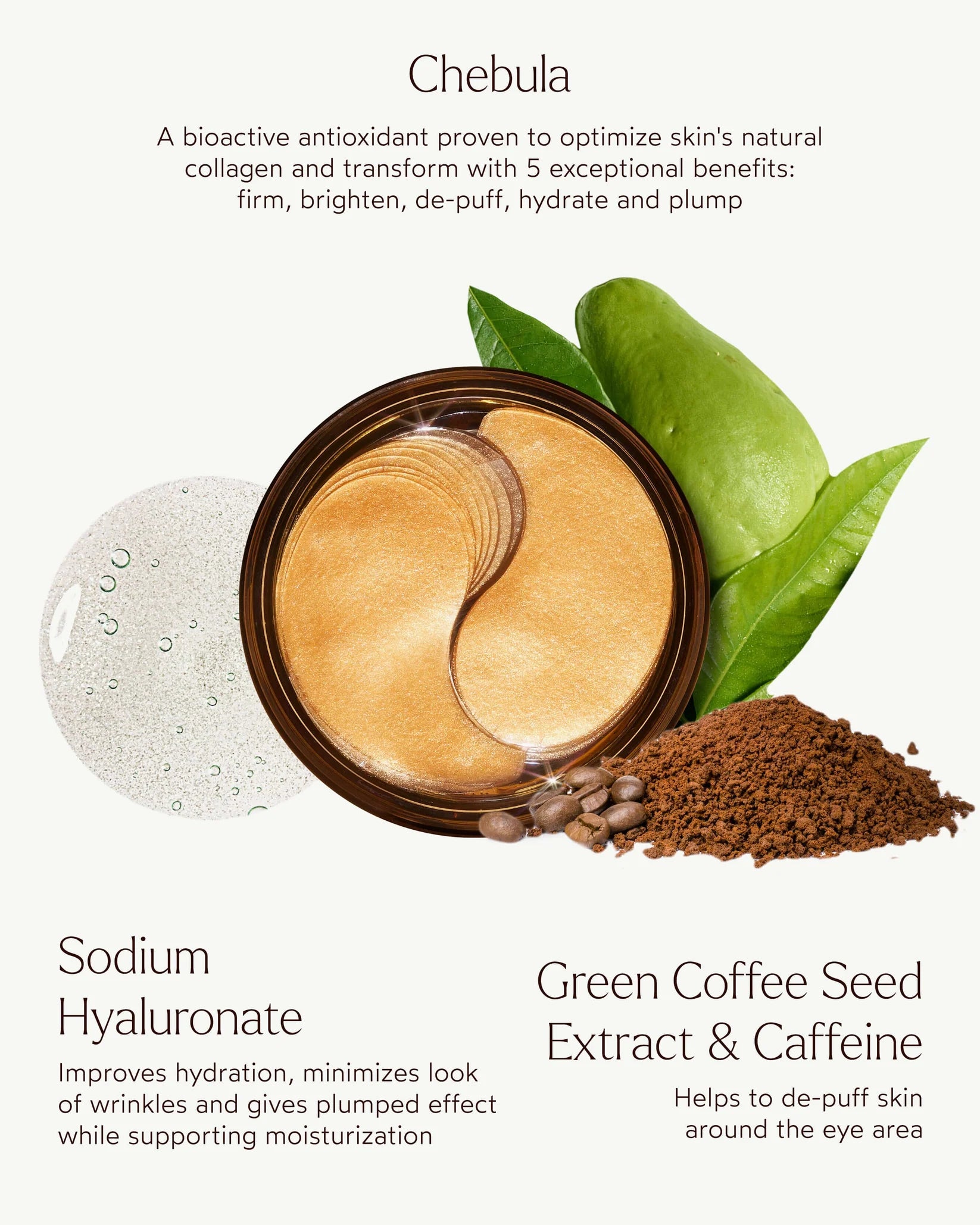 A luxurious and efficacious under eye treatment clinically proven to fight five signs of aging around the delicate eye area, in just 15 minutes. These under eye patches are powered by Chebula: a cascading antioxidant clinically proven to optimize skin’s natural collagen levels. These eye patches transform the under eye area with 5 exceptional benefits: firm, brighten, de-puff, hydrate & plump. The innovative hydrogel patch technology allows for instant and long-lasting multi-corrective results.