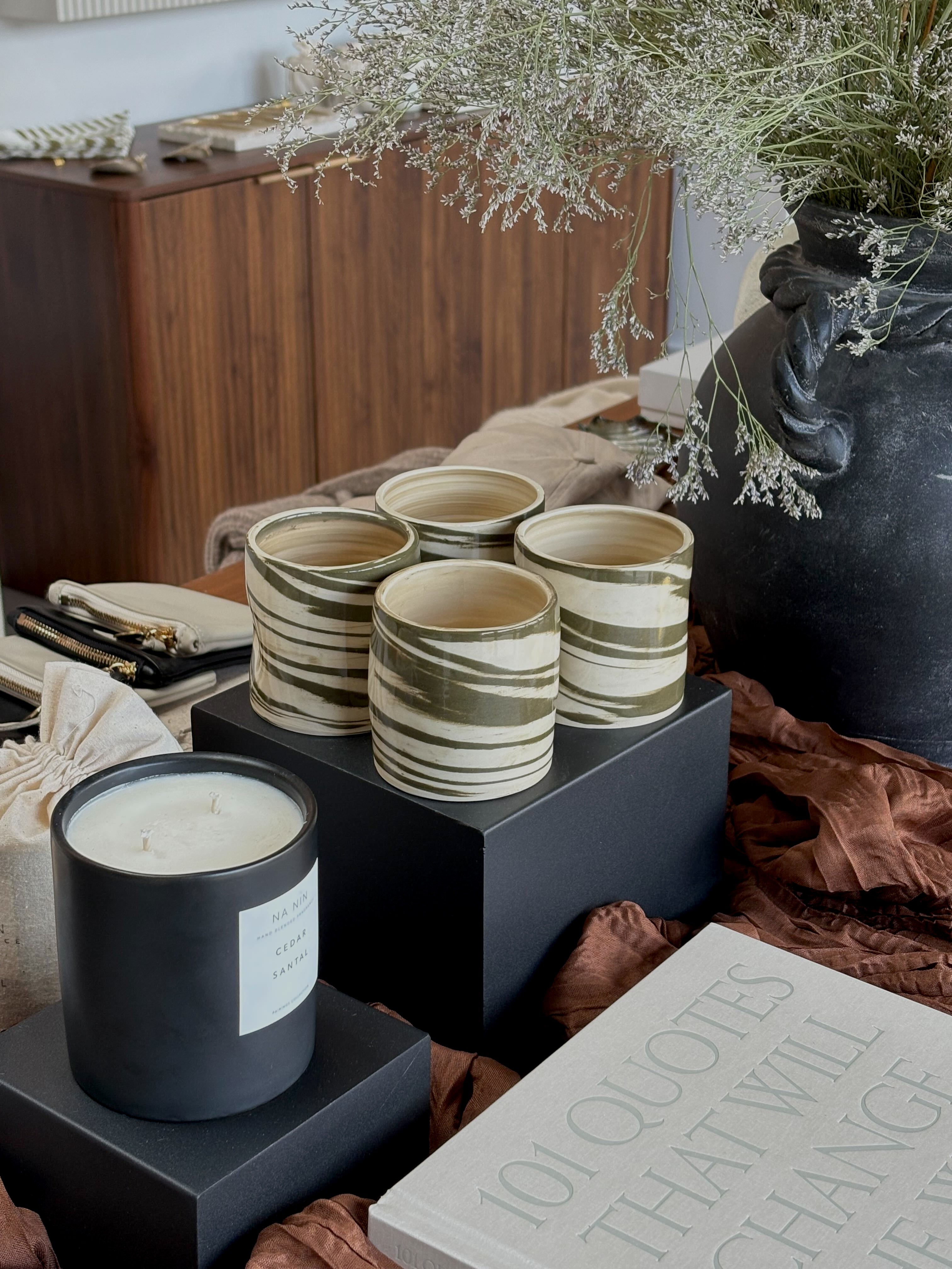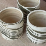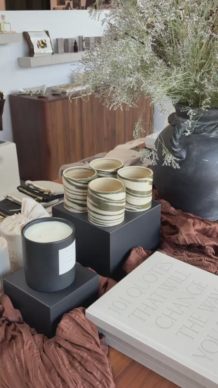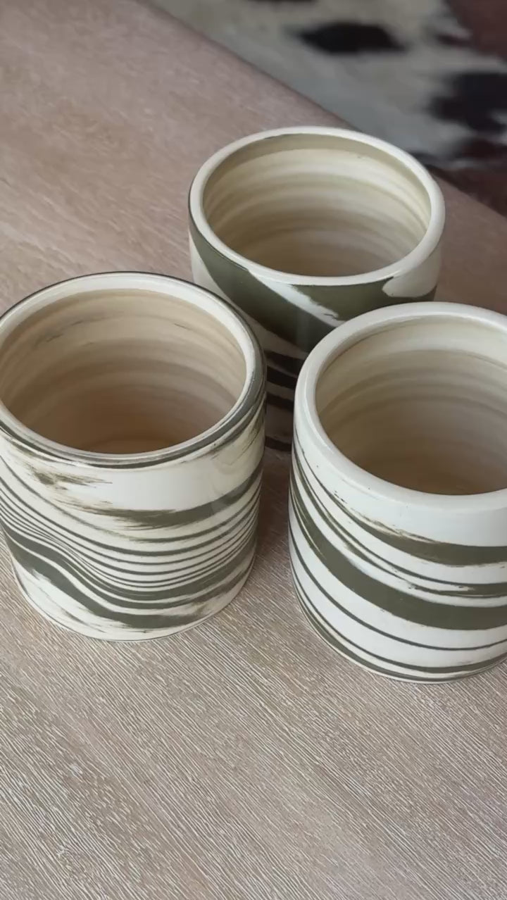 Handcrafted in San Diego by Sunrise Ceramics, these one-of-a-kind marbled mugs bring an artful touch to your daily ritual. Each piece is wheel-thrown and hand-pinched, creating an organic, tactile feel that fits perfectly in your hands. The swirling marbled clay pattern ensures no two mugs are alike, making each one a true work of functional art.
