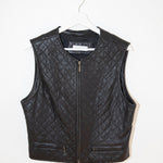A refined vintage 90s black leather vest by Lord & Taylor. Minimalist silhouette and diamond-quilted texture. Crafted from supple leather. Features a zip front, sleek neckline, and discreet zip pockets for a modern finish. Fully lined for ease of layering — perfect over a turtleneck or crisp shirting.