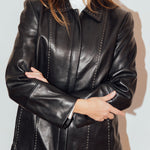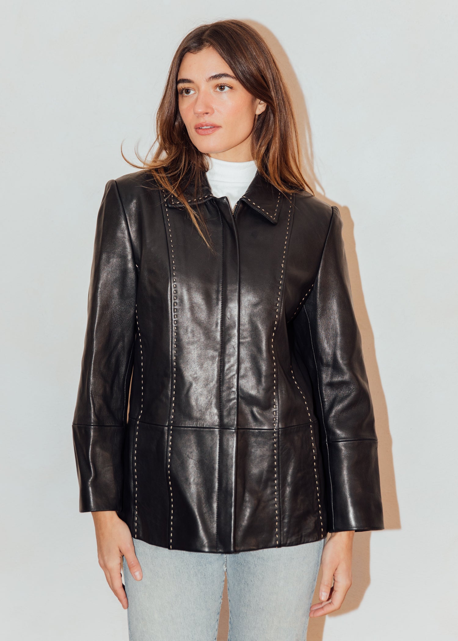 A beautifully crafted vintage leather jacket with sculptural stitched paneling and a sleek, minimal silhouette. Made from butter-soft black leather, it drapes effortlessly while the contrast stitching add subtle structure and refinement. Zip front. Fully lined.
