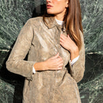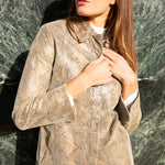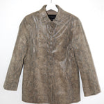 A beautifully structured Y2K embossed-leather jacket from Express, featuring a subtle snake texture in a soft taupe tone. The silhouette is clean and minimal, with a straight fit and hidden front button closure that keeps the look modern and understated. Slight shoulder pads for structure. Fully lined.