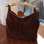 A sculptural silhouette with roots in heritage craft. The Mara Bag is distinguished by its artisan-made brass handle, a striking piece of functional art created by artisans in Kenya — where this design first came to life. Today, the bag is crafted in Los Angeles using sustainably sourced European suede, marrying global craftsmanship with our California roots.