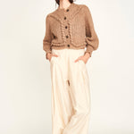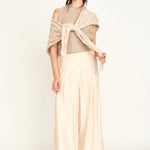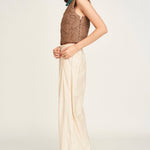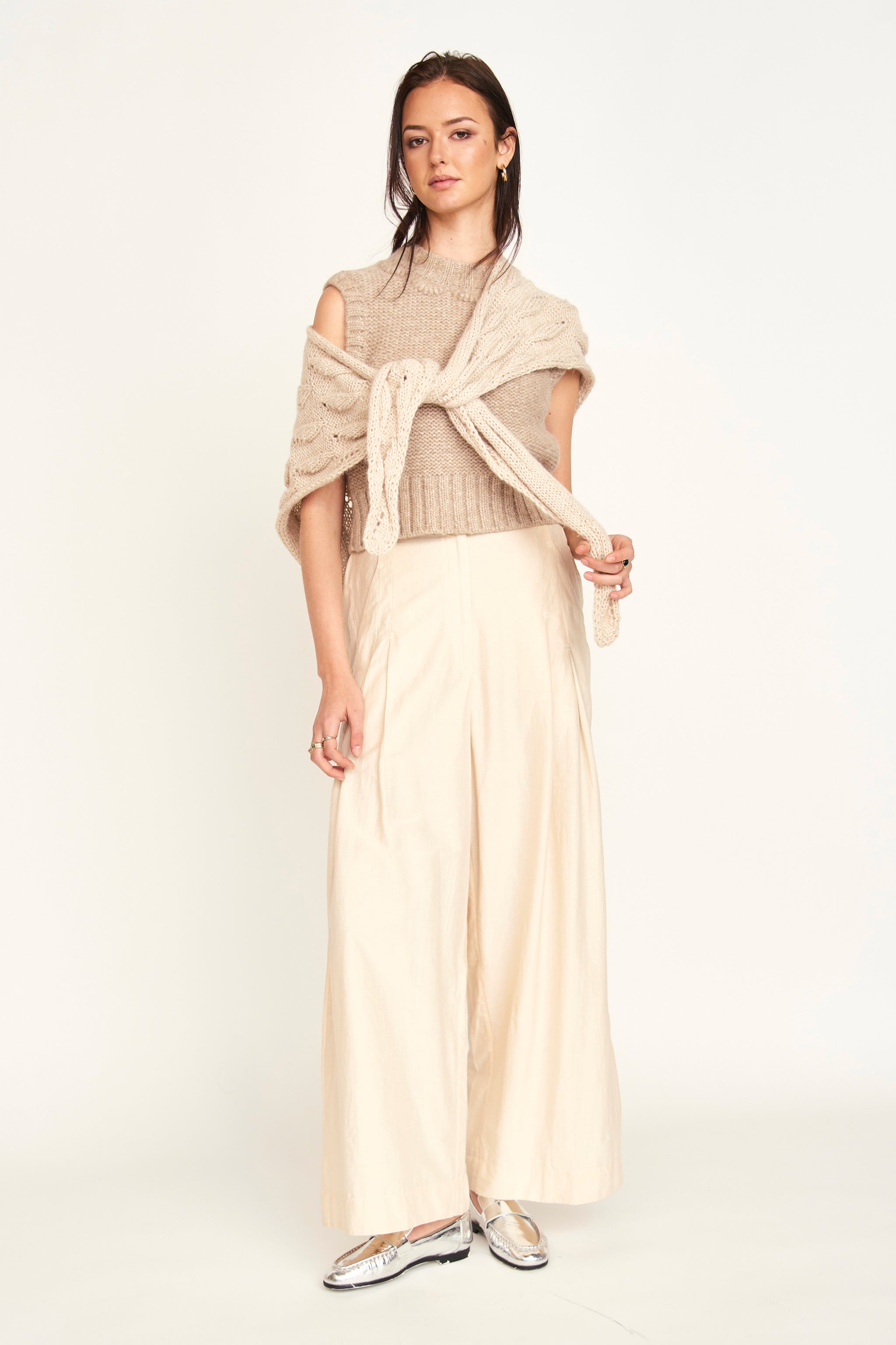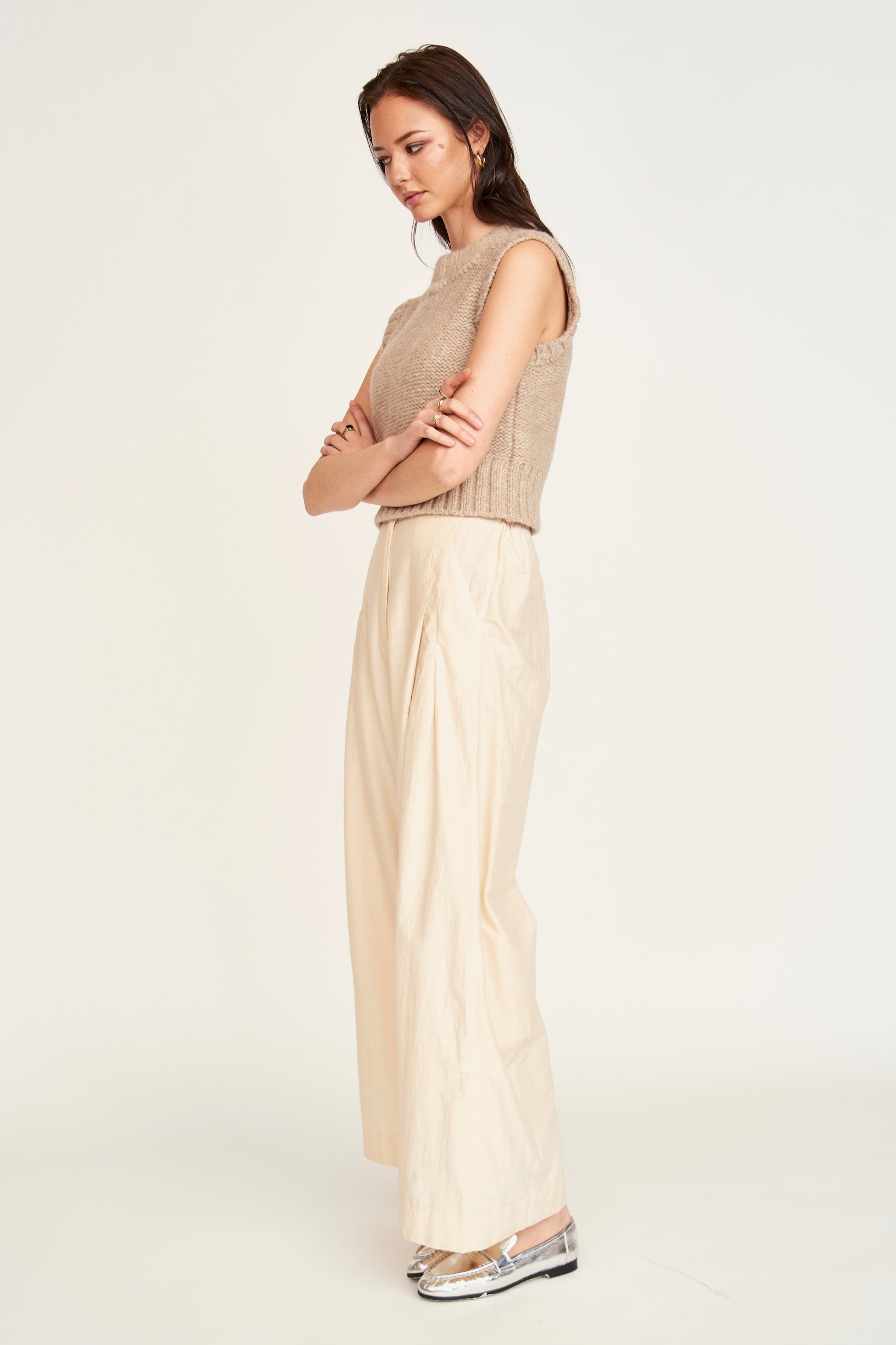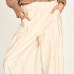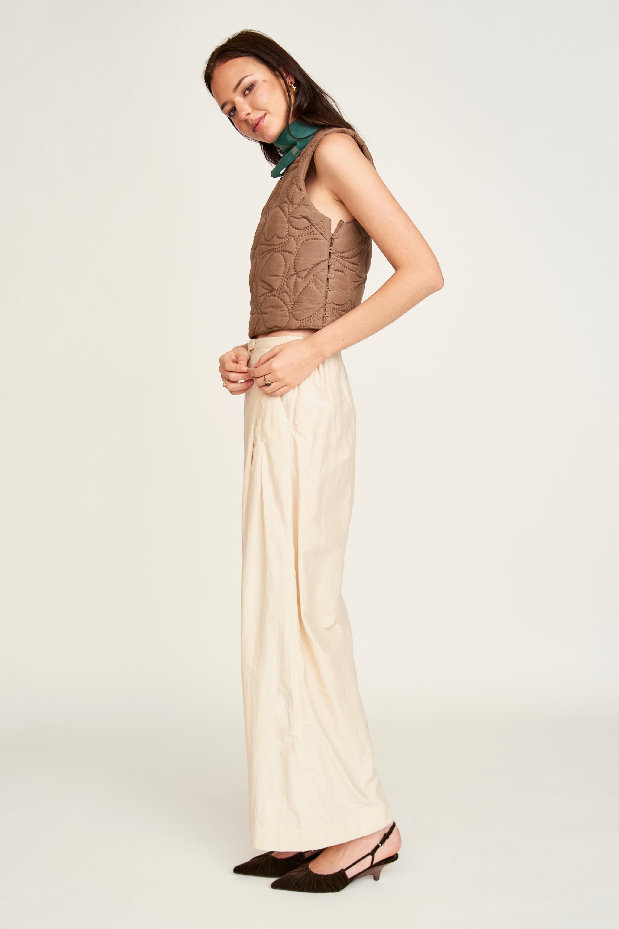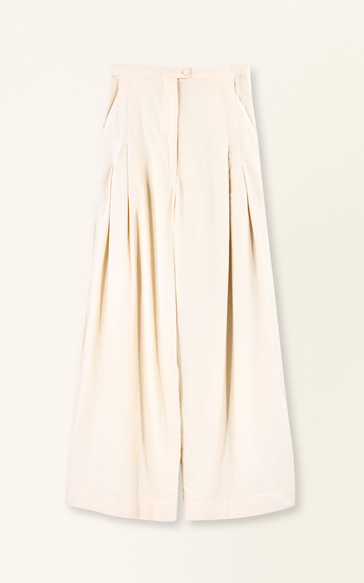 These wide-leg trousers are designed with a relaxed, flattering silhouette—easy through the hips and legs with front pleats for tailored structure. The back waistband features hidden elastic for a comfortable fit, while the front closes with a zipper, tab, and hidden inner button. Finished with side pockets and a soft cotton-silk blend, they’re fully lined in 100% cotton for everyday ease. Made in India.