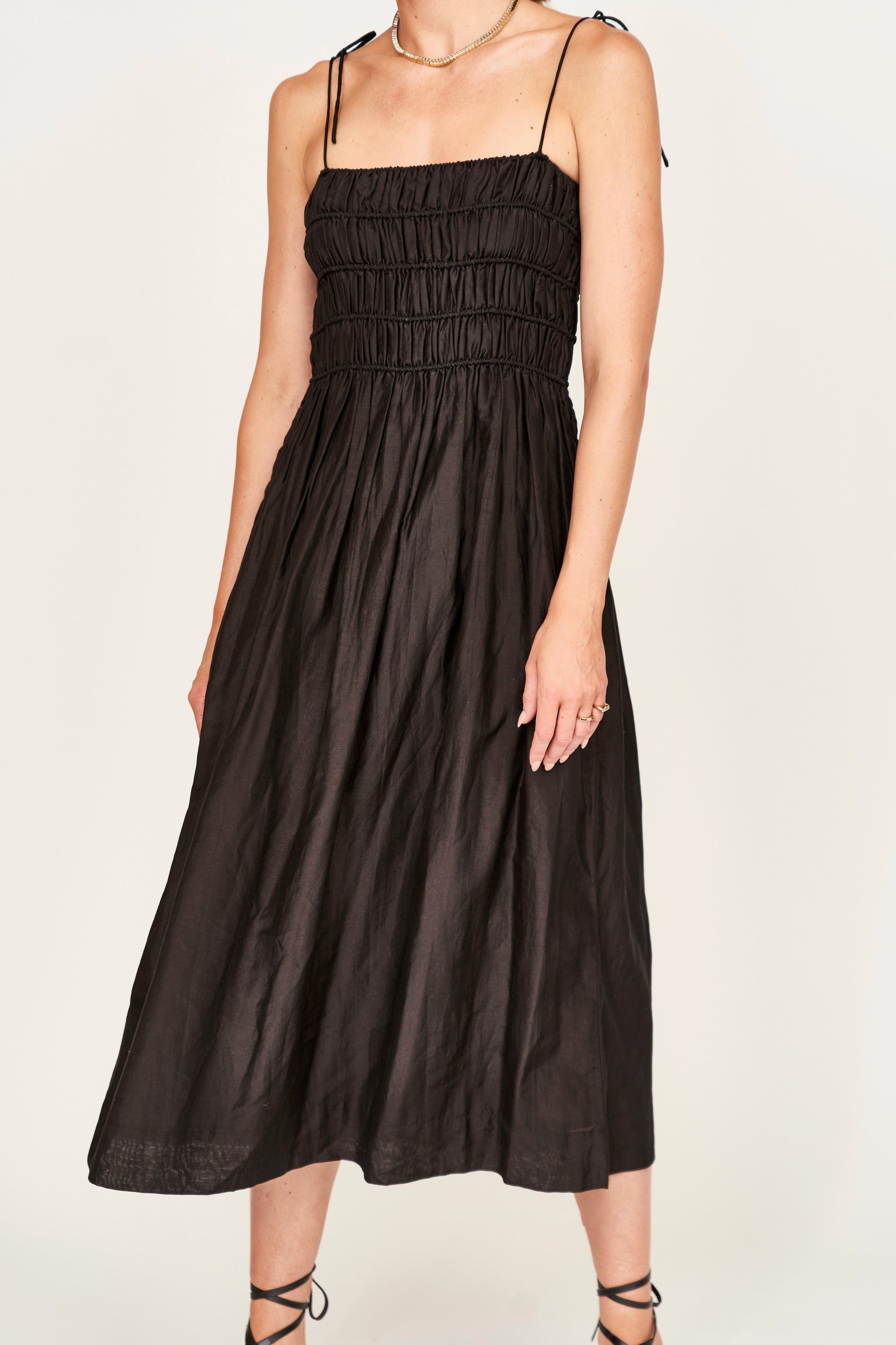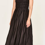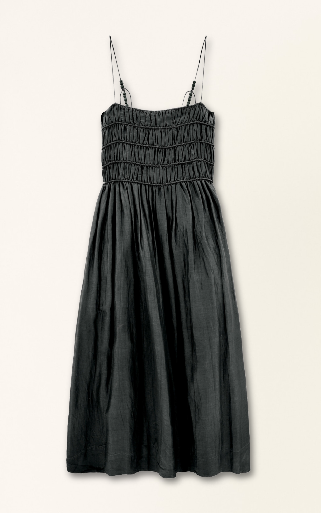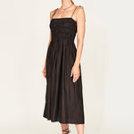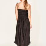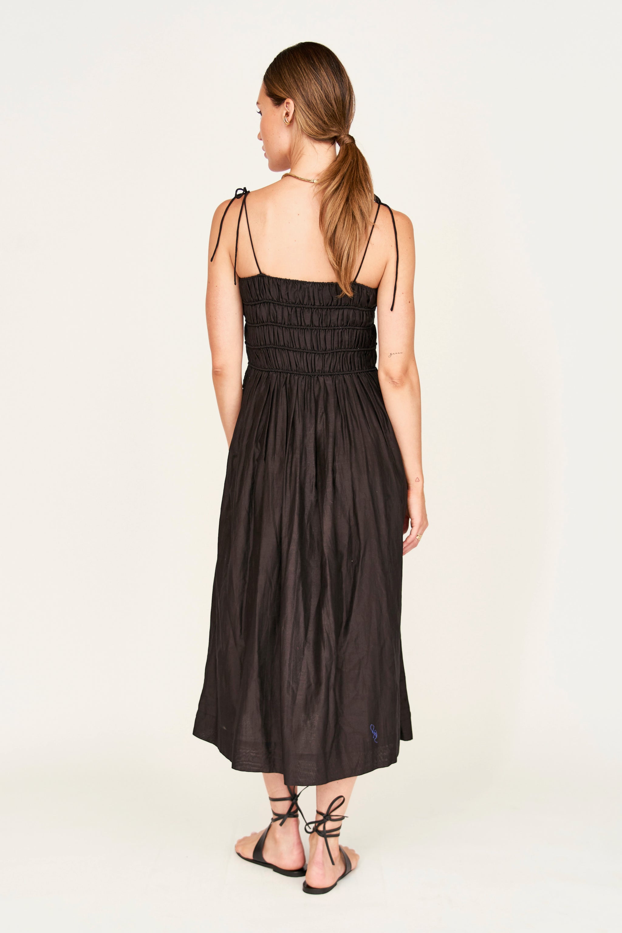 This ankle-length dress features a smocked elastic bodice for a flexible, flattering fit, with delicate spaghetti straps that tie at the shoulders or back—each finished with subtle beaded details. Crafted from a soft, lightweight cotton-silk blend and fully lined for ease, it’s an effortless piece for warm days and relaxed evenings. Made in India.