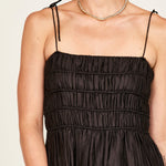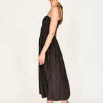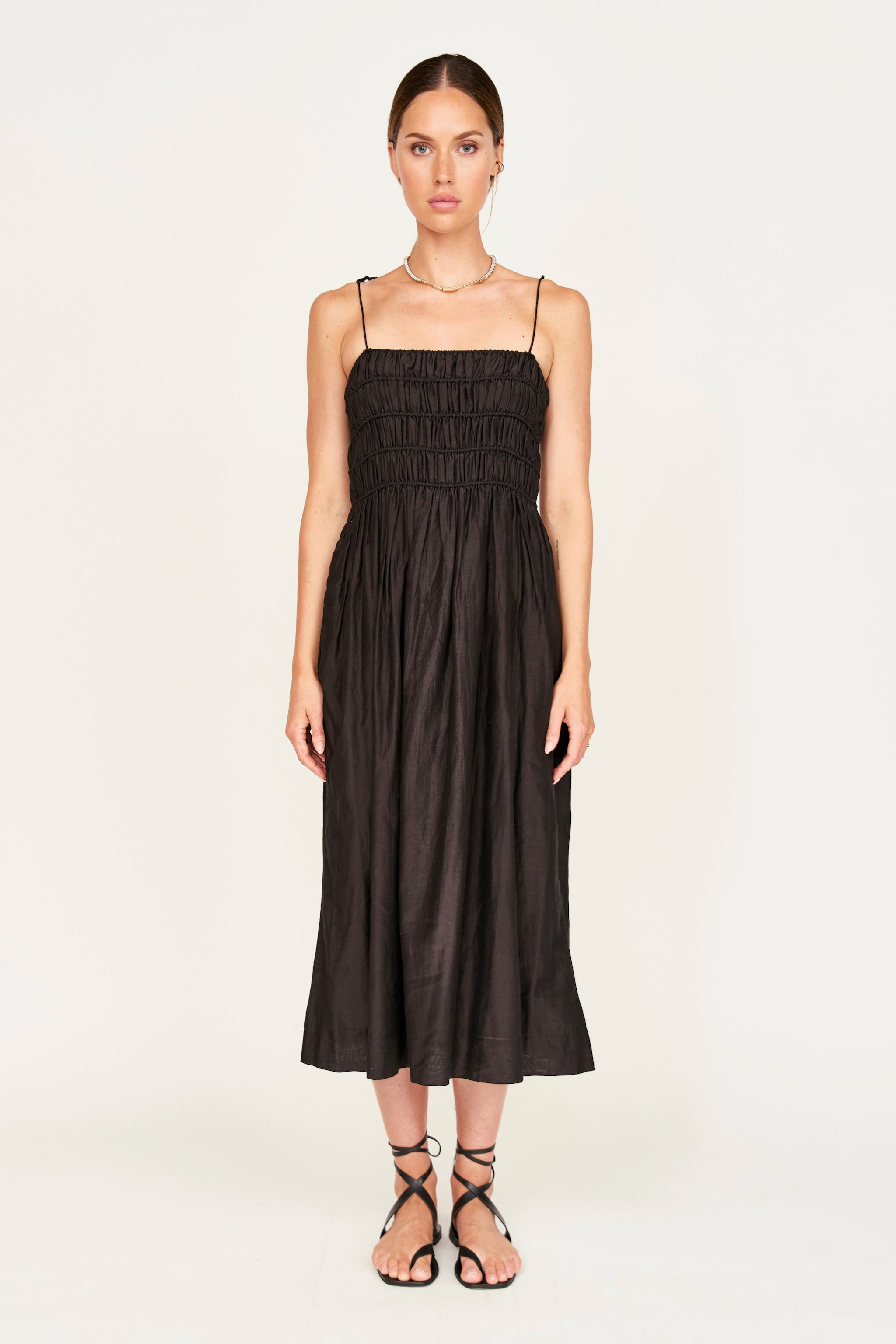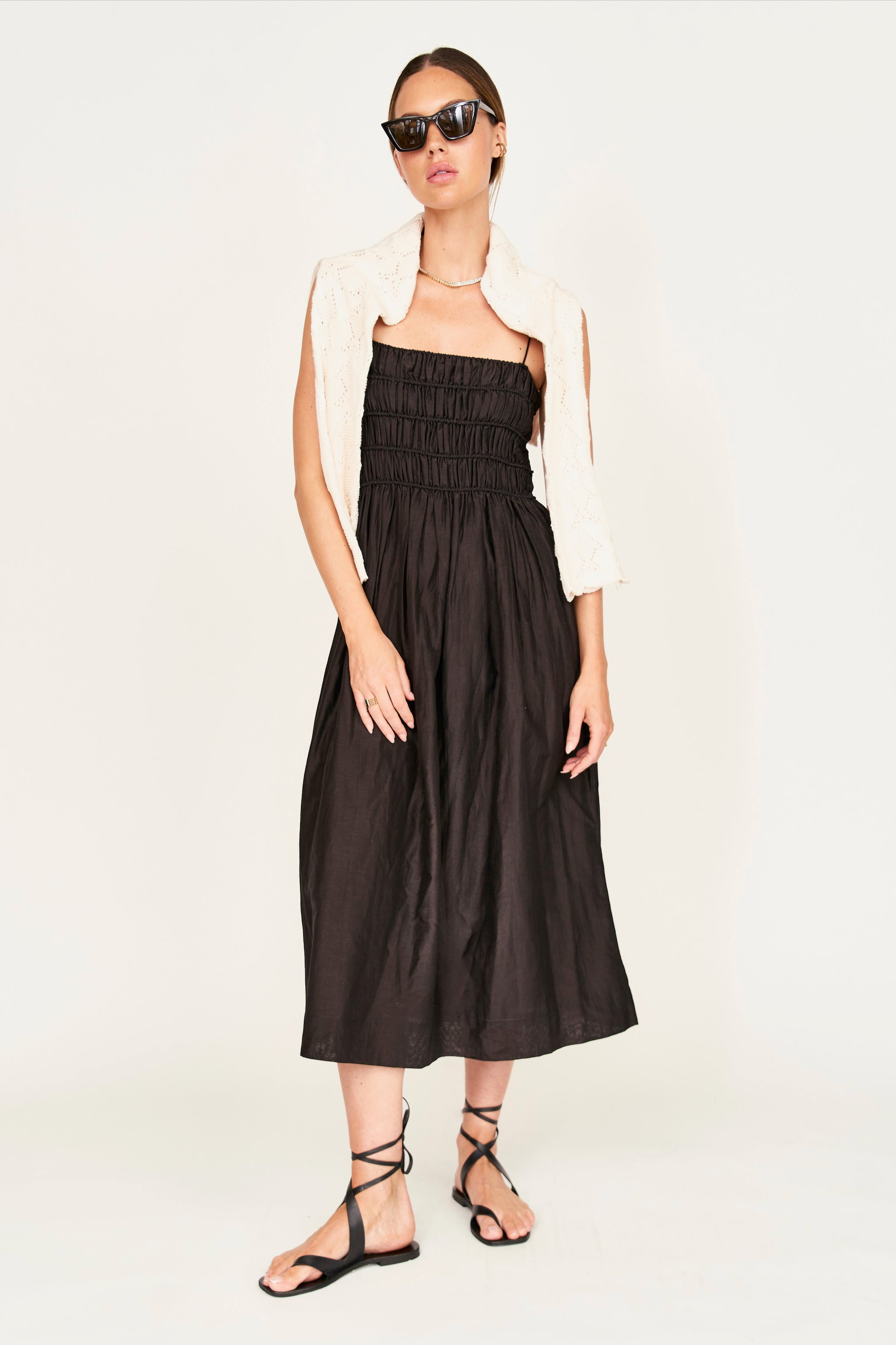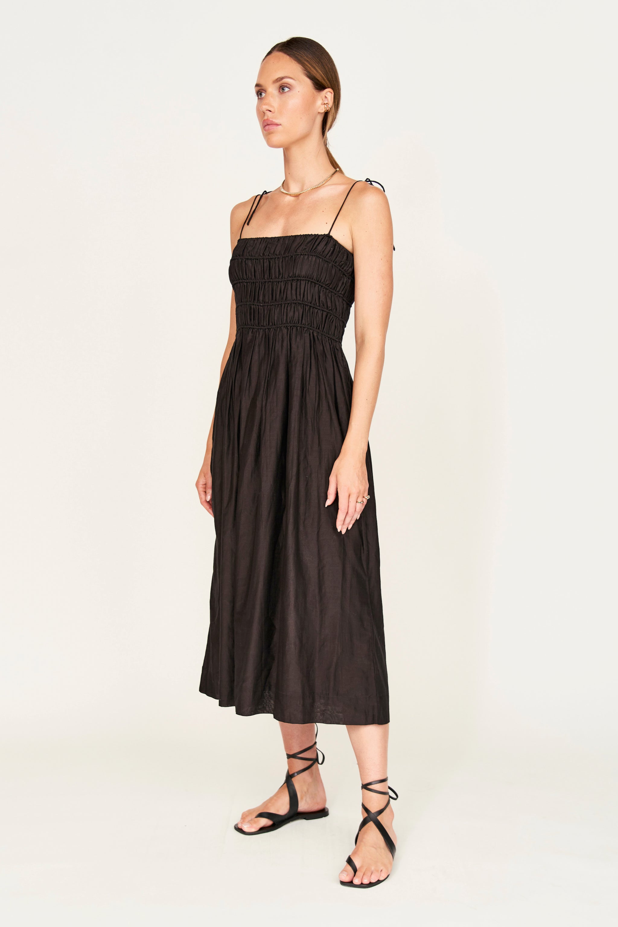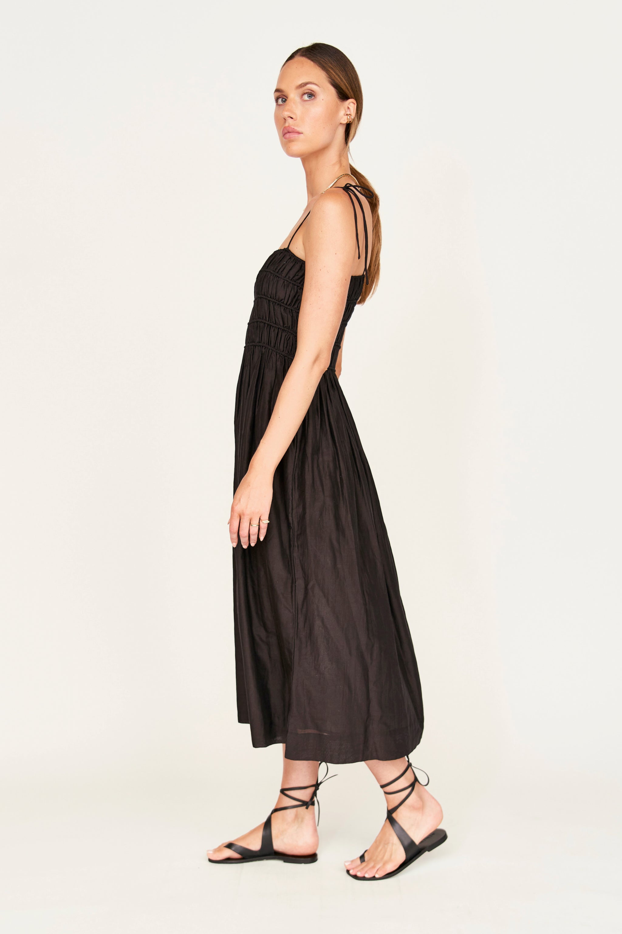 This ankle-length dress features a smocked elastic bodice for a flexible, flattering fit, with delicate spaghetti straps that tie at the shoulders or back—each finished with subtle beaded details. Crafted from a soft, lightweight cotton-silk blend and fully lined for ease, it’s an effortless piece for warm days and relaxed evenings. Made in India.