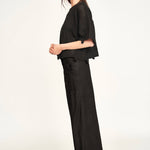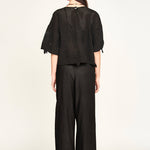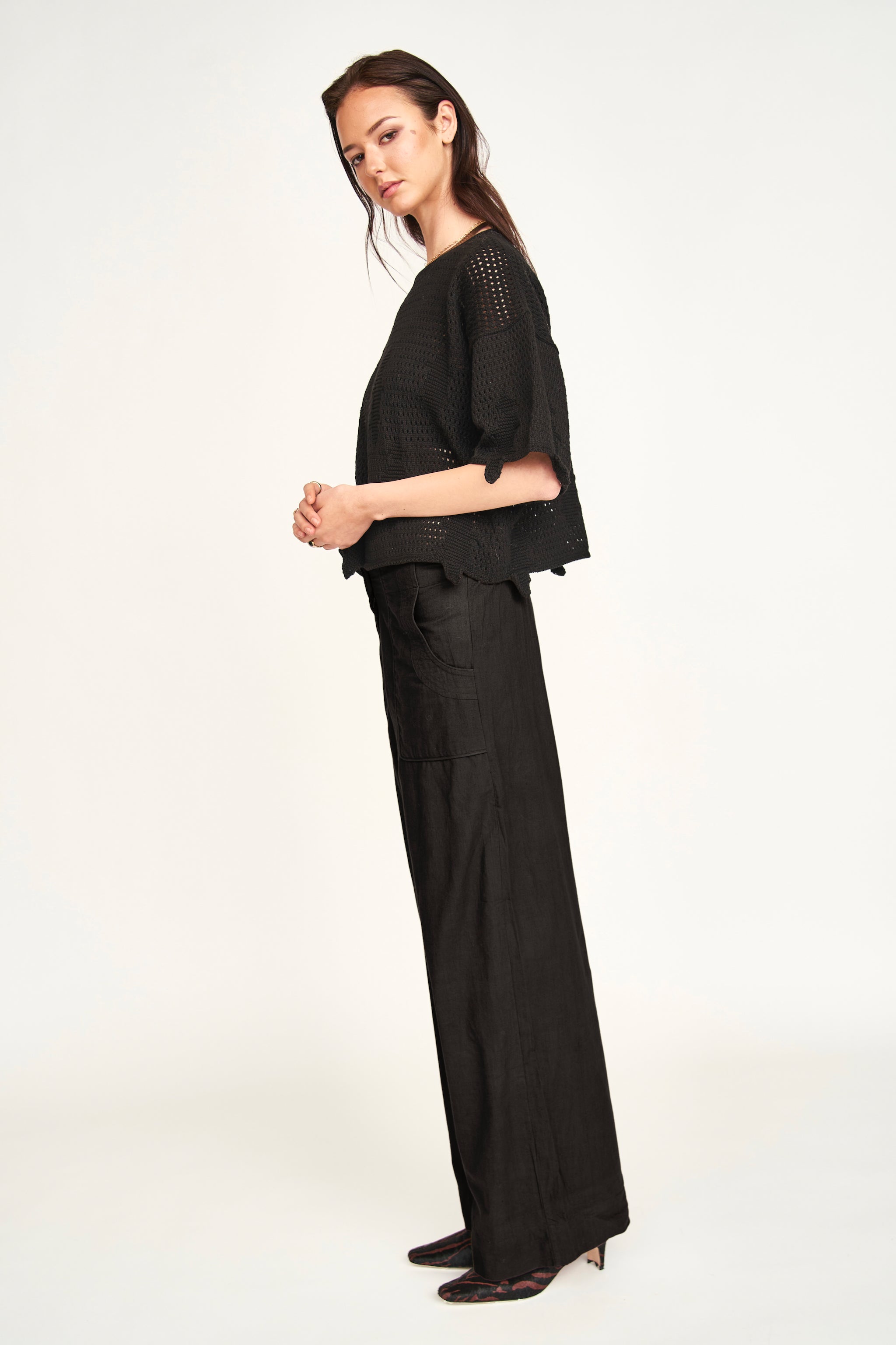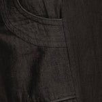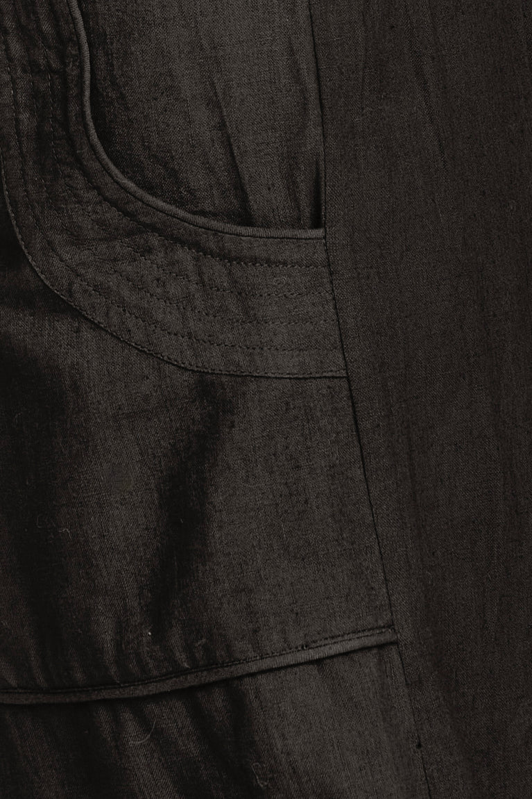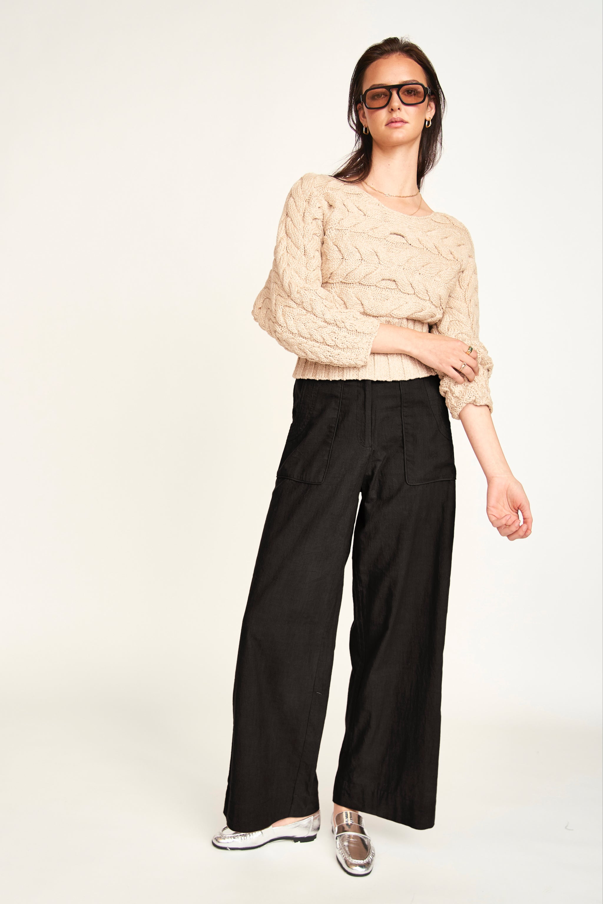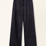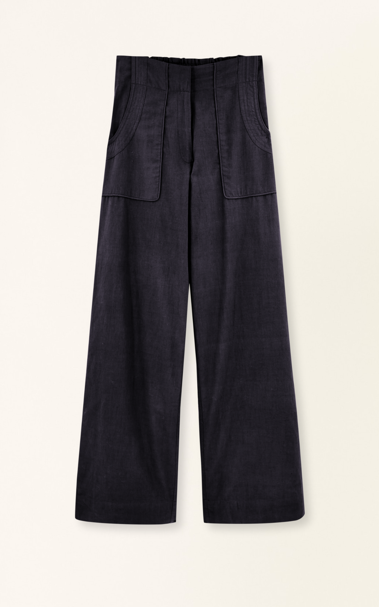 These long, straight-leg trousers feature a structured front with a zipper, tab, and hidden button closure, while the back waist includes subtle elastic for added comfort. Front pockets are accented with topstitching and piped detailing for a refined finish. Crafted from 100% cotton with a slubby, linen-like texture, and fully lined for ease. Made in India.
