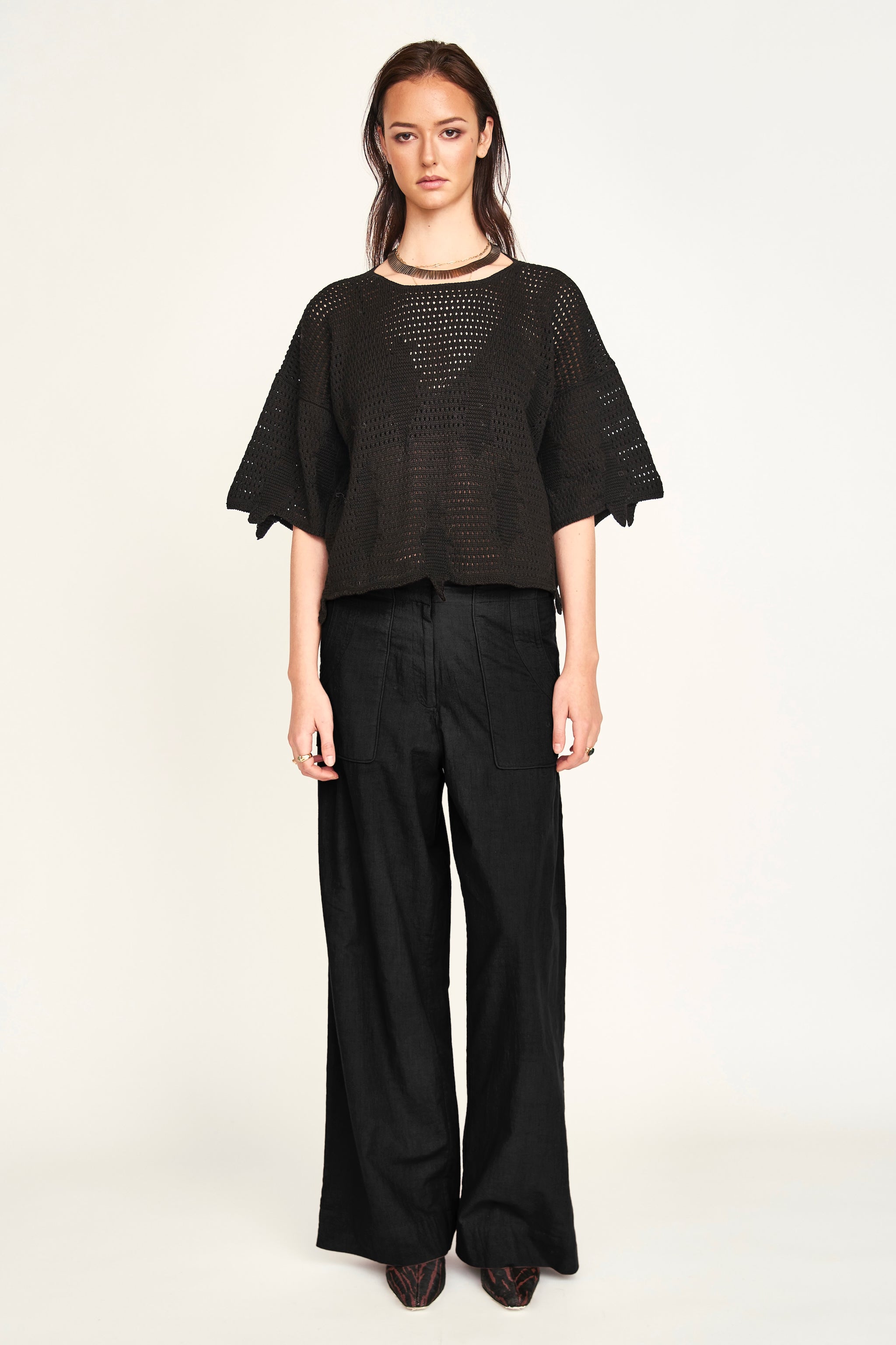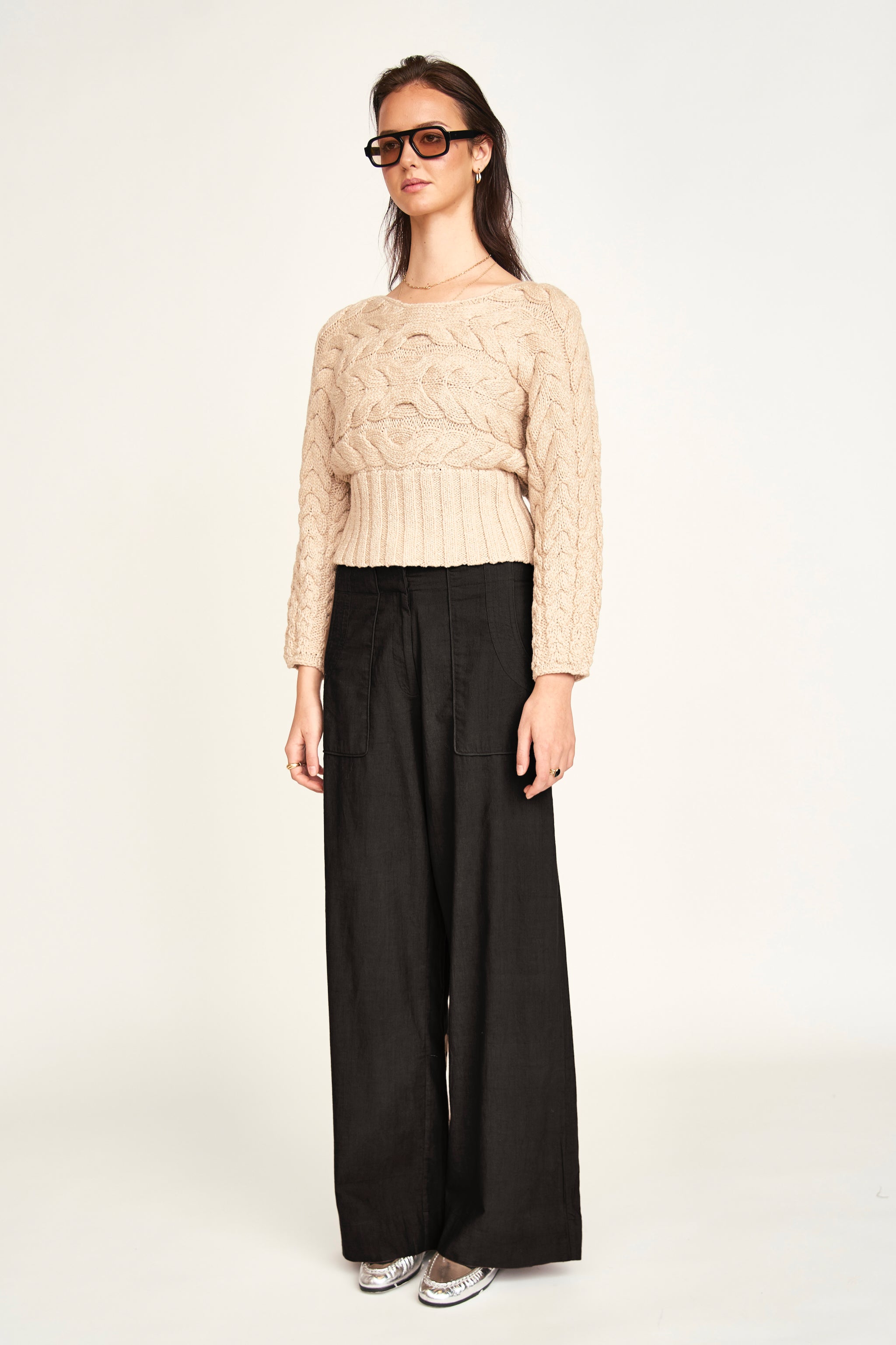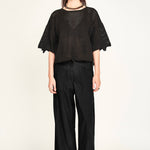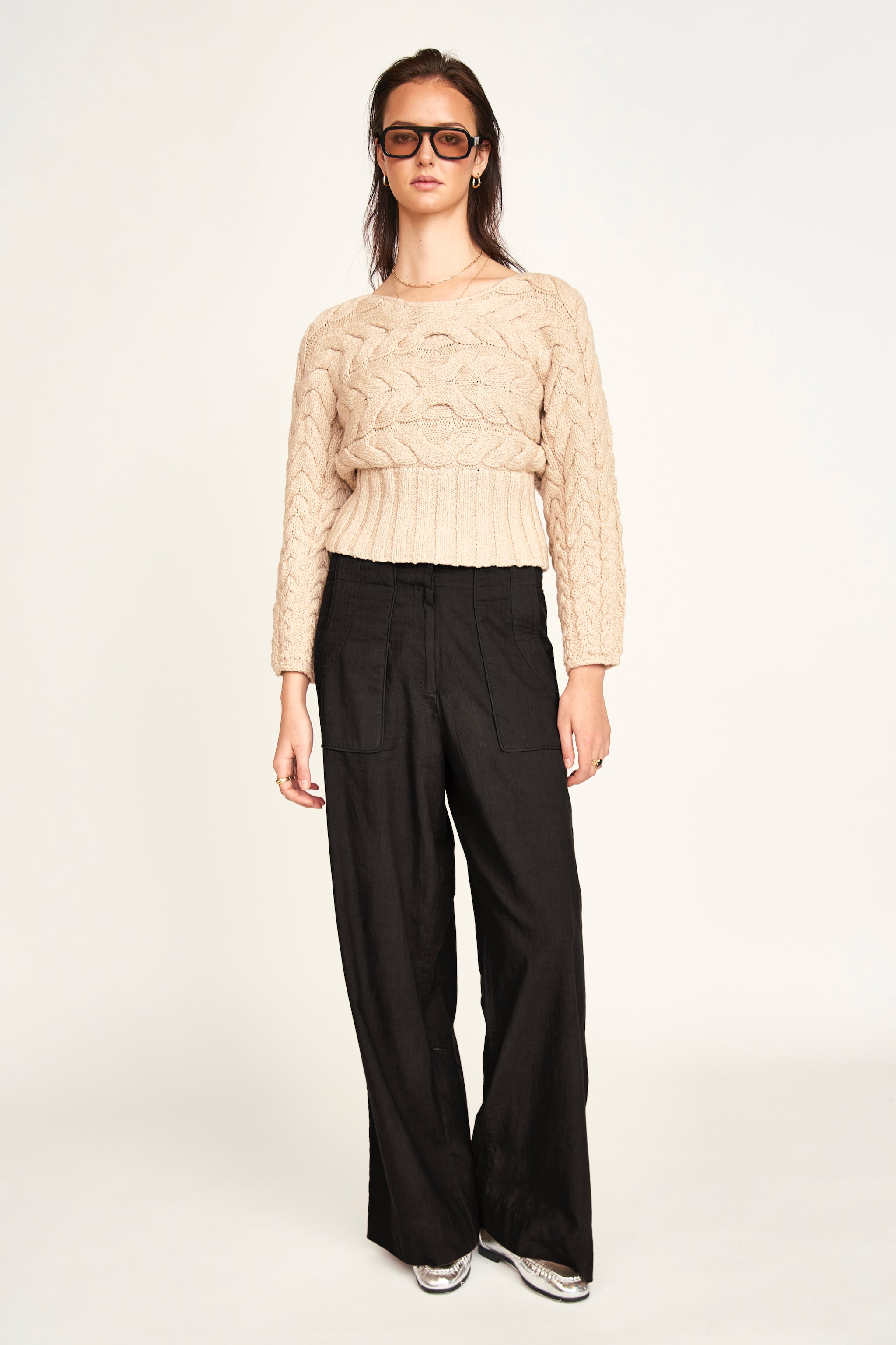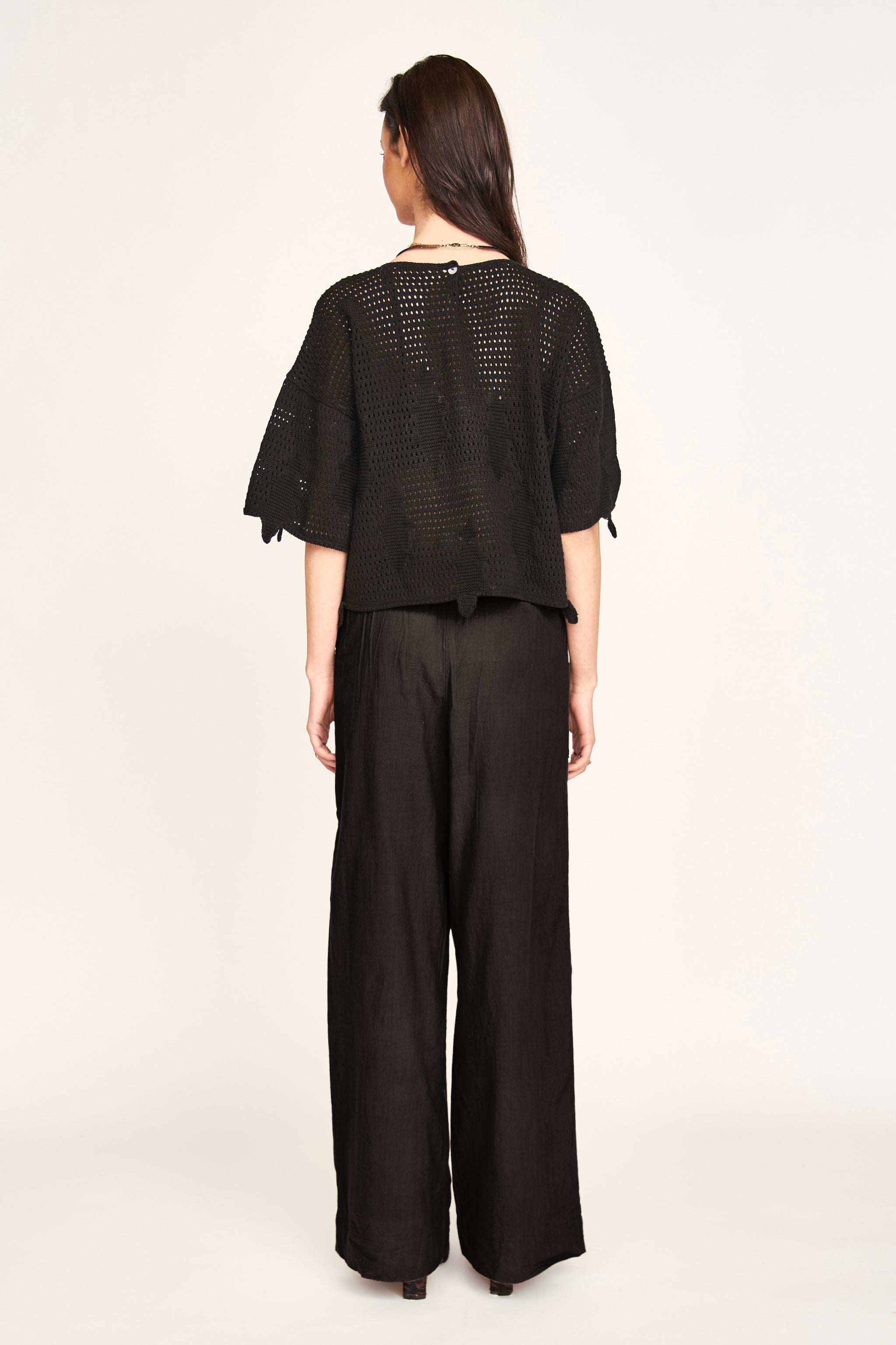 These long, straight-leg trousers feature a structured front with a zipper, tab, and hidden button closure, while the back waist includes subtle elastic for added comfort. Front pockets are accented with topstitching and piped detailing for a refined finish. Crafted from 100% cotton with a slubby, linen-like texture, and fully lined for ease. Made in India.