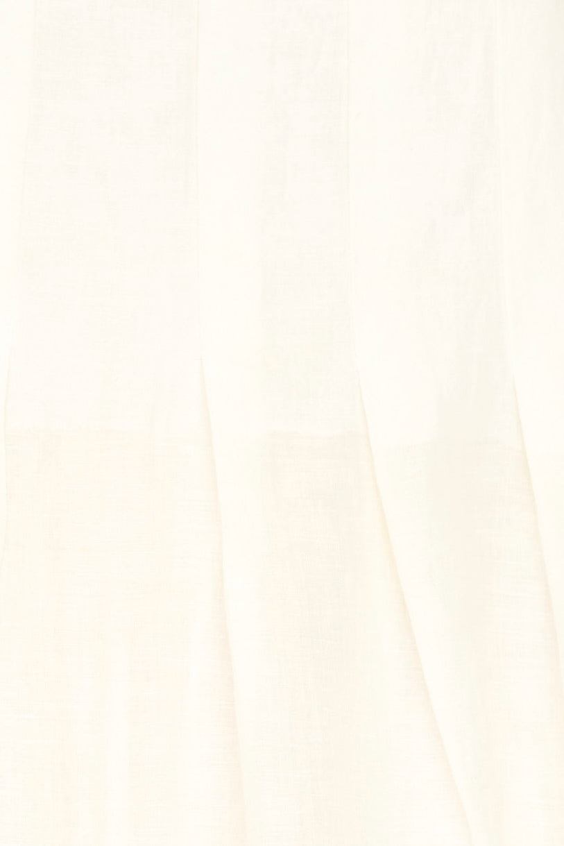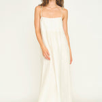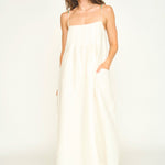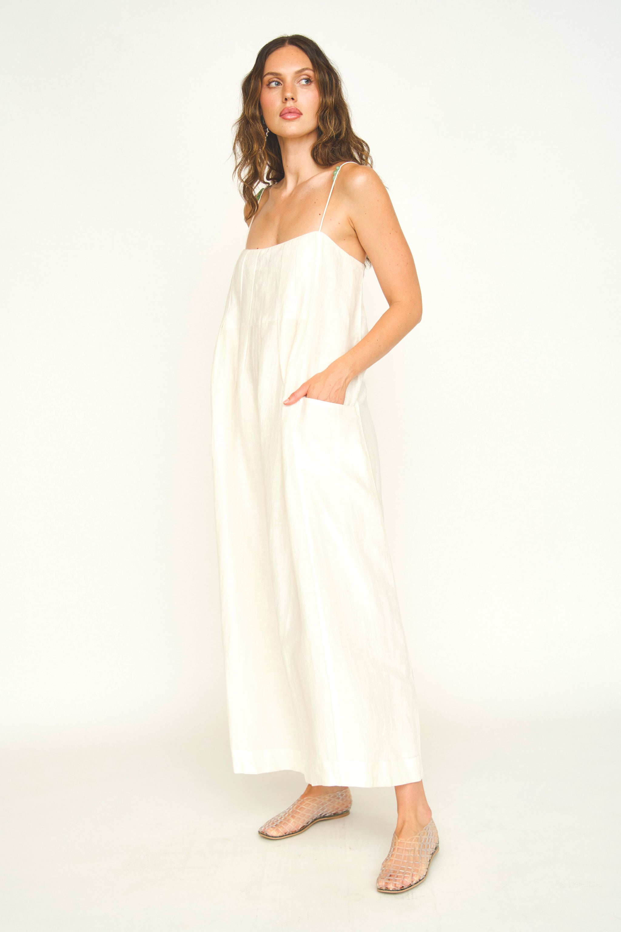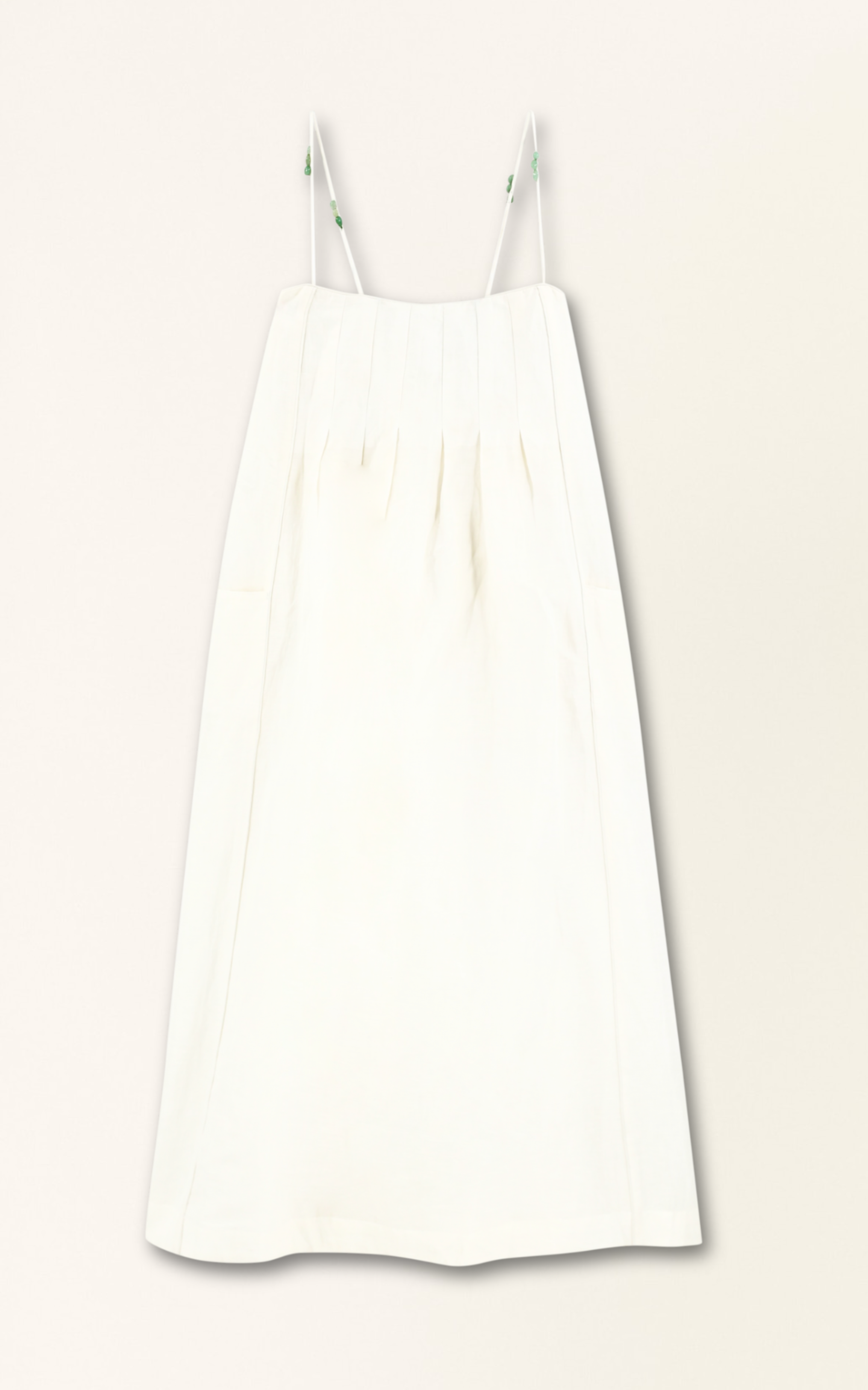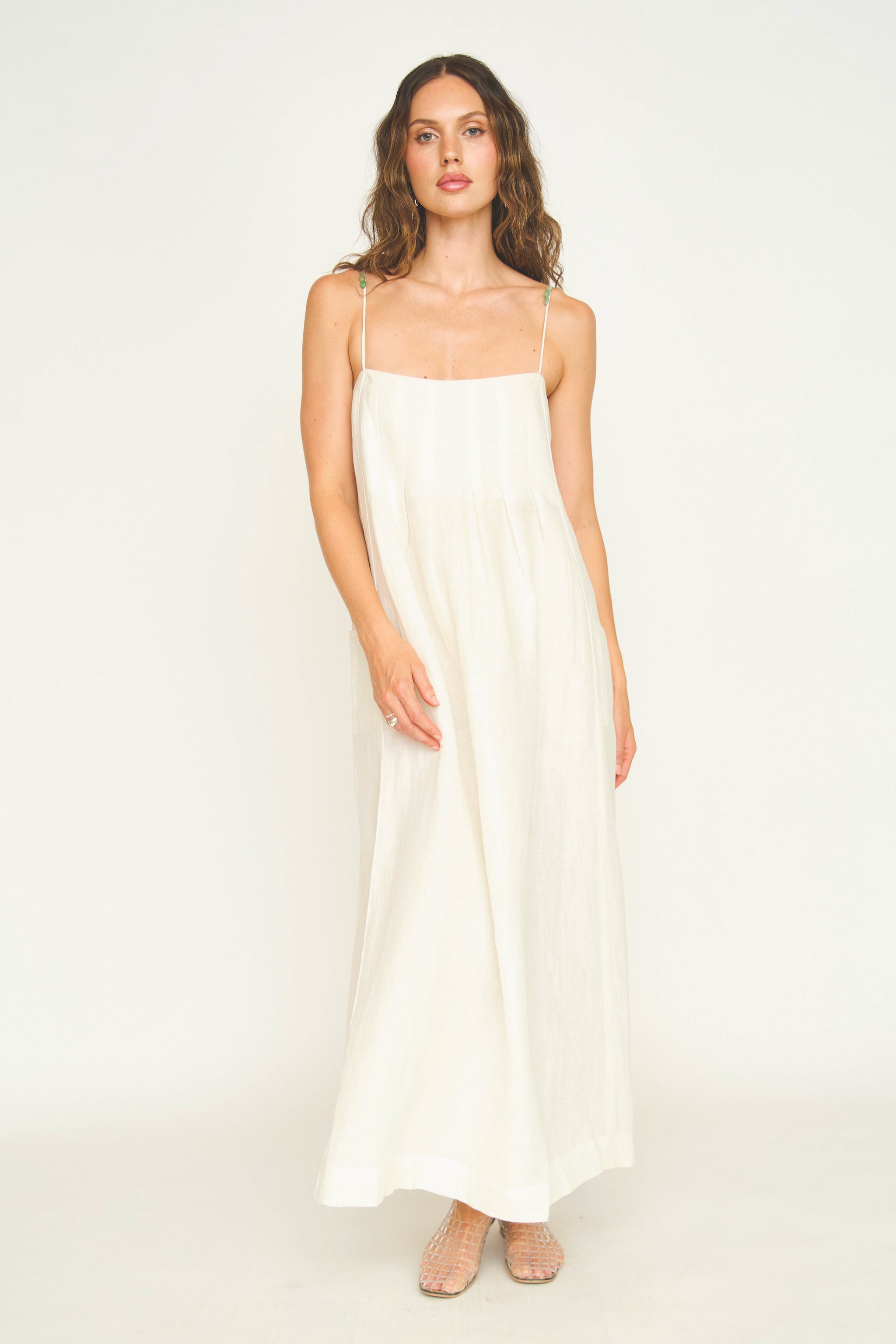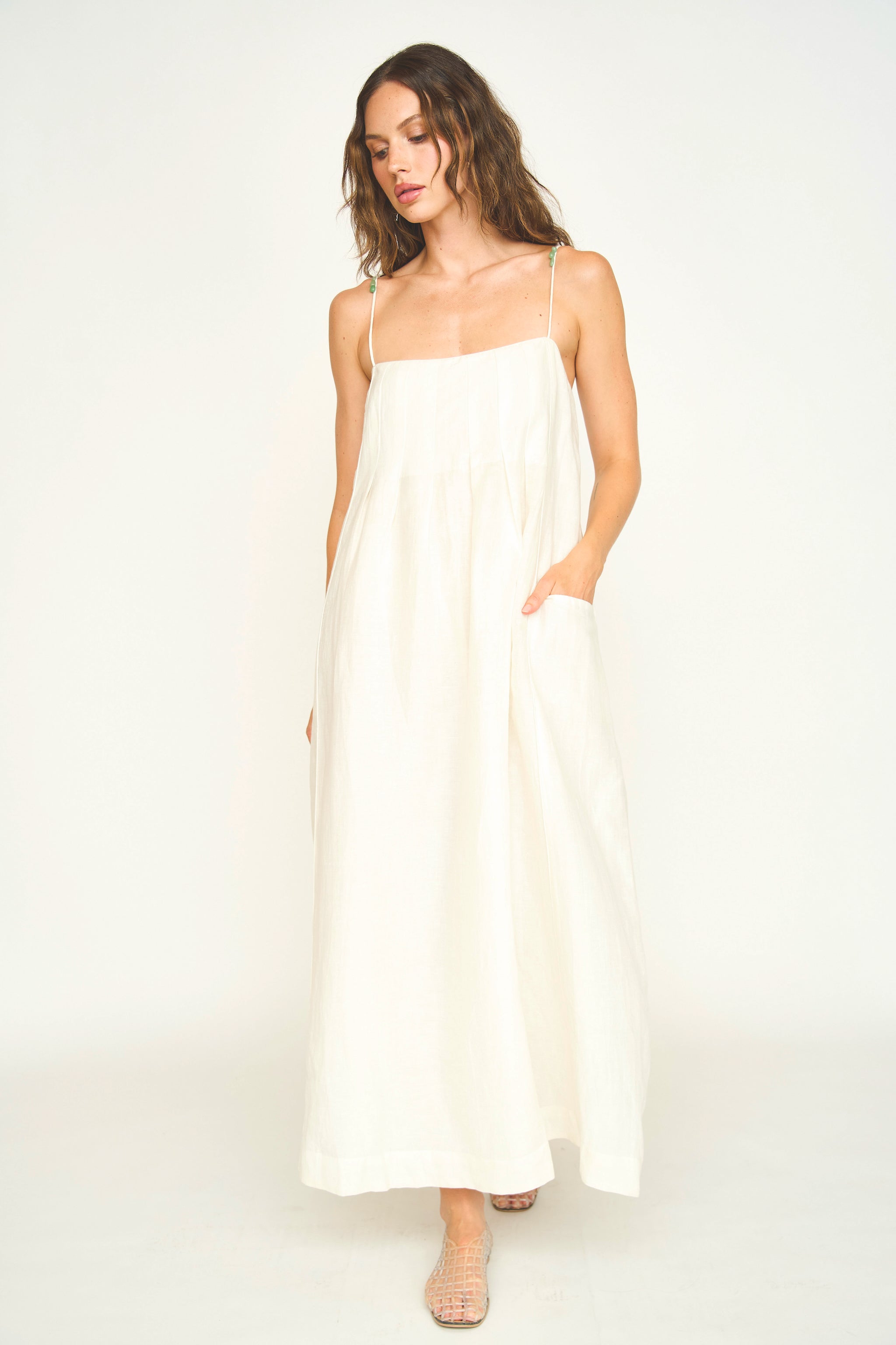 This ankle-length dress features delicate spaghetti straps that tie at the back for an adjustable fit, accented with subtle beaded details. Soft pleating at the bust and back adds texture, while a discreet elastic panel between the straps offers gentle shaping. Crafted from a breathable cotton-linen blend and lined in 100% cotton, it has a slightly sheer finish and includes practical side patch pockets. Made in India.
