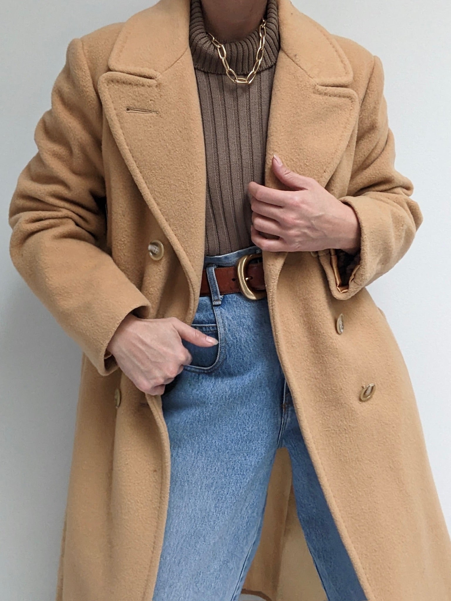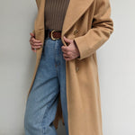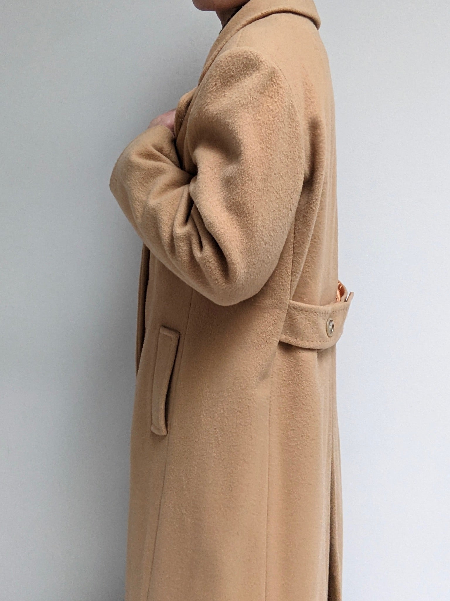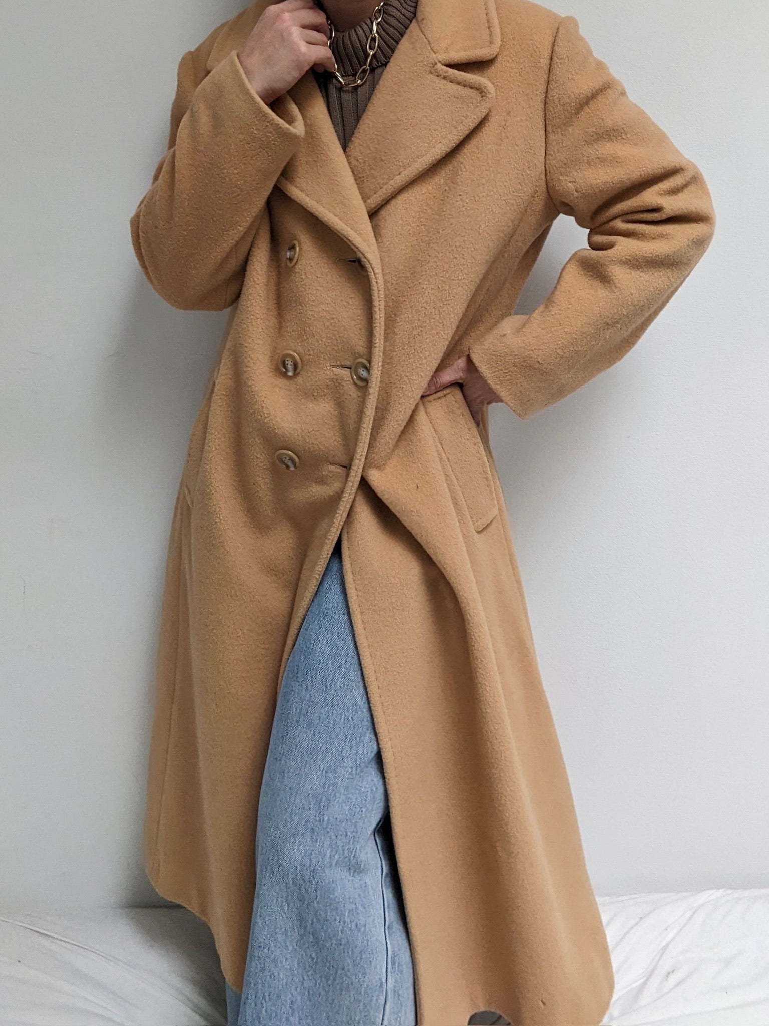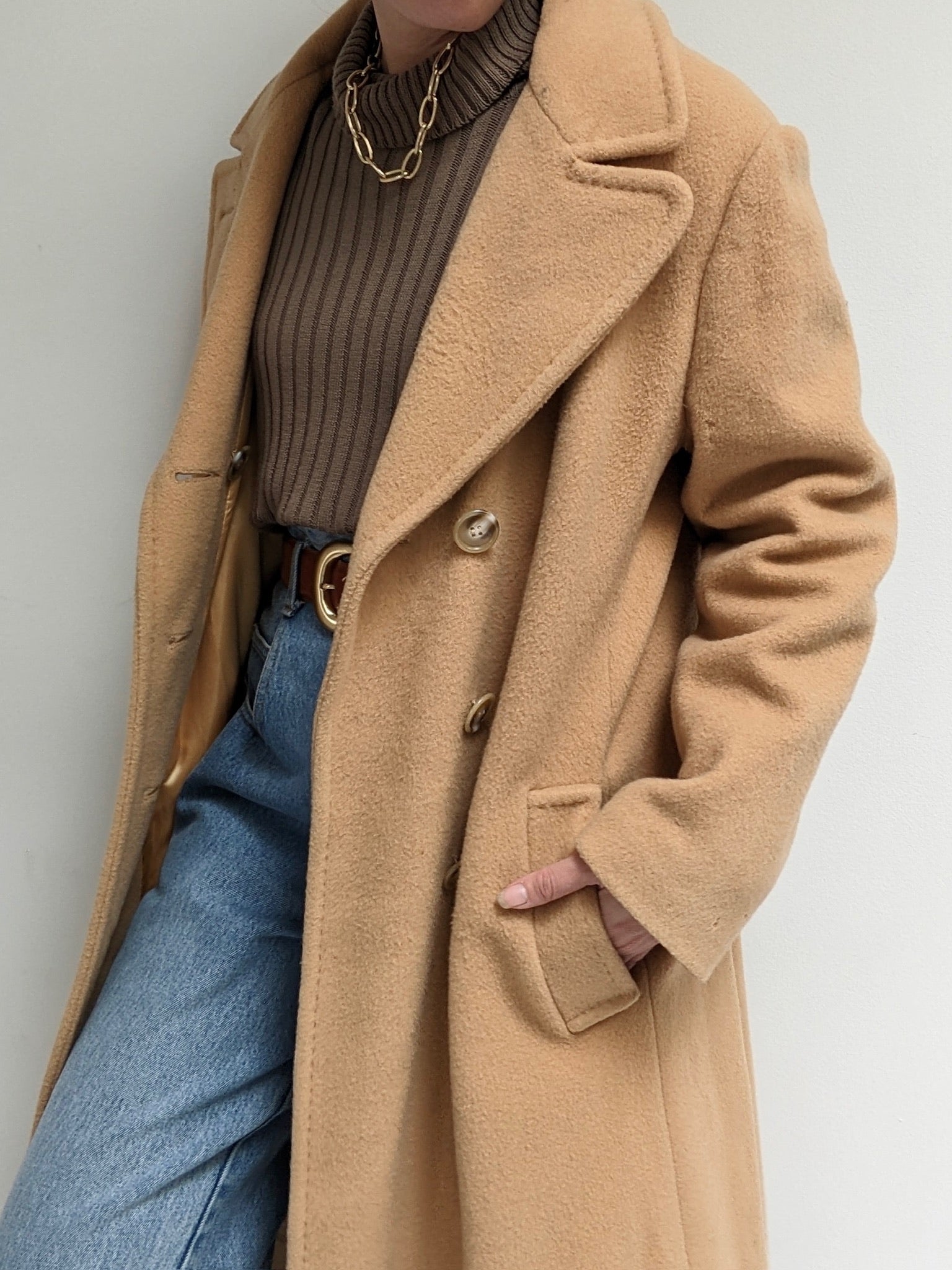 Incredible vintage coat in a heavyweight wool & lovely camel brown color. Coat has large, double-breasted buttons up the front, a notched collar, deep pockets and a satin-lined interior.