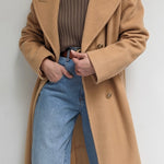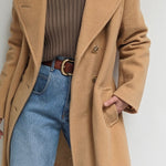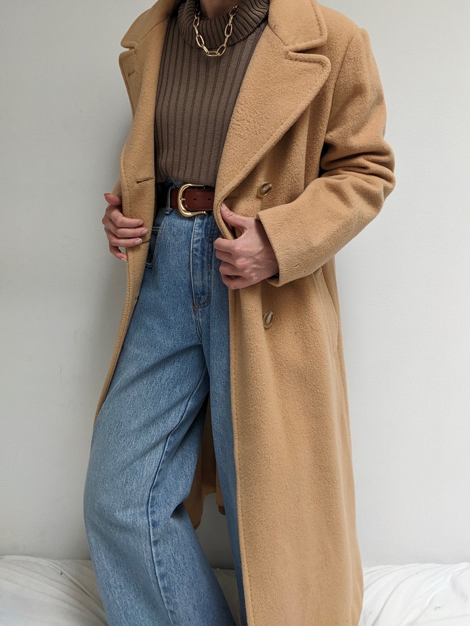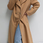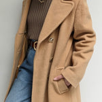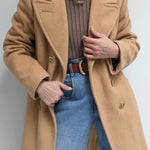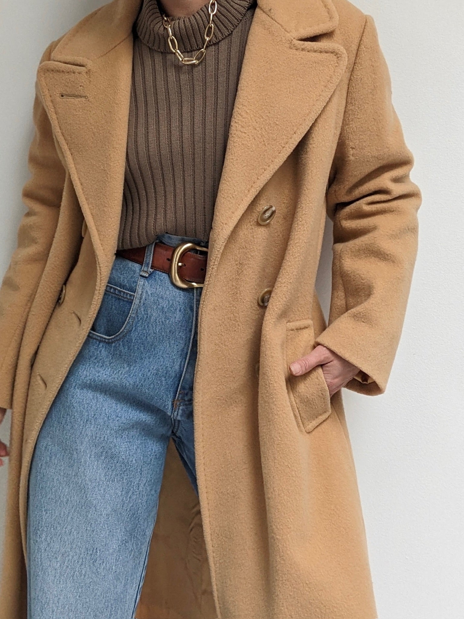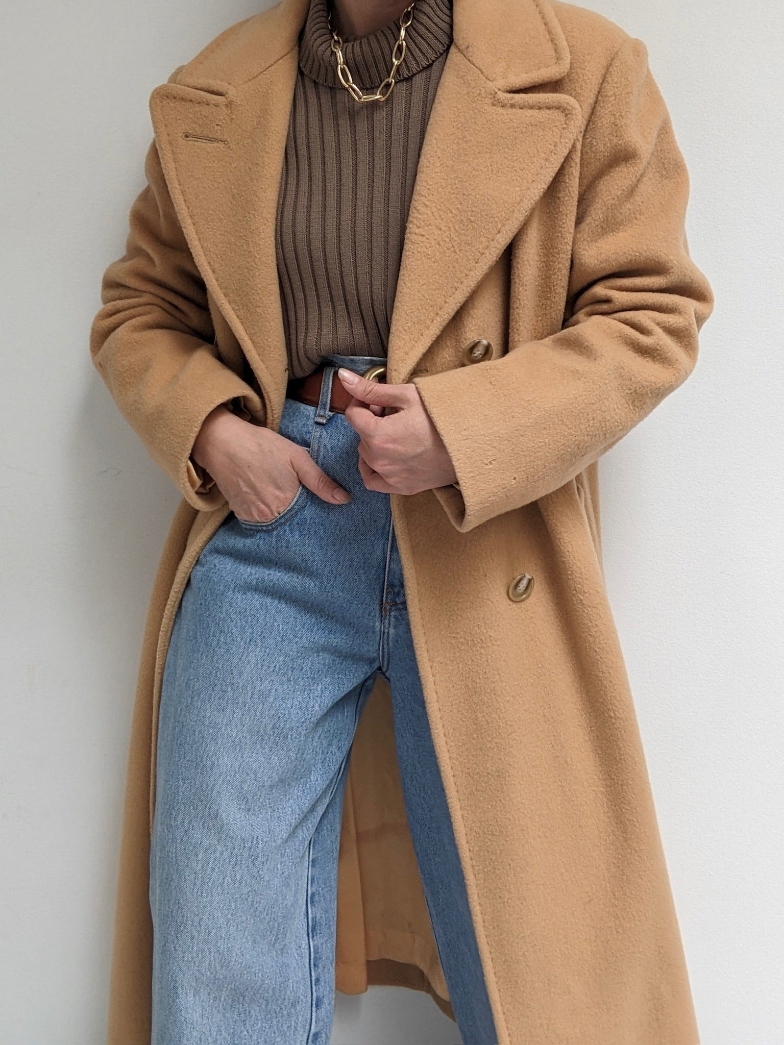 Incredible vintage coat in a heavyweight wool & lovely camel brown color. Coat has large, double-breasted buttons up the front, a notched collar, deep pockets and a satin-lined interior.