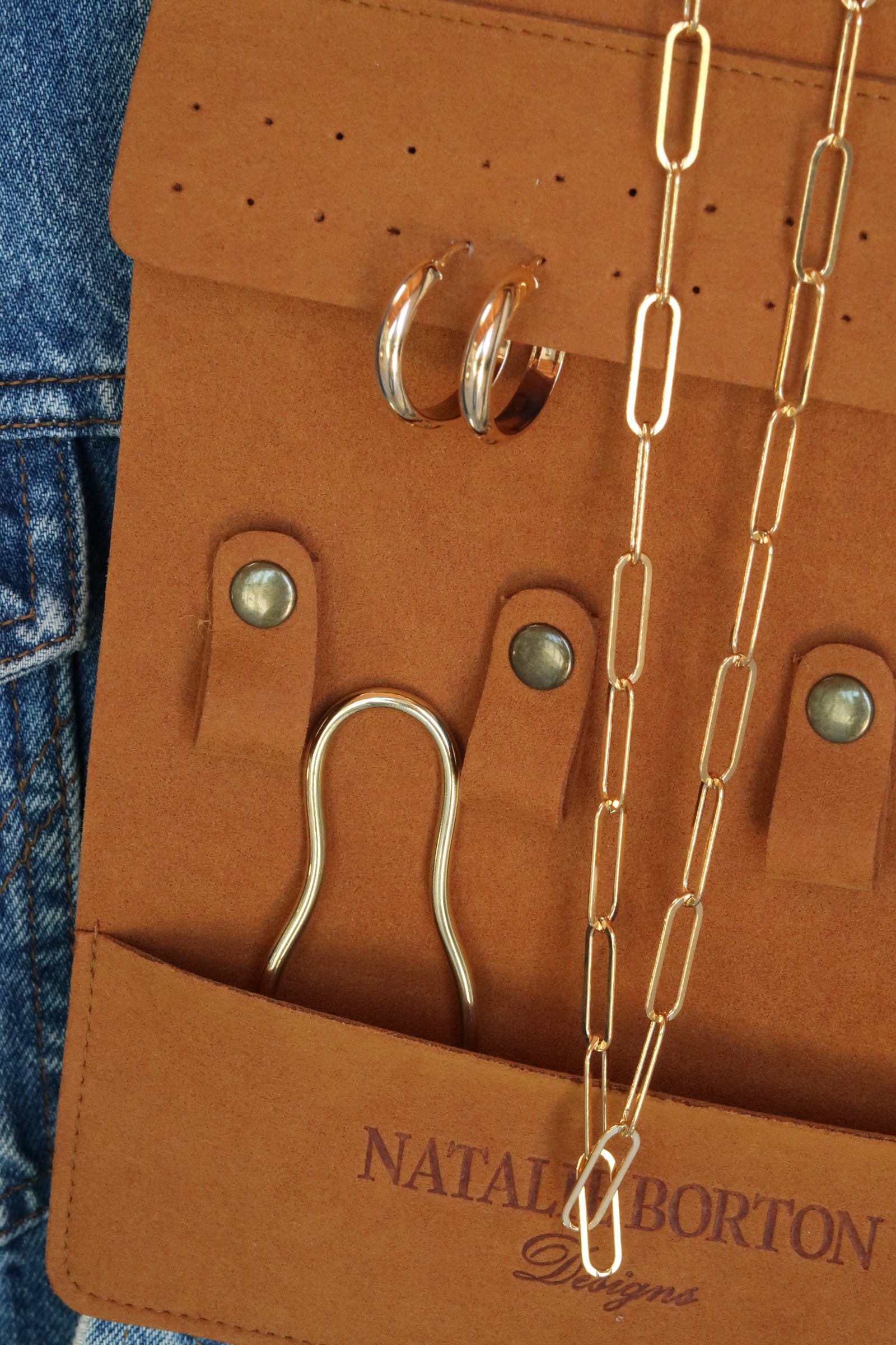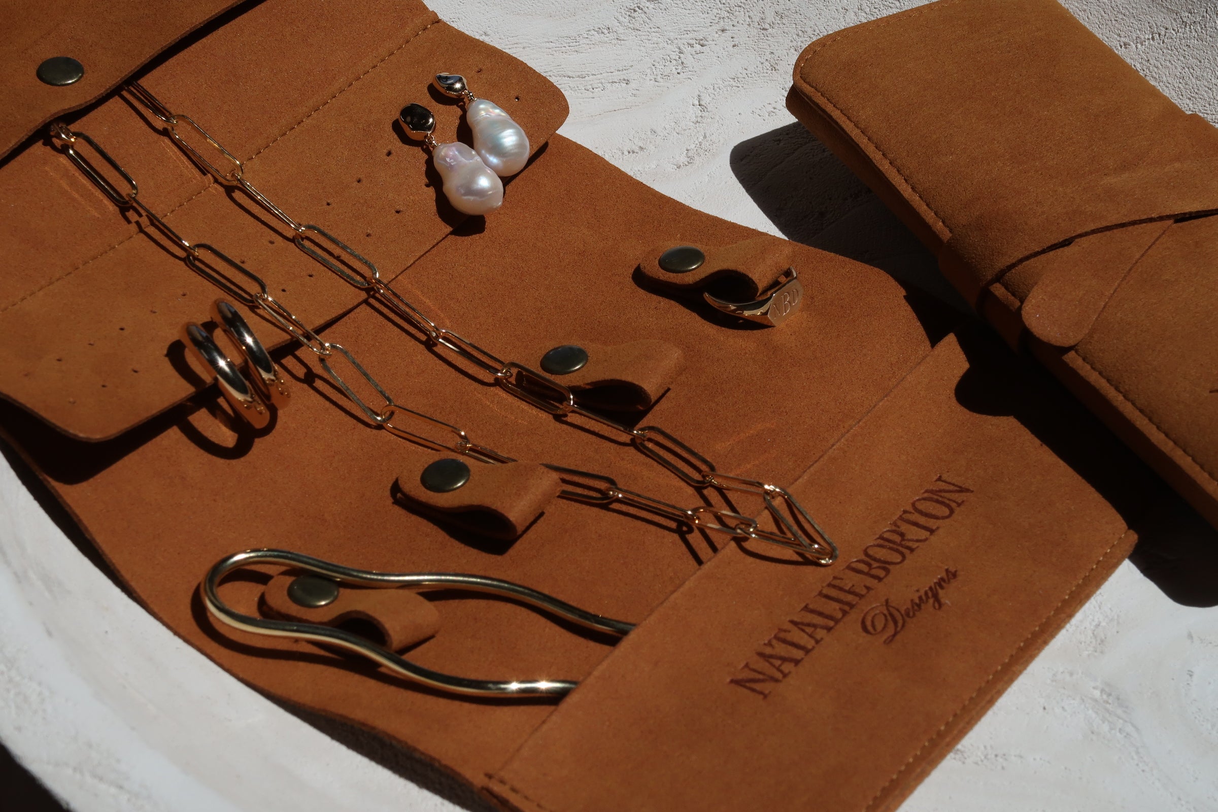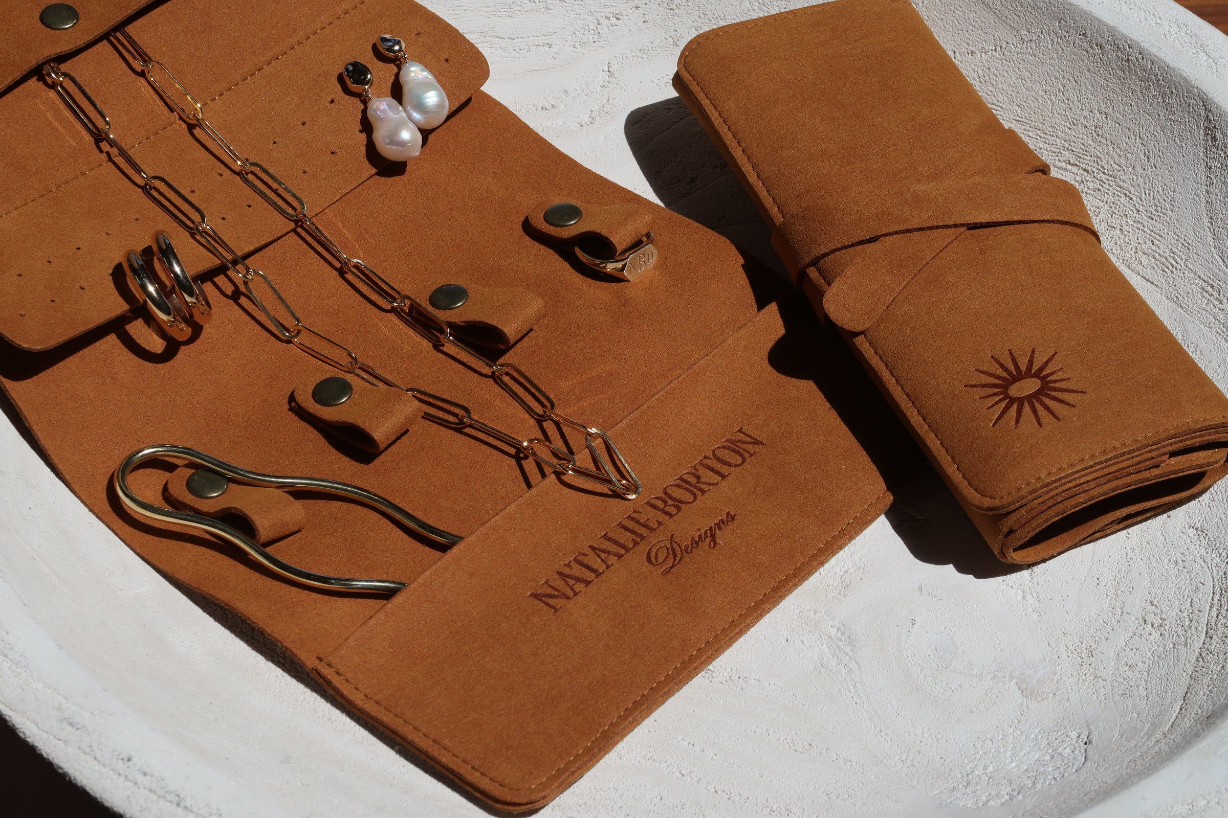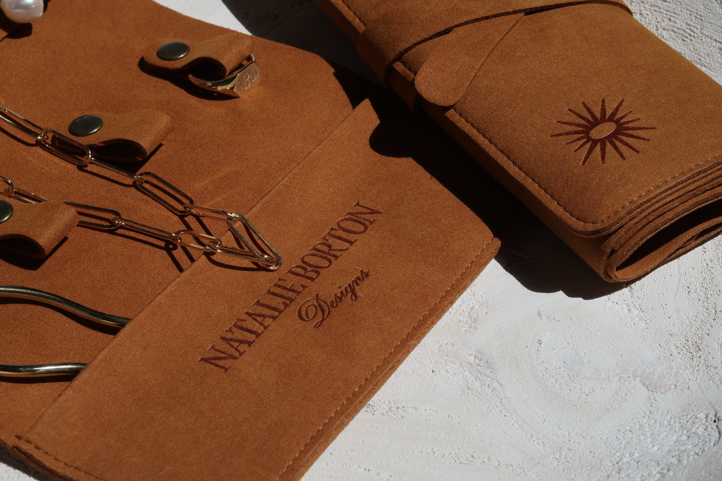 Thoughtful interior features include snap-secure loops for rings and earrings, a bar for bracelets or chains, and a roomy pocket for larger pieces, all wrapped up with a simple tie closure. Embossed with the Natalie Borton Designs logo and our signature sunburst, it’s a functional keepsake that feels as elevated as the jewelry it holds.