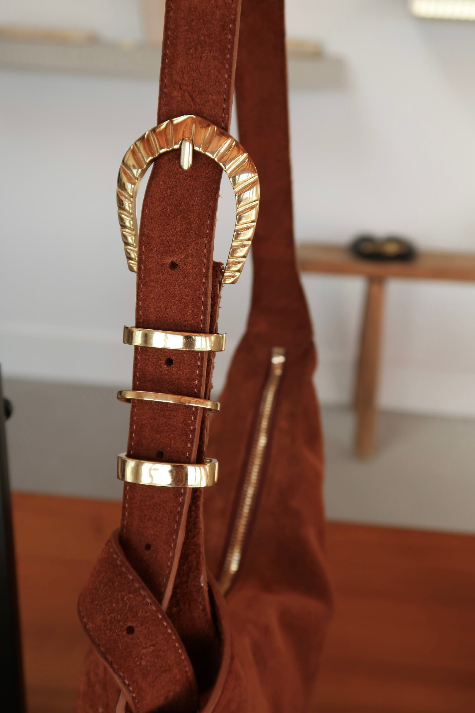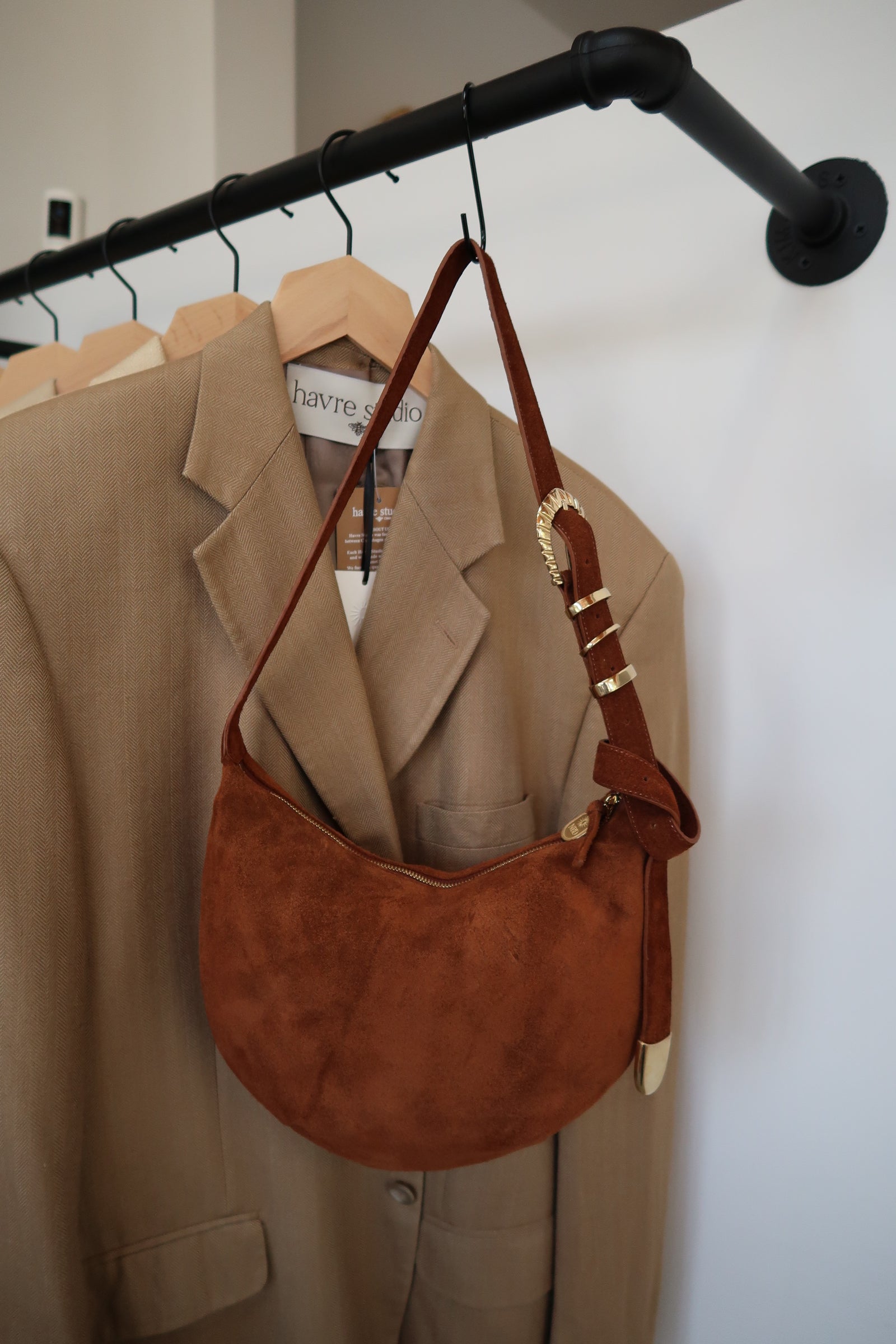 Effortless form meets intentional function. The Sera Crescent Bag is a sculptural staple — soft yet structured, minimalist yet distinctive. Handcrafted in small batches in Southern California from premium soft European-sourced suede, it now features our signature Natalie Belt hardware on the adjustable strap for a refined, cohesive finish.