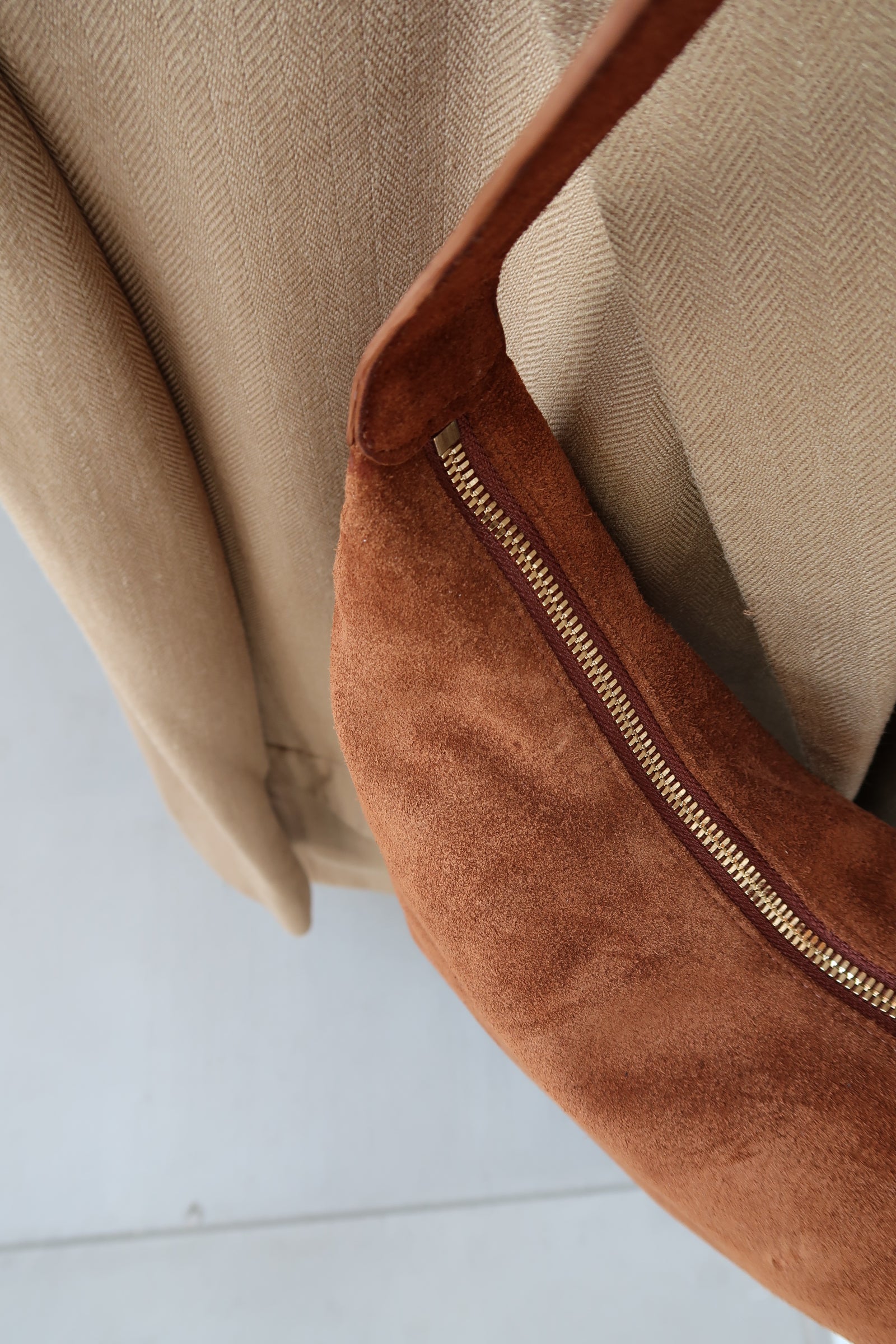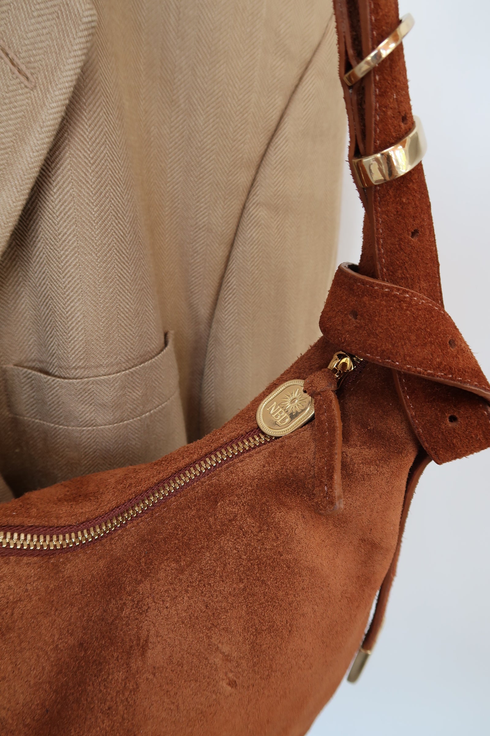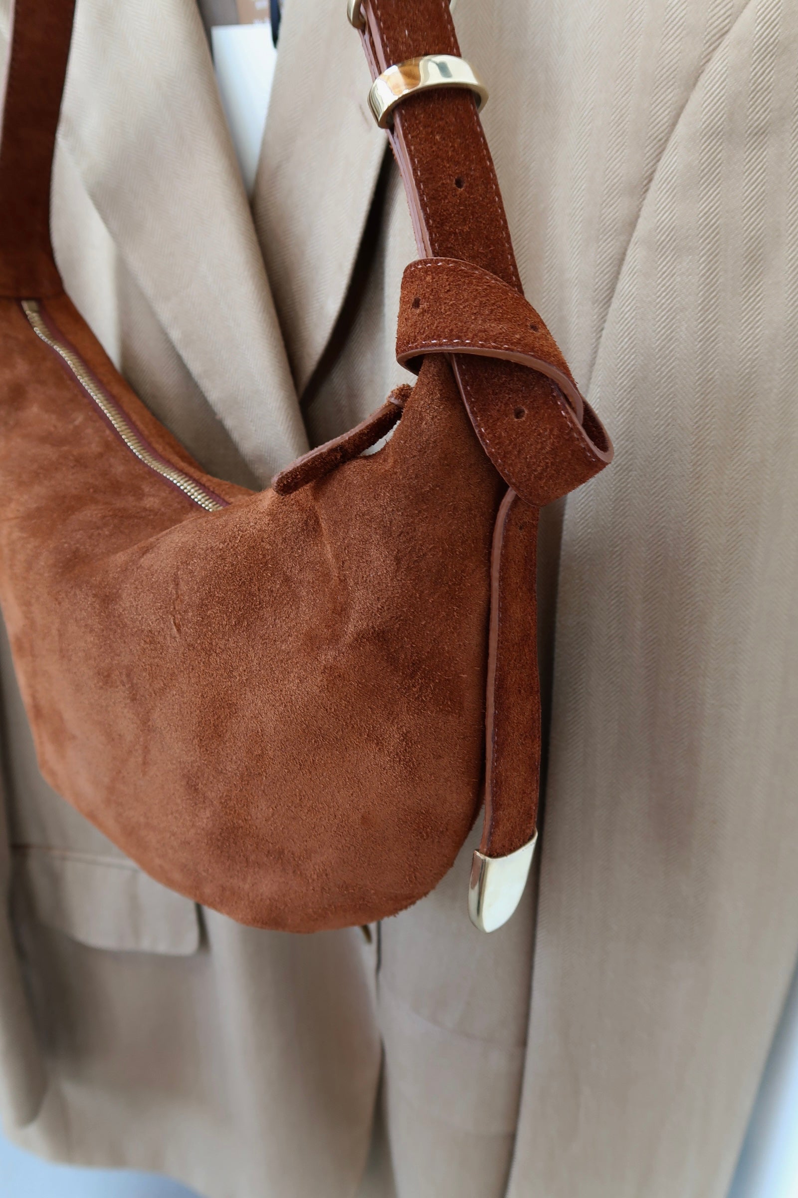 The crescent silhouette drapes beautifully against the body, offering a modern elegance that complements everything from everyday denim to tailored outerwear. Designed to adapt to your day, it can be worn crossbody, close to the chest, or casually over the shoulder. The rich suede exterior adds subtle texture and depth, while the spacious interior comfortably holds your daily essentials.