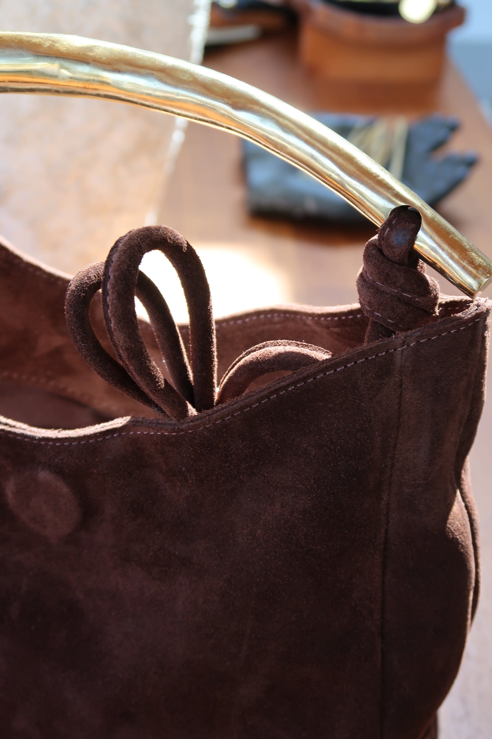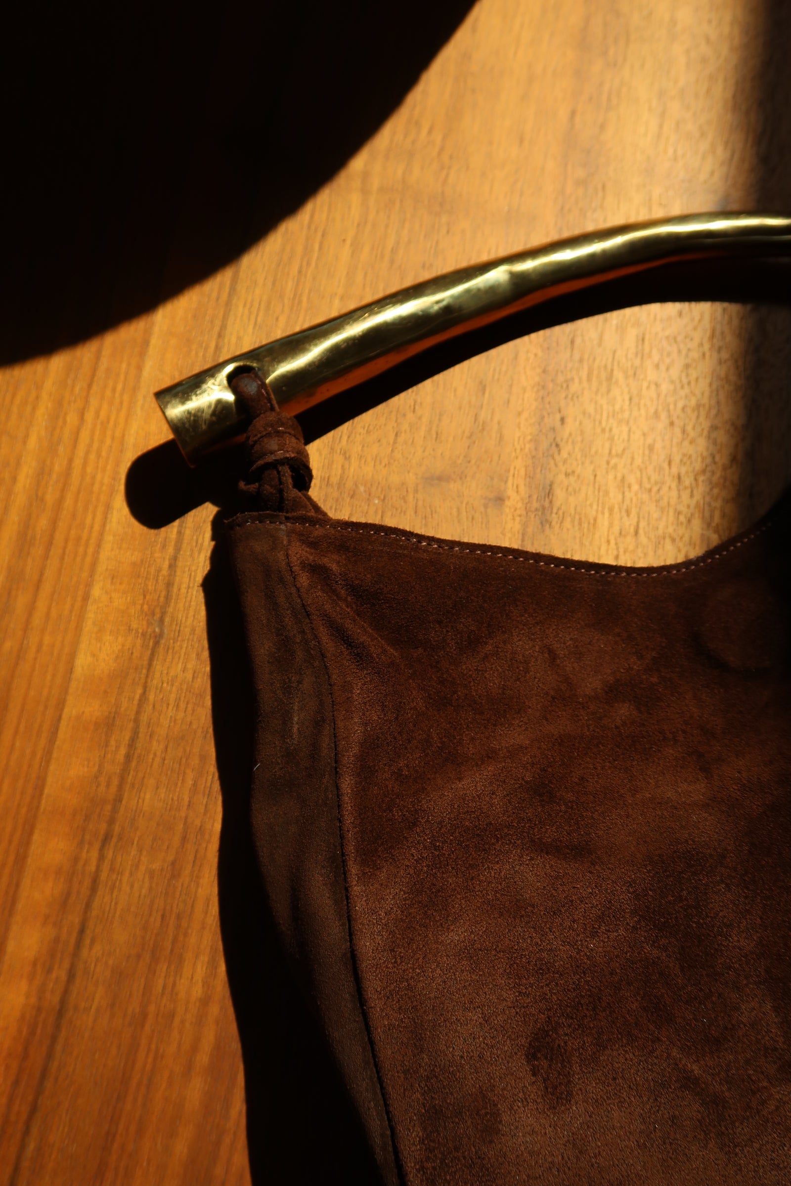 A sculptural silhouette with roots in heritage craft. The Mara Bag is distinguished by its artisan-made brass handle, a striking piece of functional art created by artisans in Kenya — where this design first came to life. Today, the bag is crafted in Los Angeles using sustainably sourced European suede, marrying global craftsmanship with our California roots.