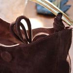 Soft chocolate brown suede offers a rich, versatile canvas, while the removable crossbody strap adds effortless versatility — wear it tucked inside for an architectural handheld look or attach it when the day calls for ease.
