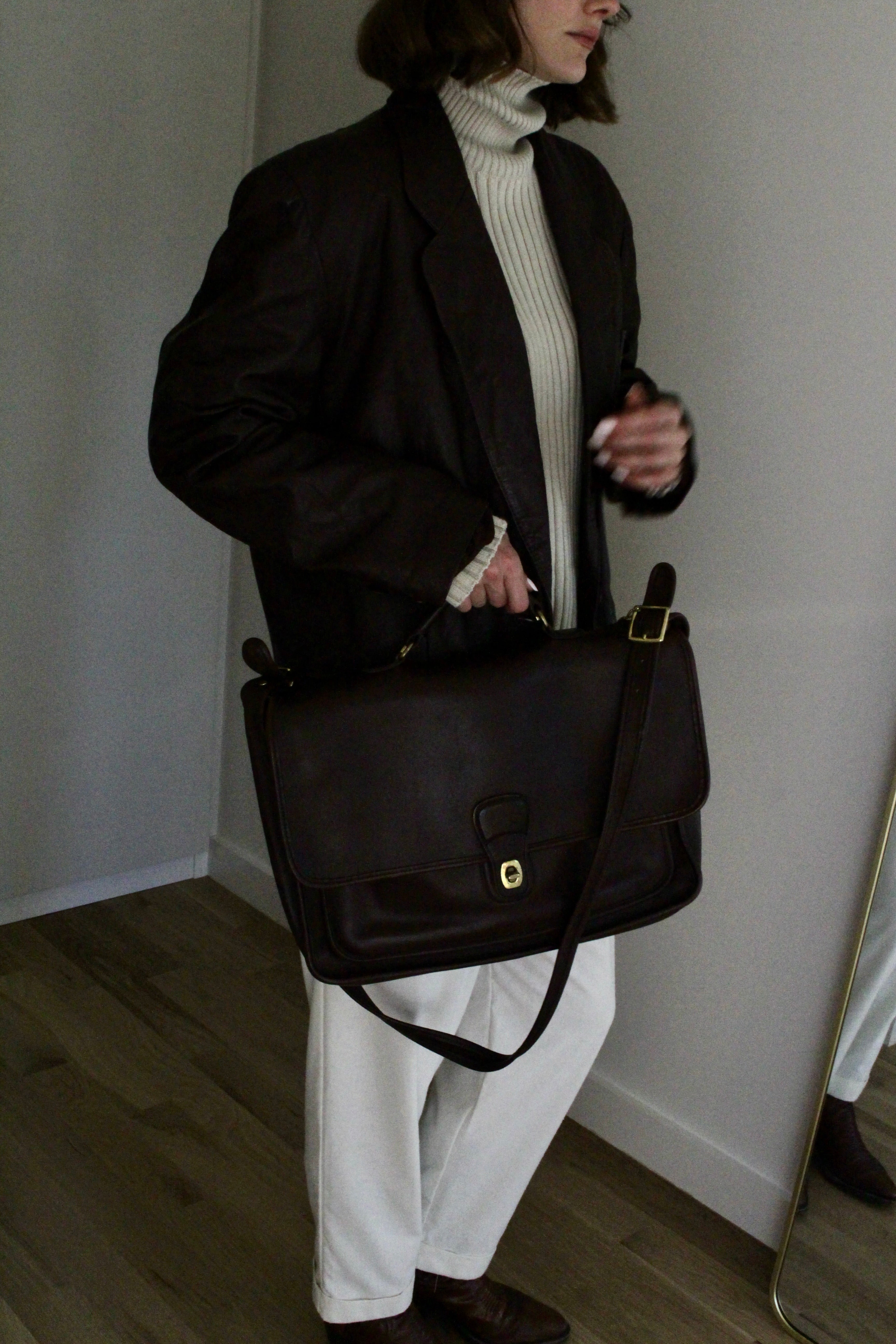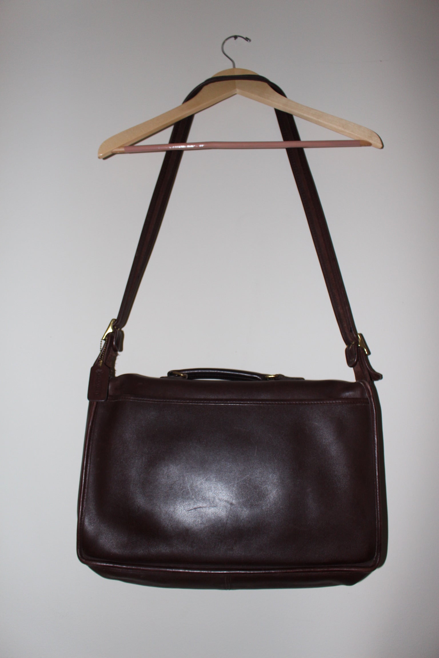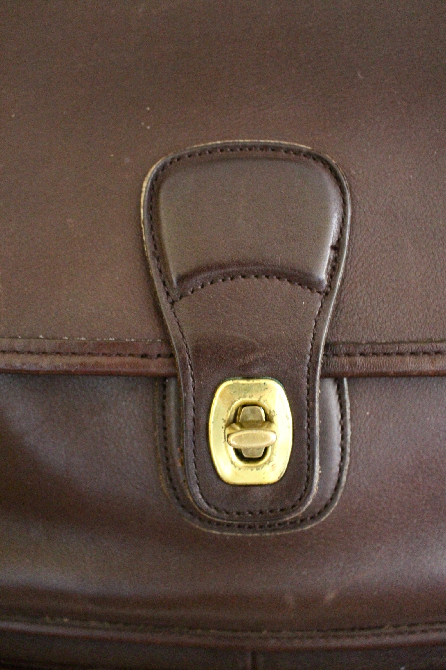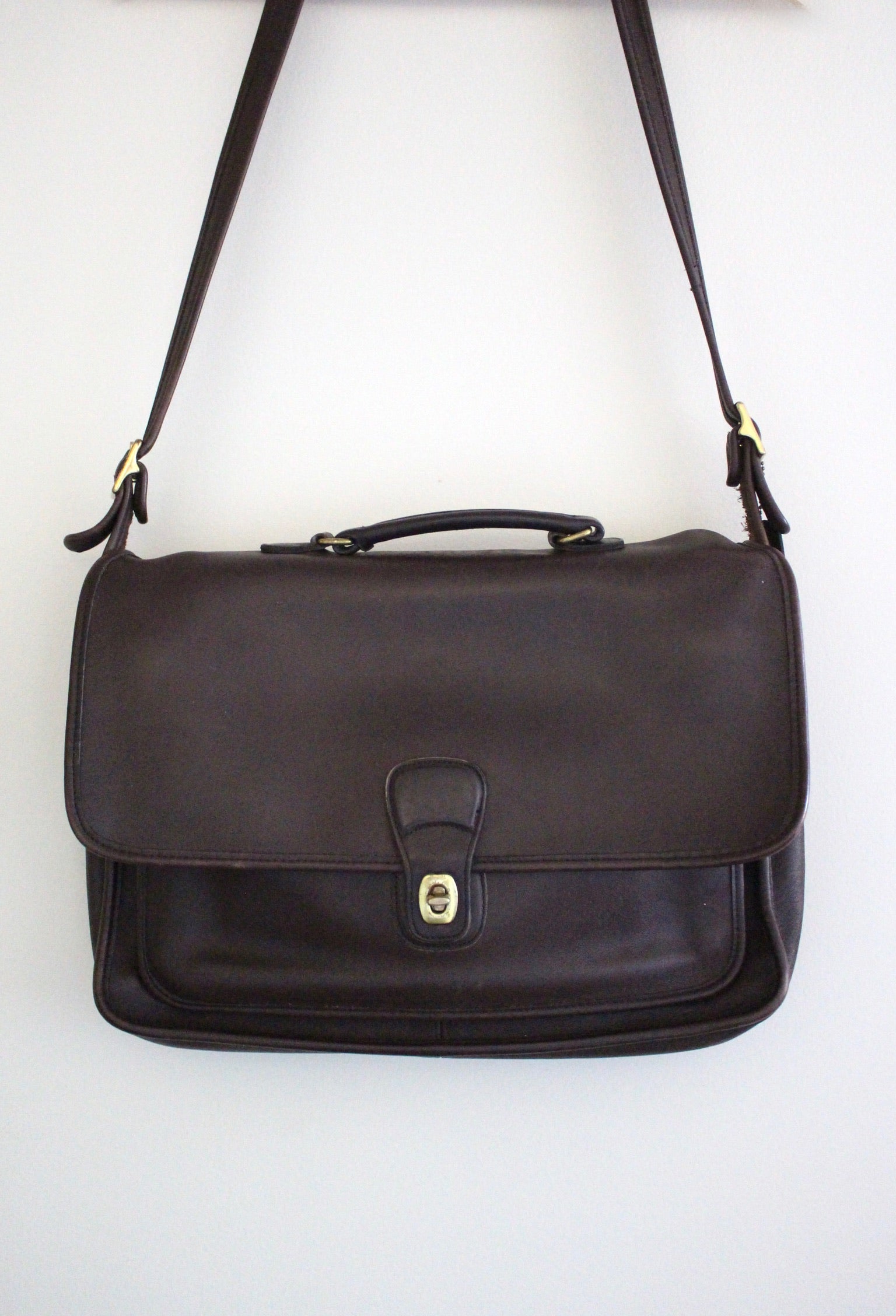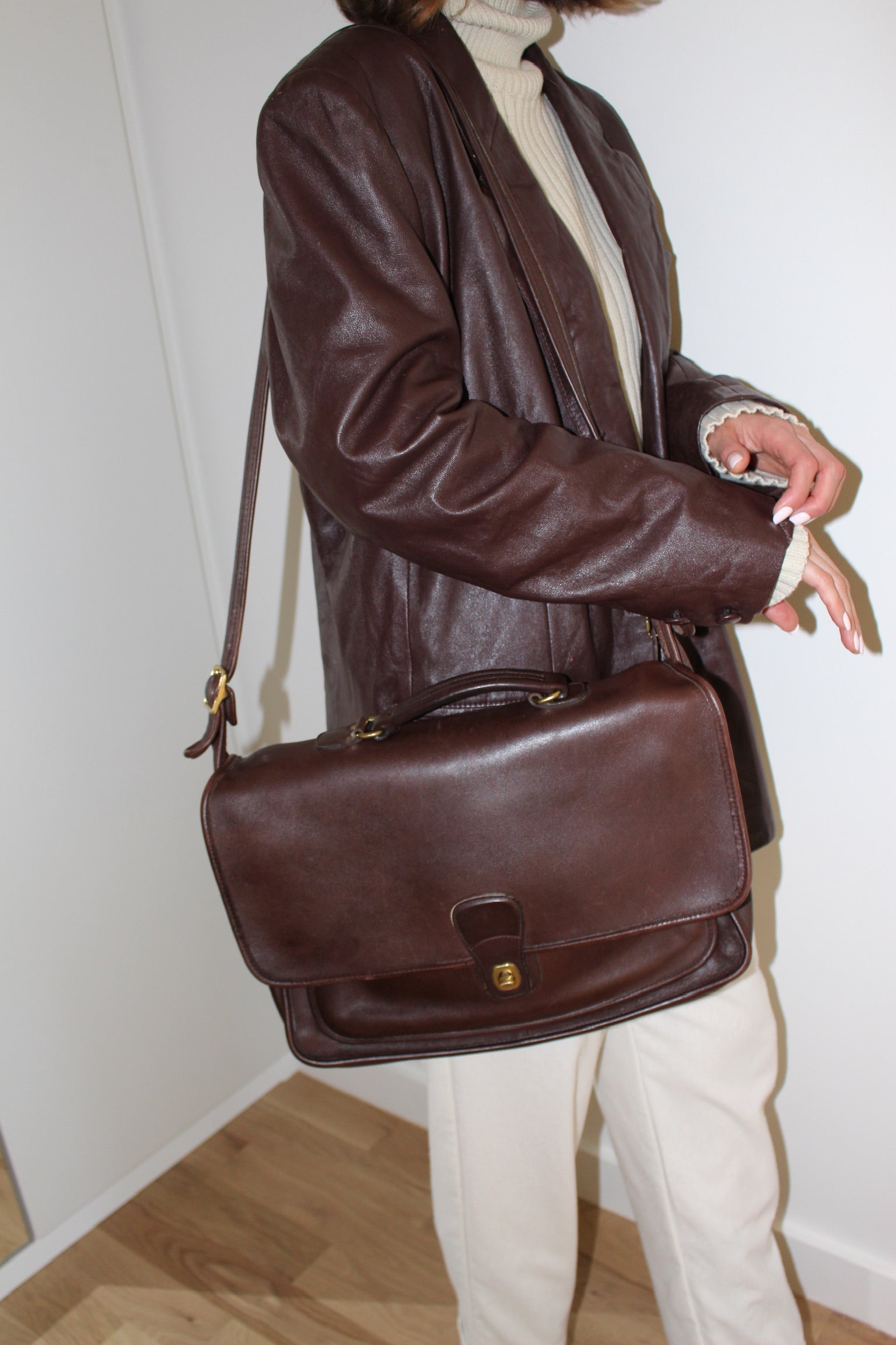 Amazing vintage Coach briefcase in impeccable condition! This bag is made of a luxuriously smooth leather and set in a deep chestnut brown tone. Features a large outer compartment, a signature turnkey closure, brass hardware and both a top handle & long shoulder strap. The interior consists of several compartments in various sizes - perfect to organize all your personal items!