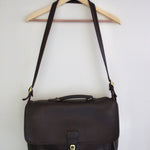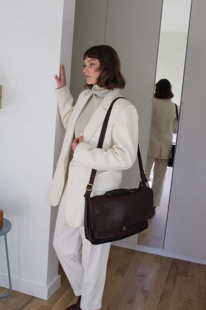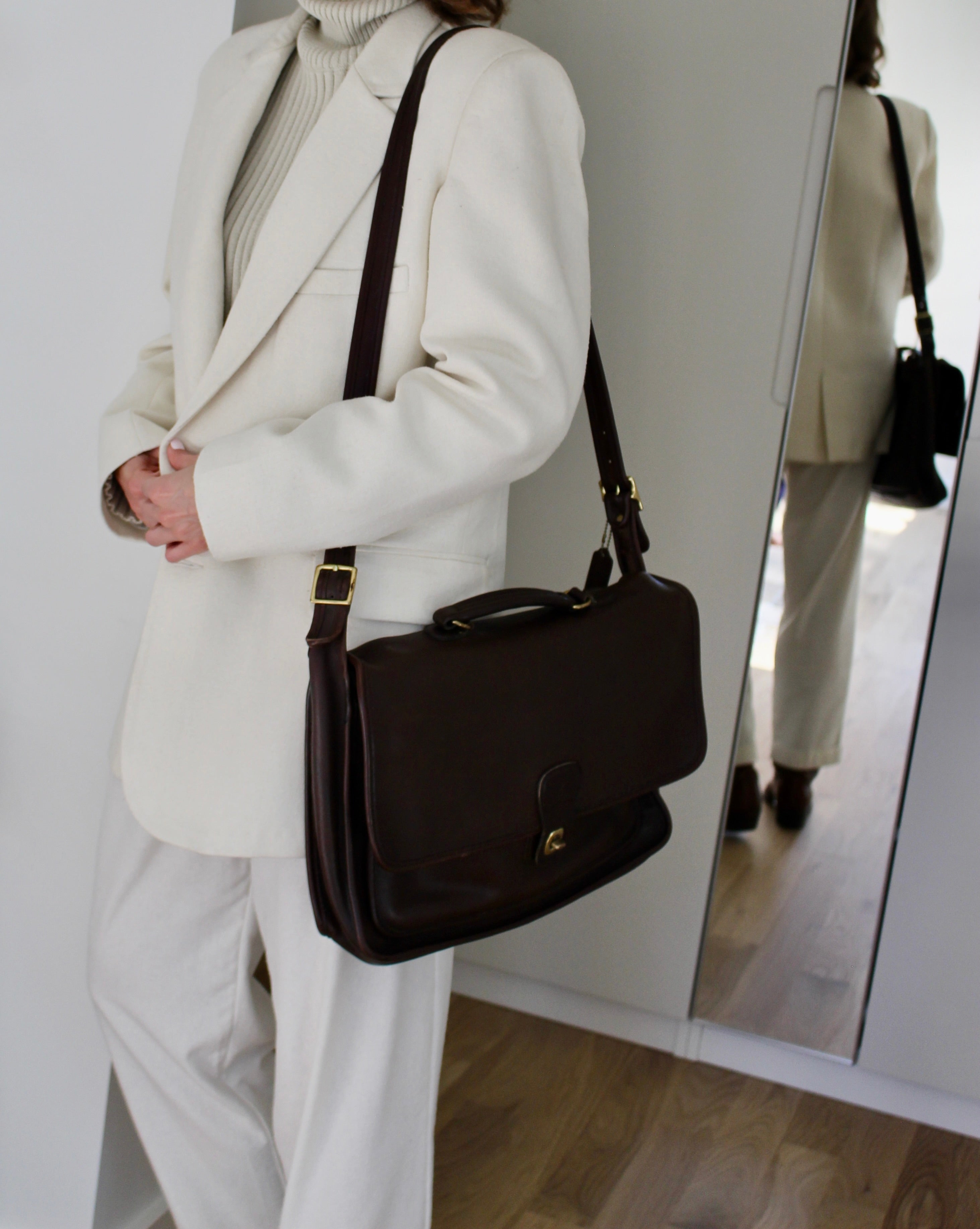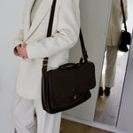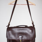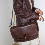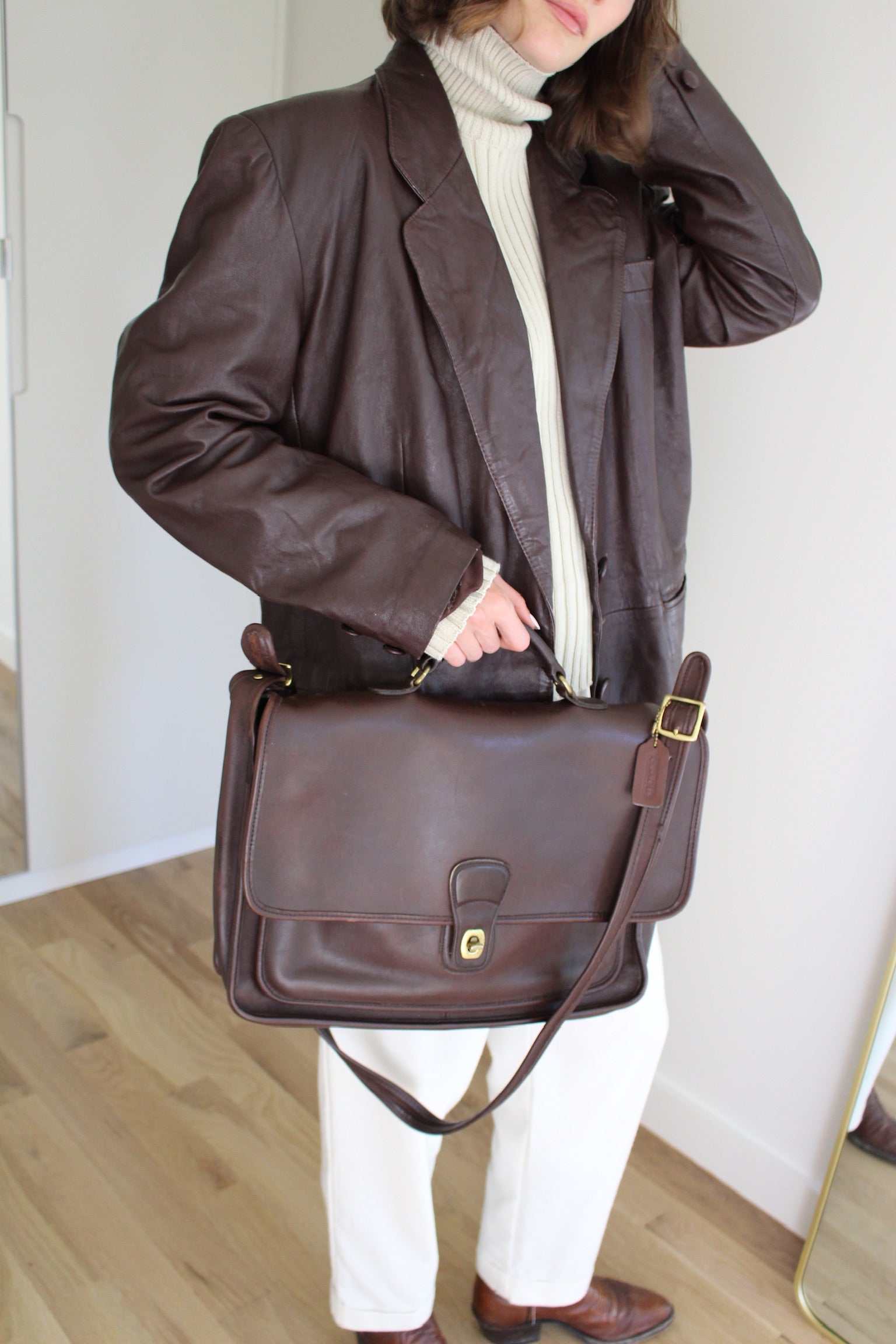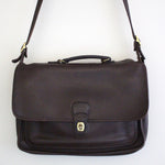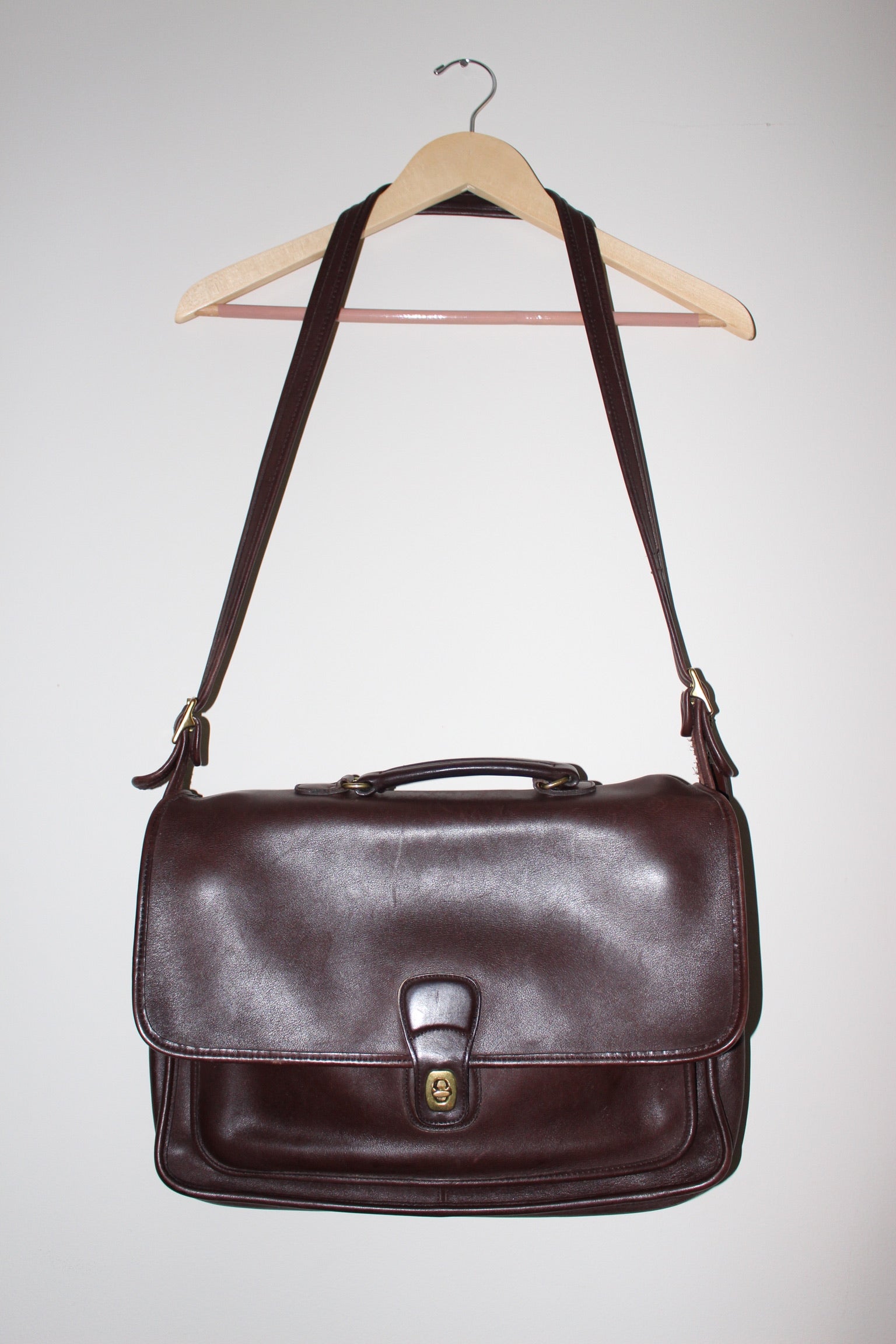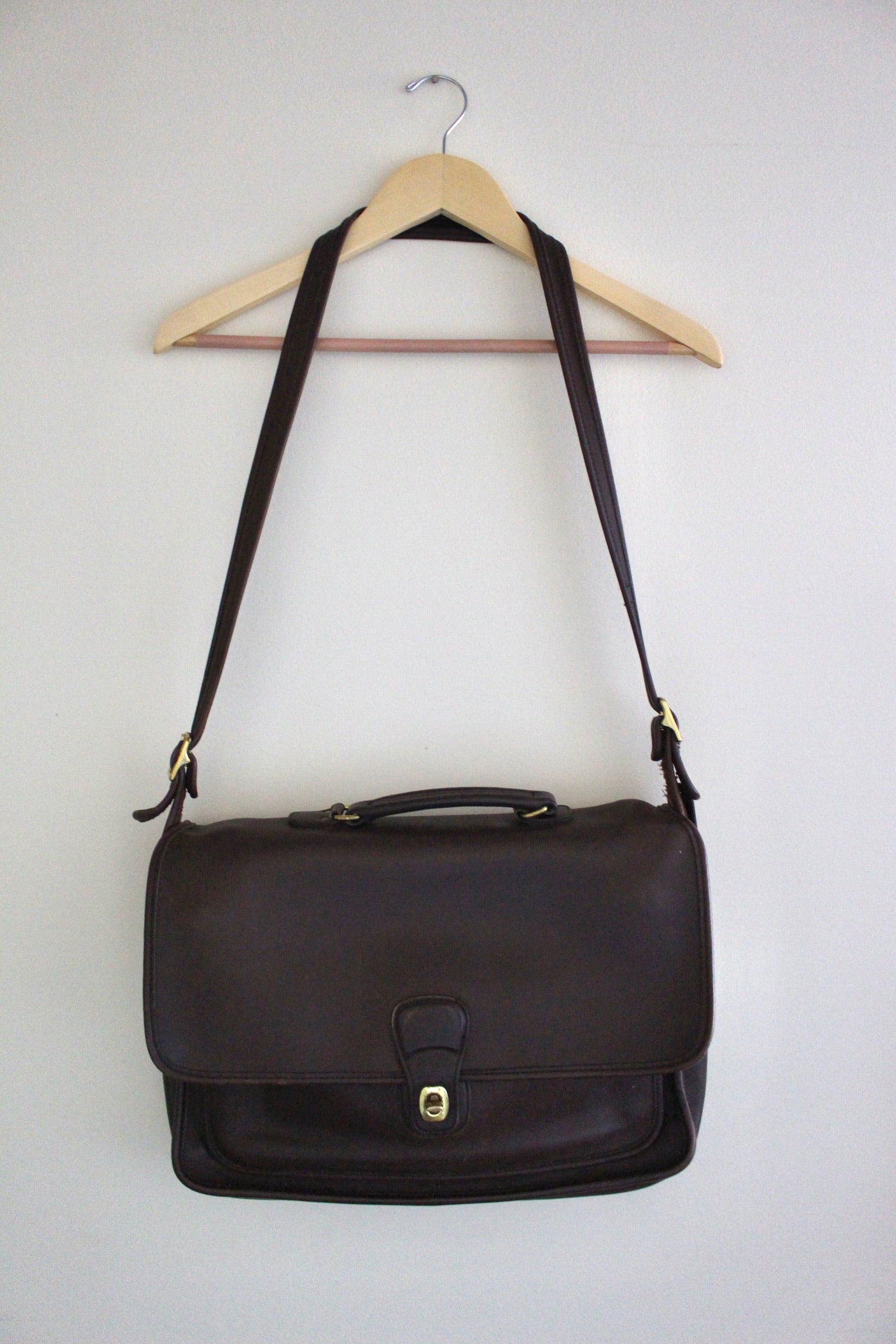 Amazing vintage Coach briefcase in impeccable condition! This bag is made of a luxuriously smooth leather and set in a deep chestnut brown tone. Features a large outer compartment, a signature turnkey closure, brass hardware and both a top handle & long shoulder strap. The interior consists of several compartments in various sizes - perfect to organize all your personal items!