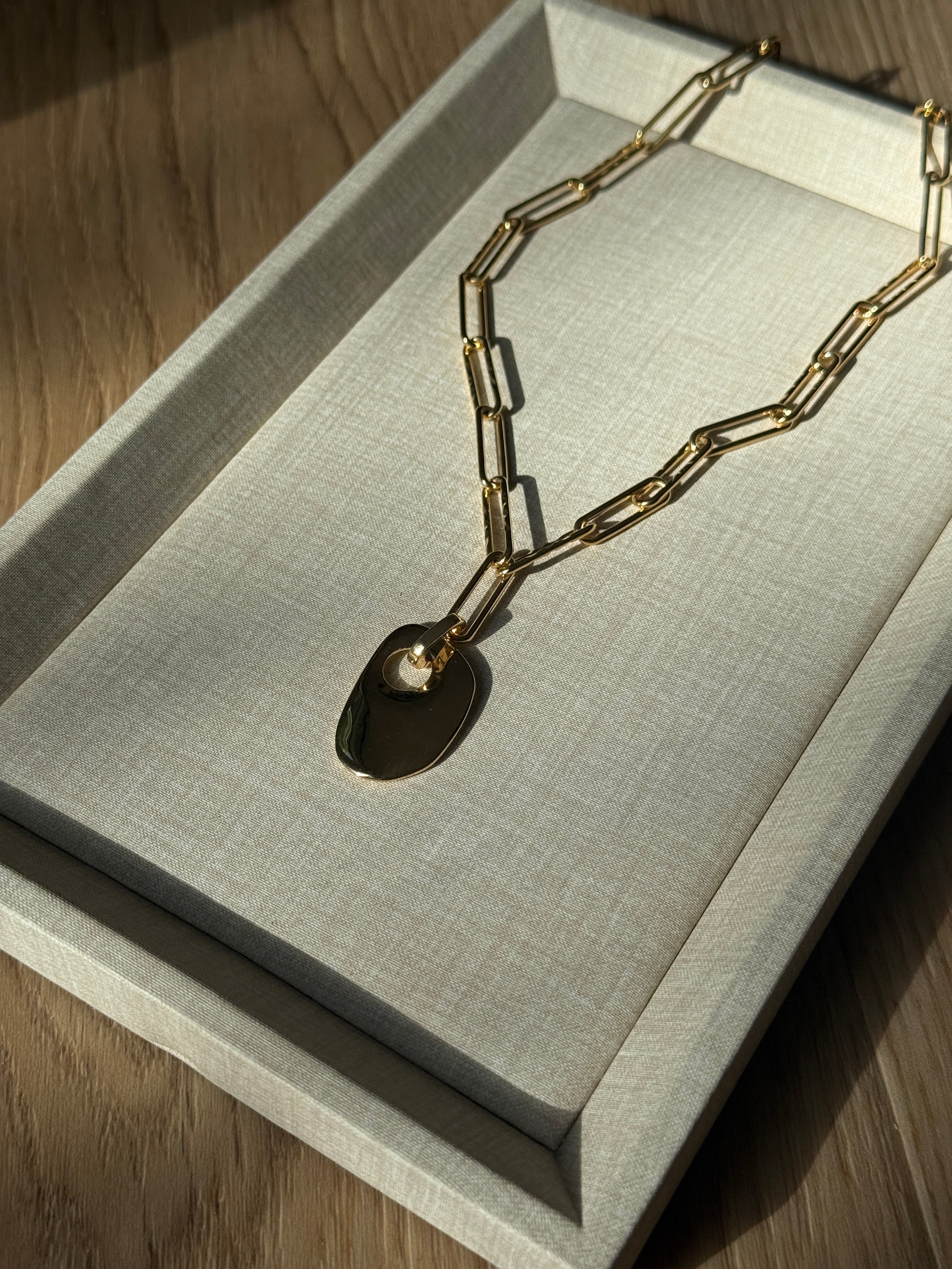 Large | Designed to pair with the Marlowe Link Chain. More elongated vertically, creating a longer, more architectural line. Includes a removable bail for easy attachment.