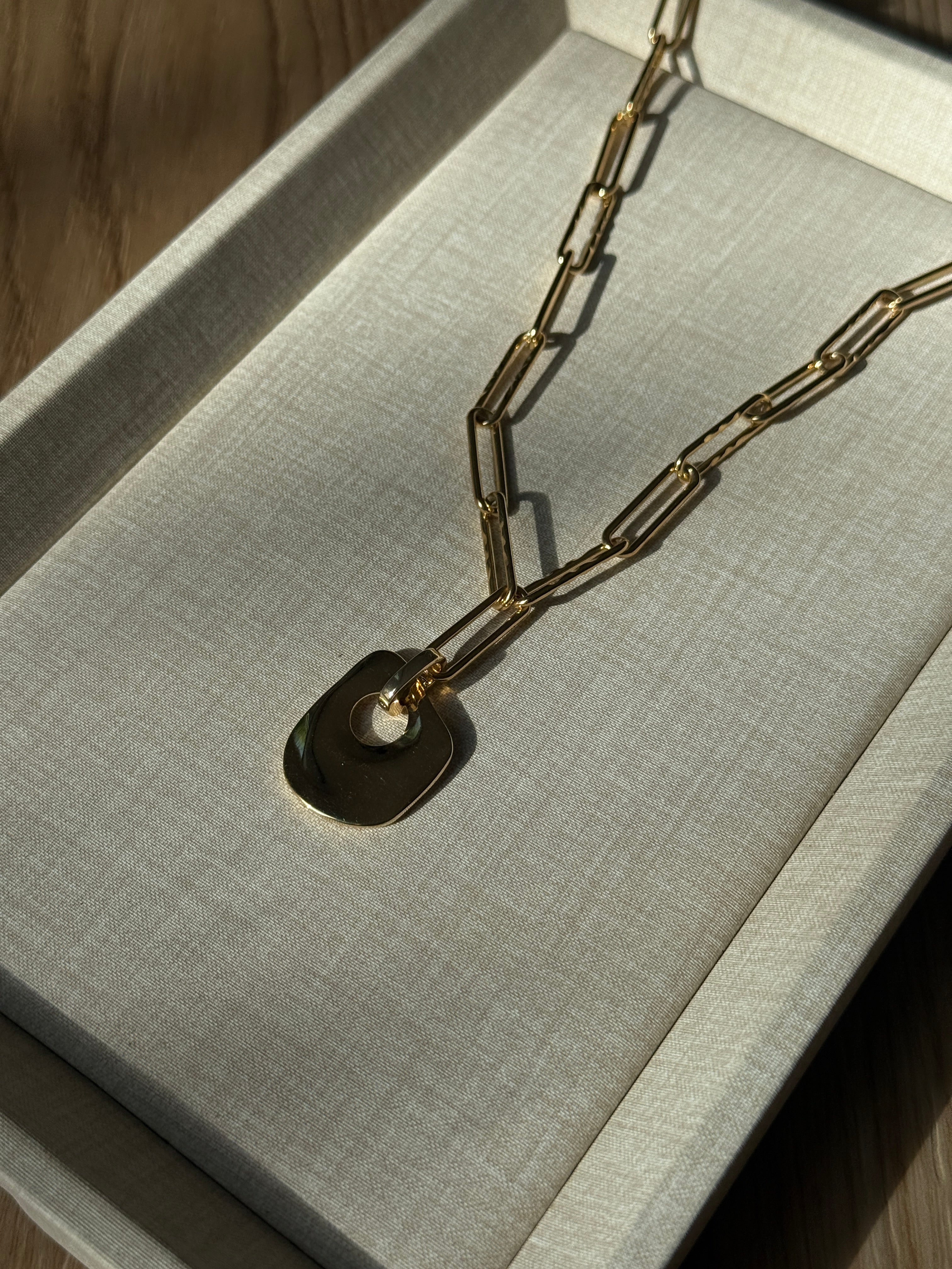 Medium | Designed to pair with the Marlowe Link Chain. Slightly more square in proportion, offering balance and a grounded presence. Includes a removable bail for easy attachment.