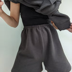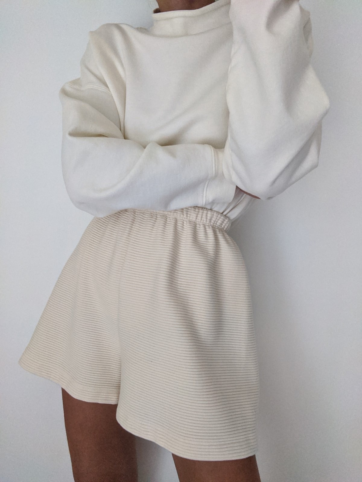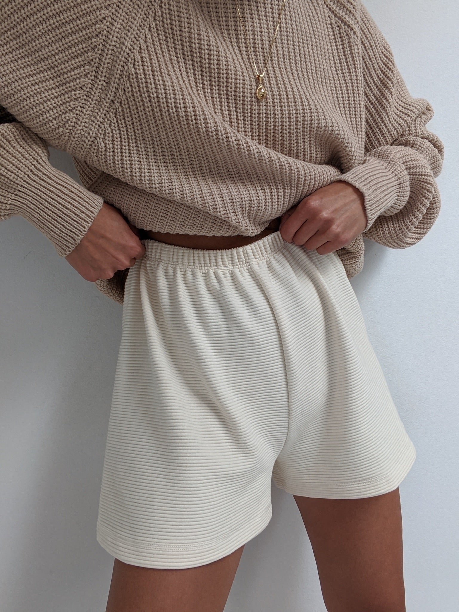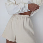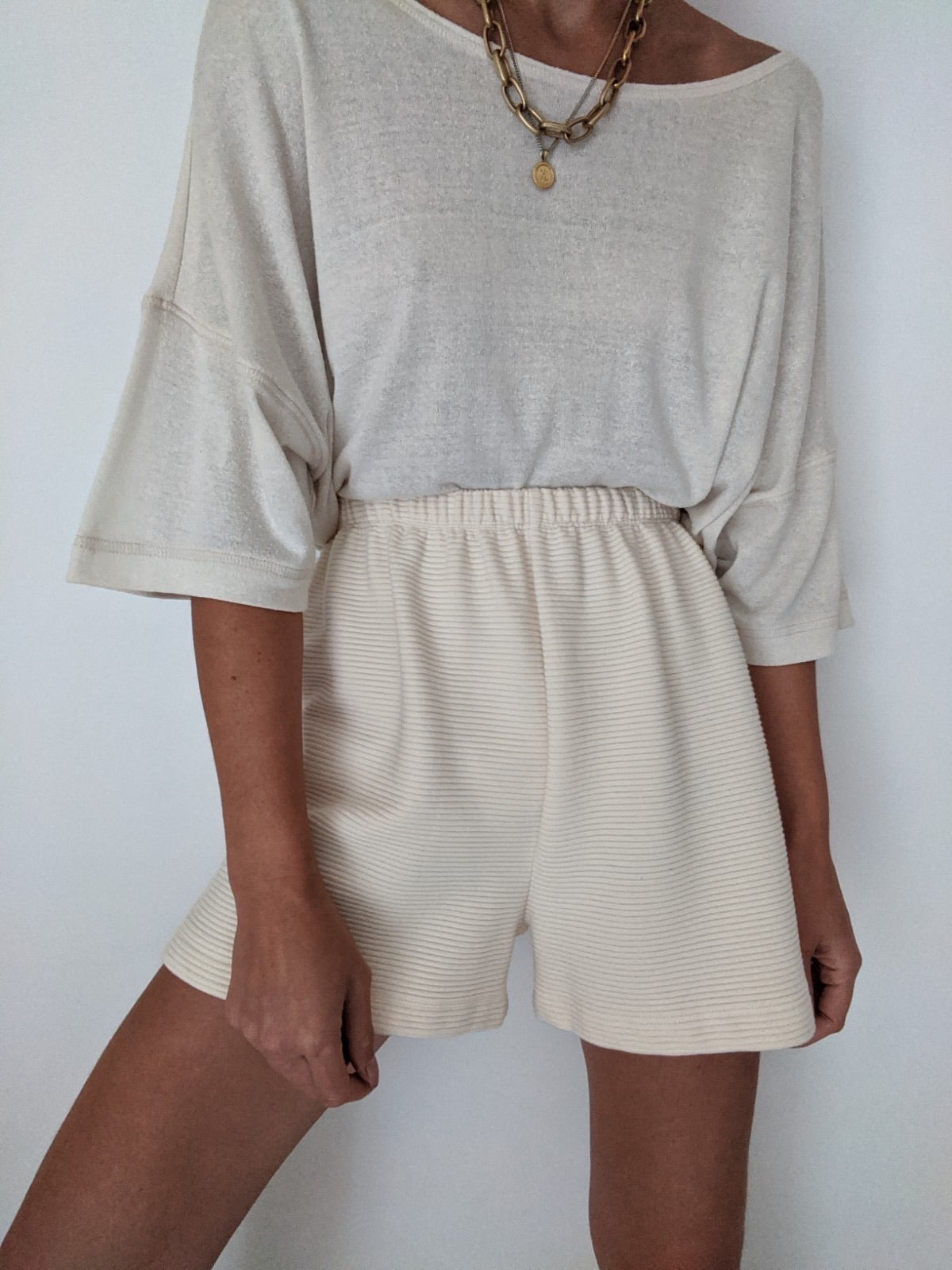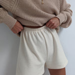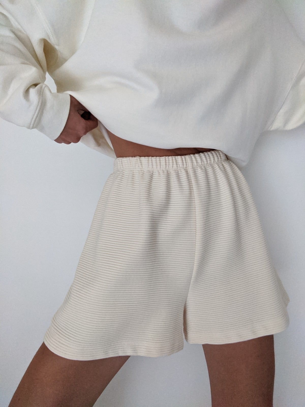 An all-season, easy pull-on short to pair with coordinating pieces from our In-House Collection as well as favorites from one's own closet. The Chloe Shorts in Rippled Cotton features an easy elastic waist with a relaxed, yet clean fit. The exquisite rippled fabric has an incredibly soft yet substantial hand, reminiscent of our favorite vintage pieces. We envision them paired with pieces from our In-House Sweats Collection.