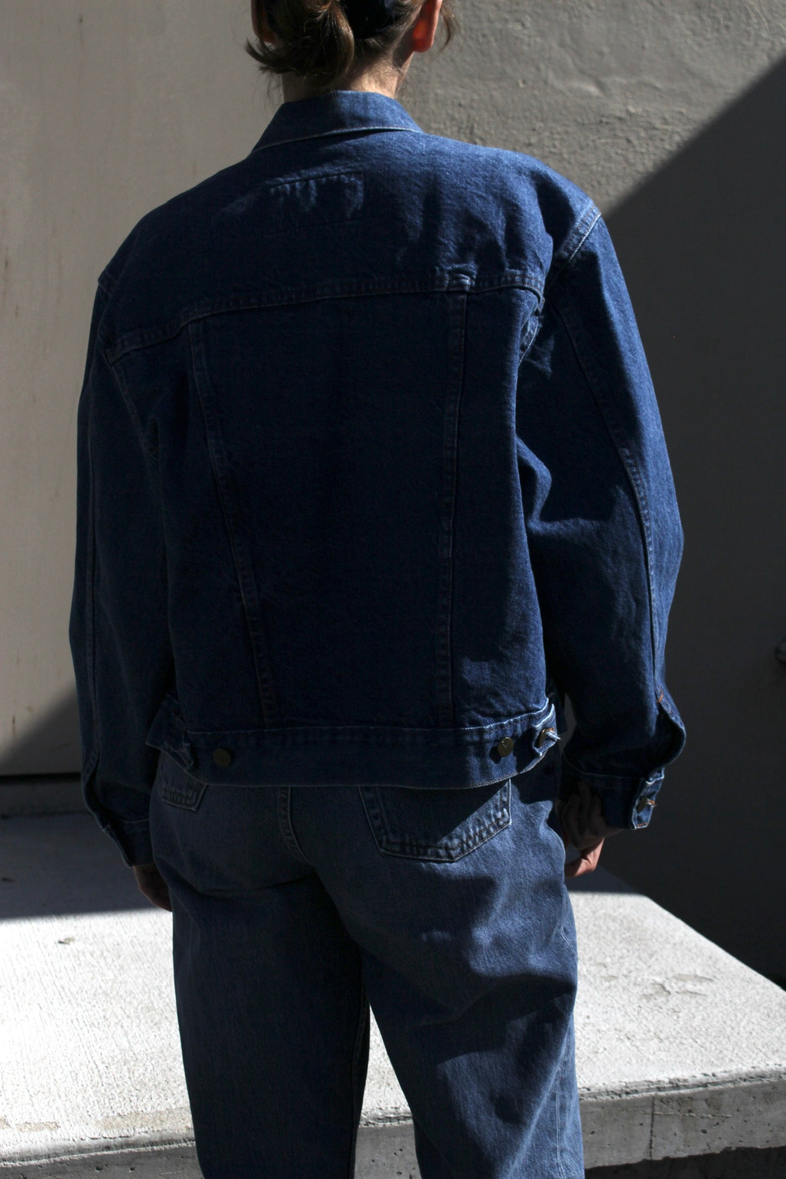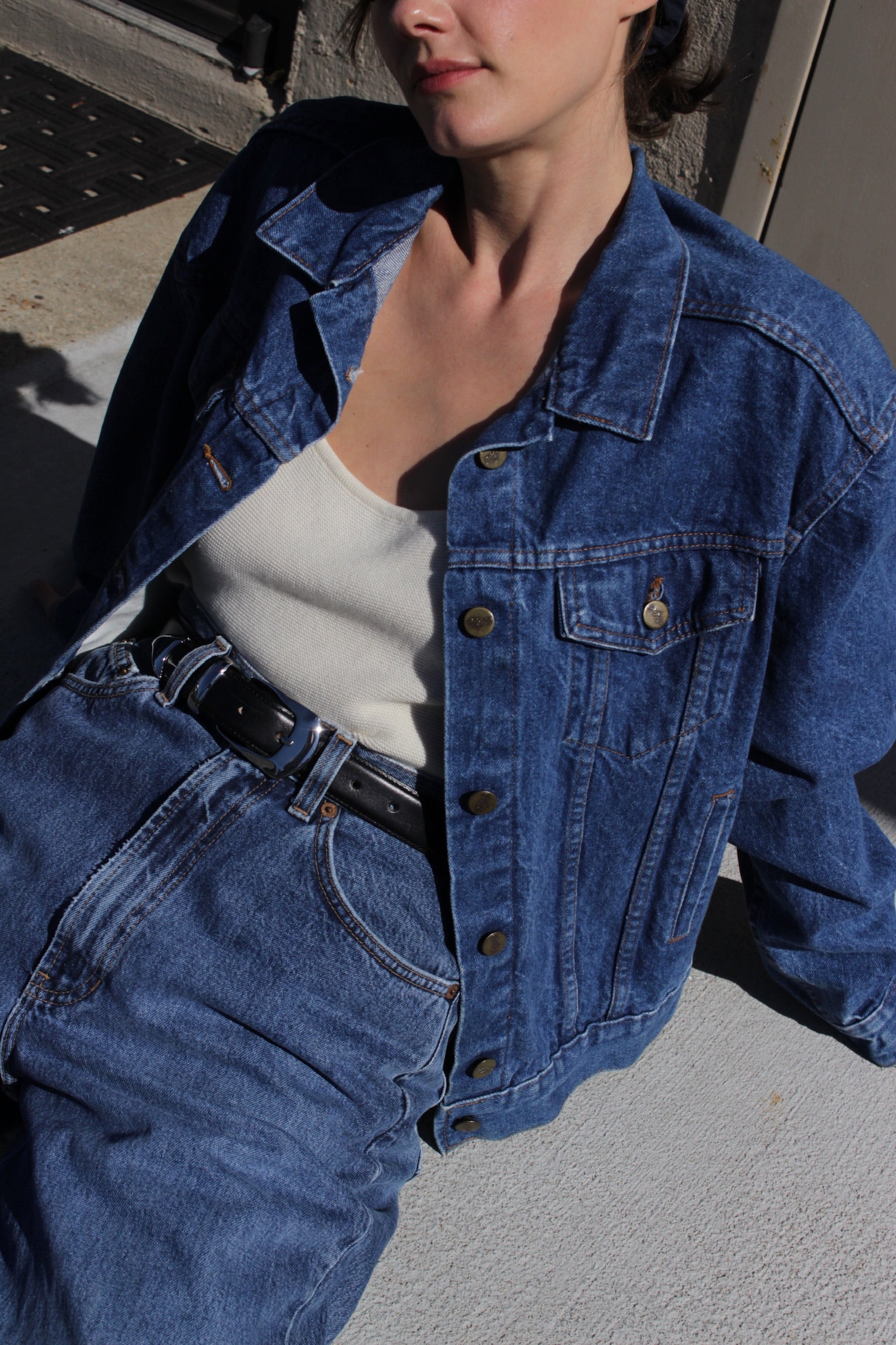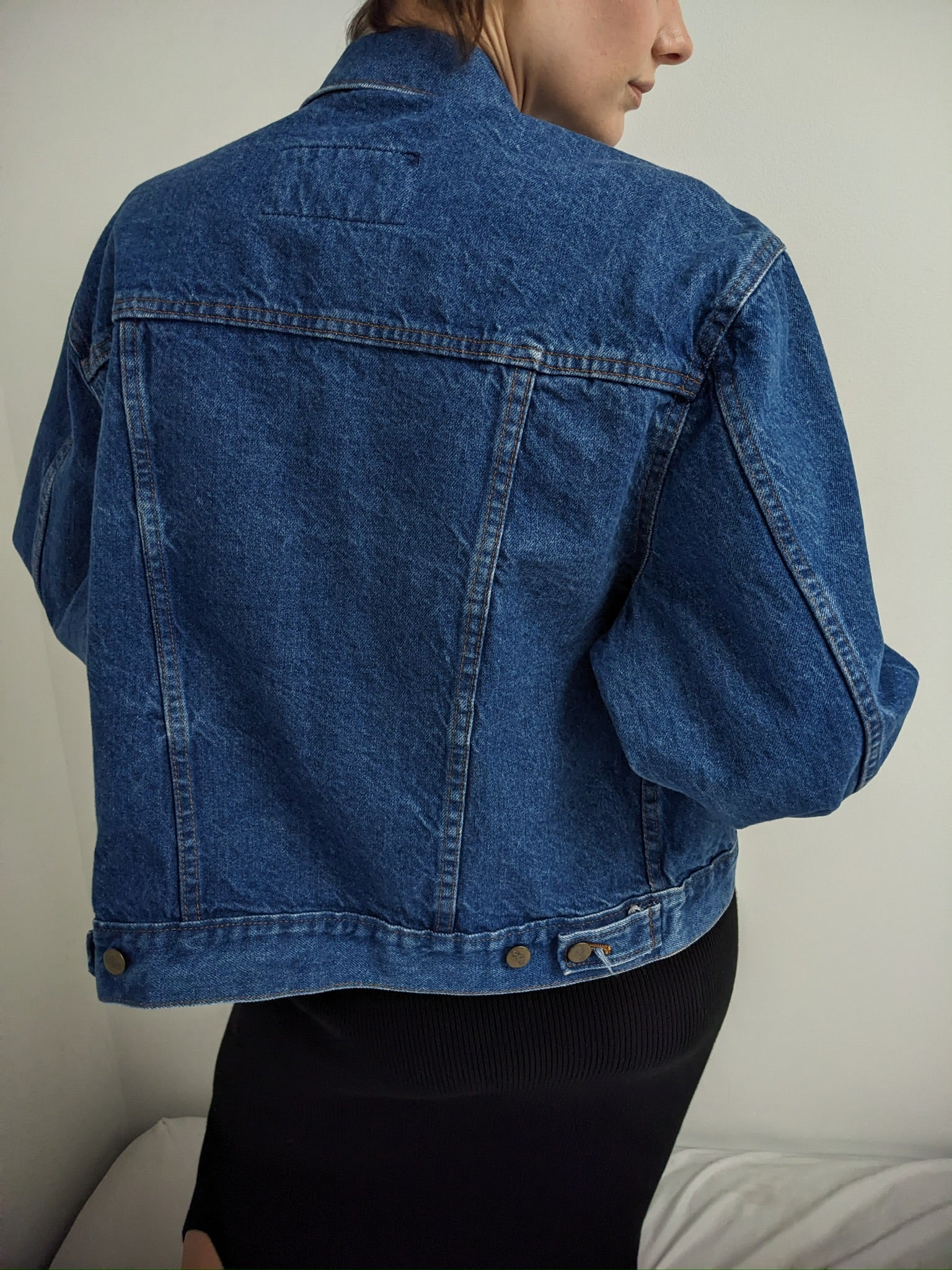 Classic cut vintage denim jacket features a classic blue wash with a collared neckline, two front pockets, and brass-toned buttons.