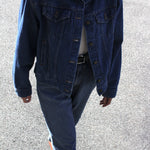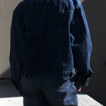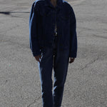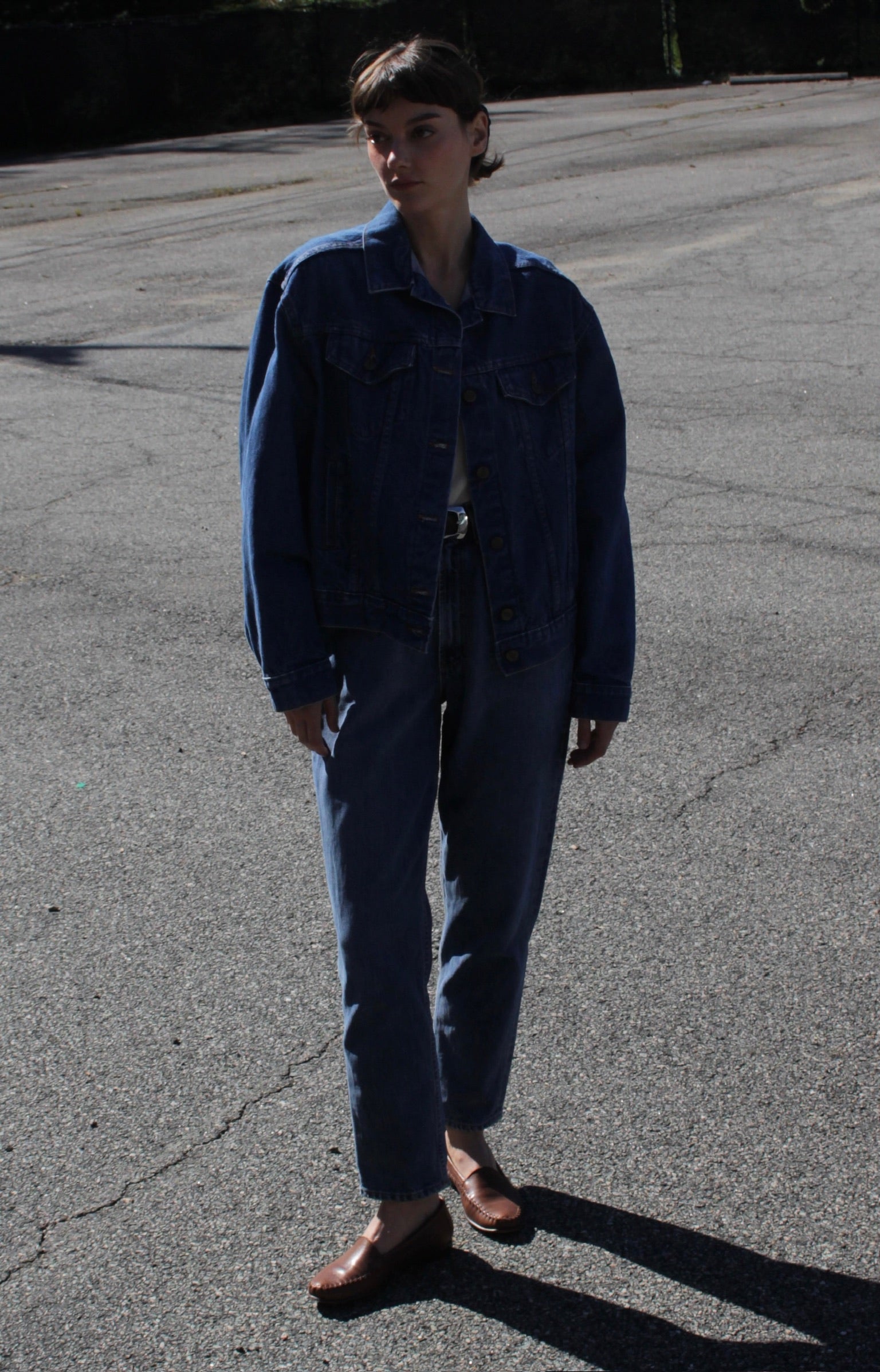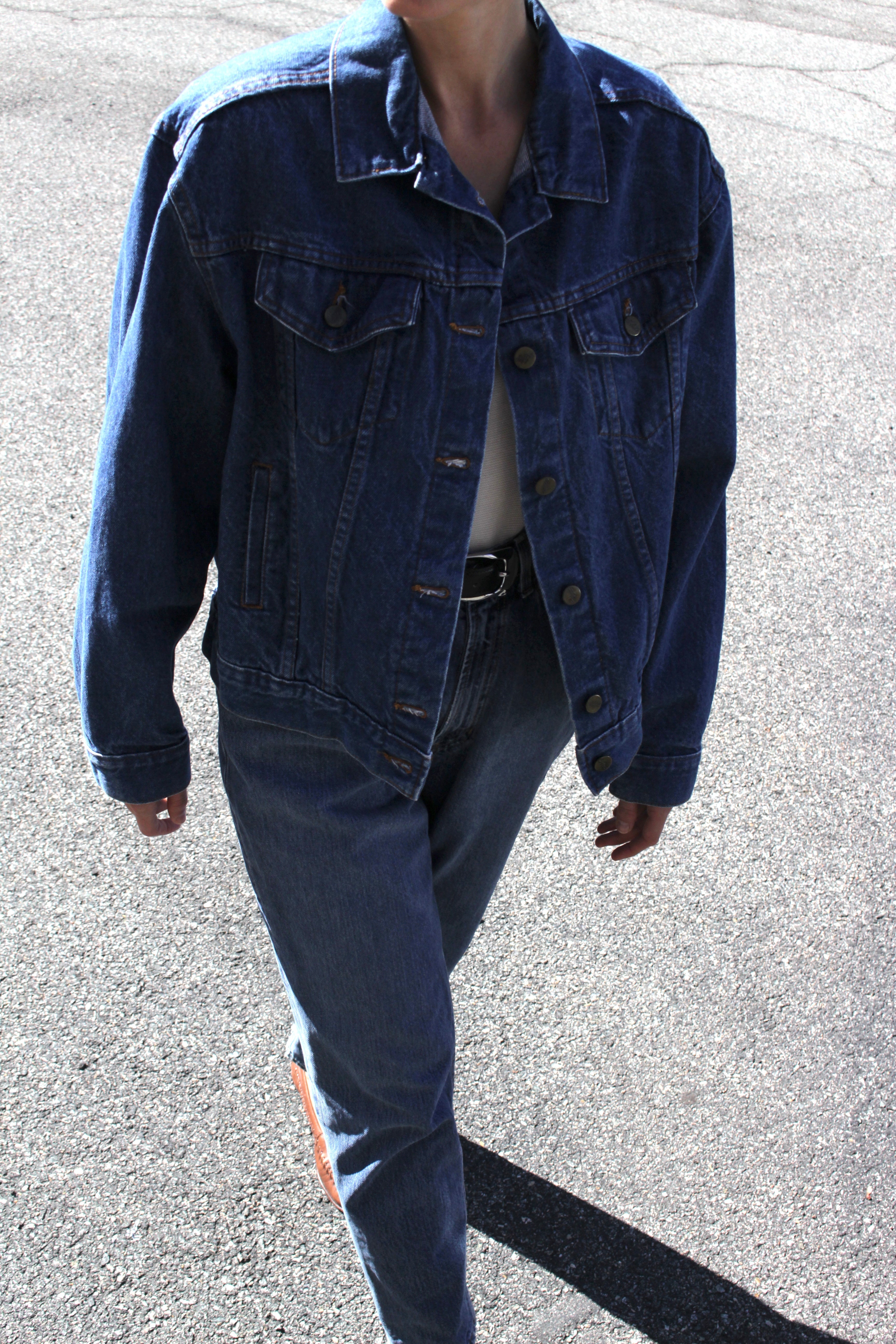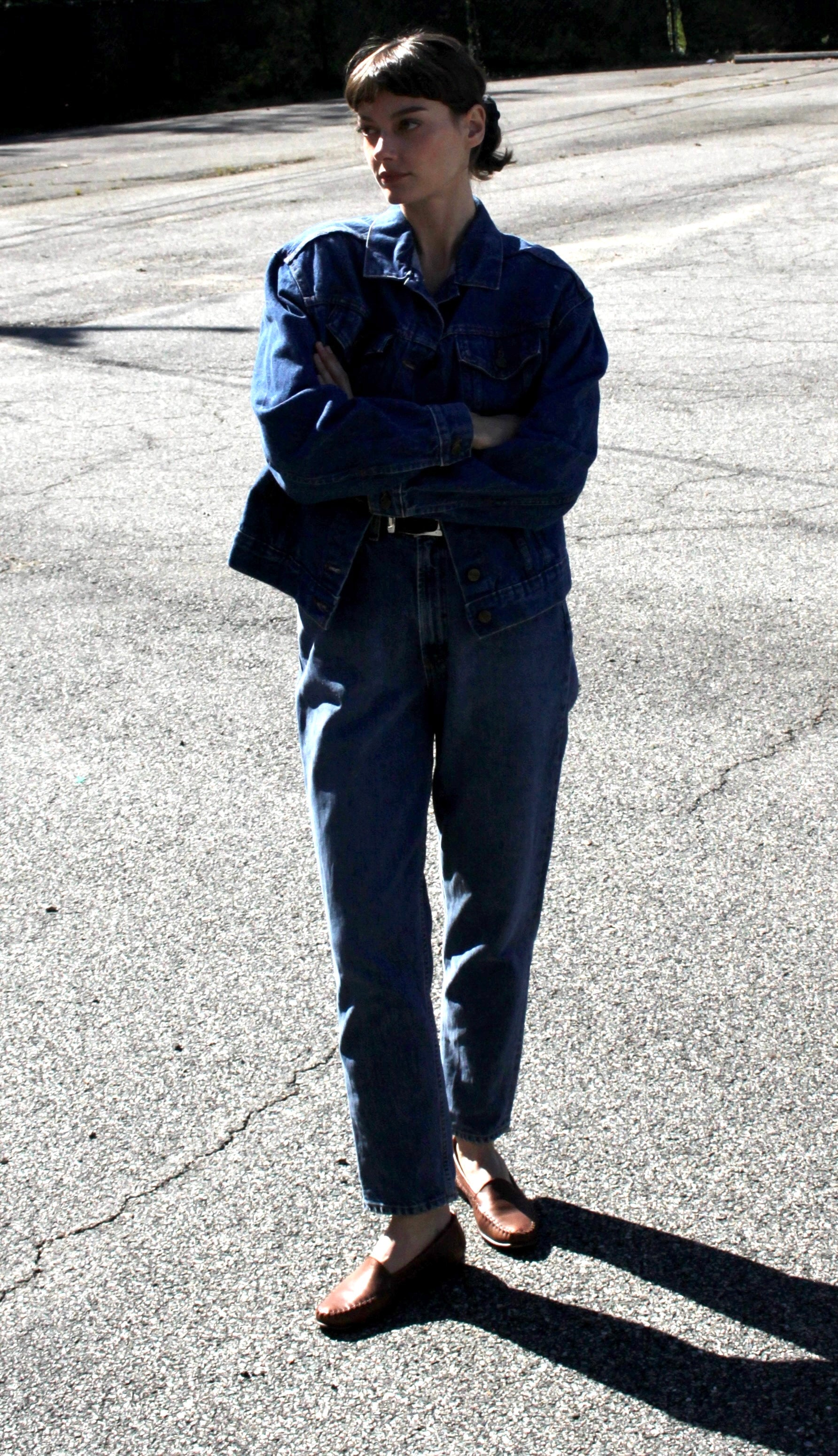 Classic cut vintage denim jacket features a classic blue wash with a collared neckline, two front pockets, and brass-toned buttons.