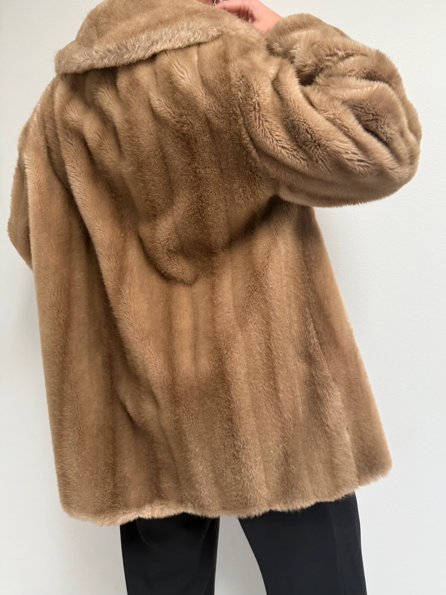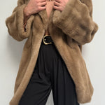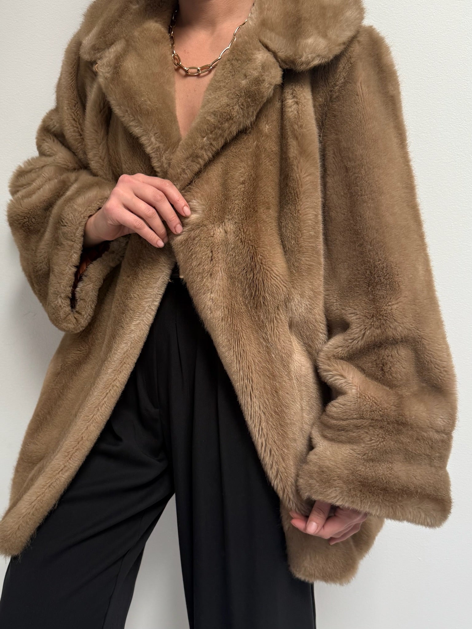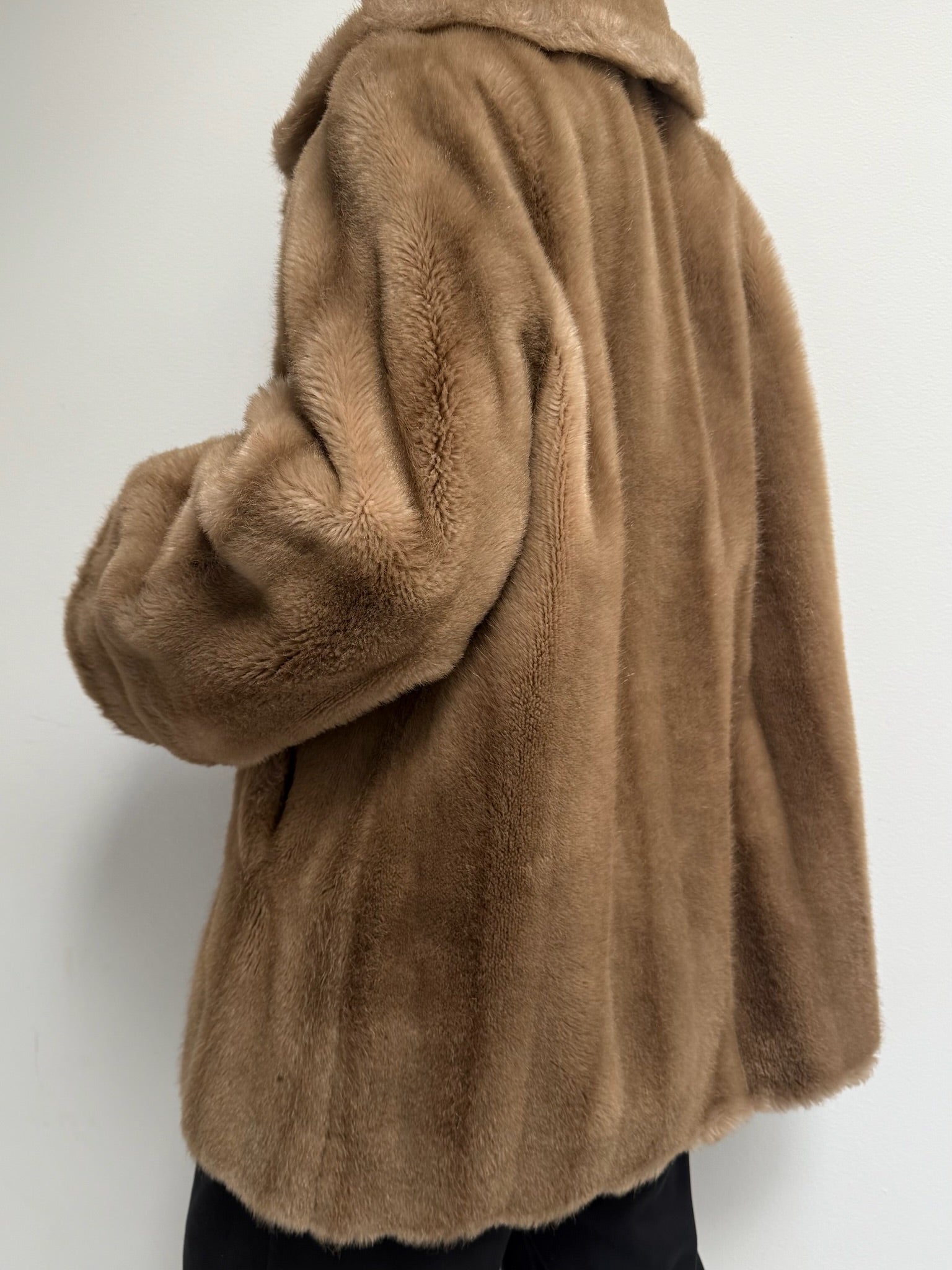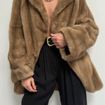 Absolutely stunning vintage coat in a luxury faux fur fabric with satin lining. Coat has an open front with a single hook closure below the collar, deep side pockets and a lovely, cozy drape. Includes an inner tie for a secure fit.