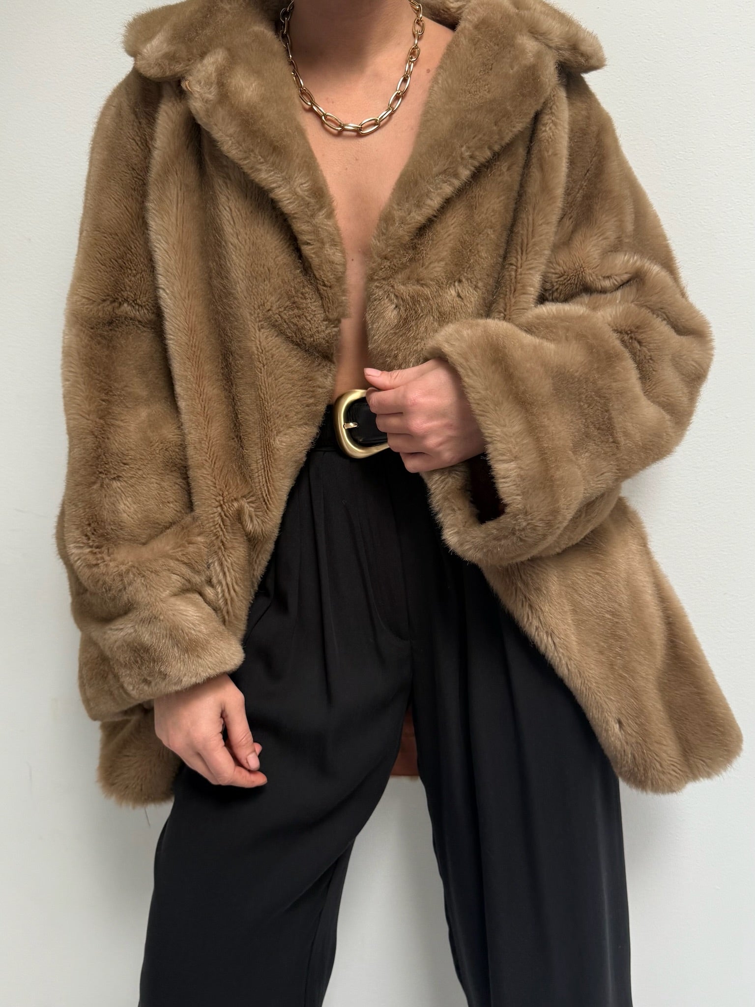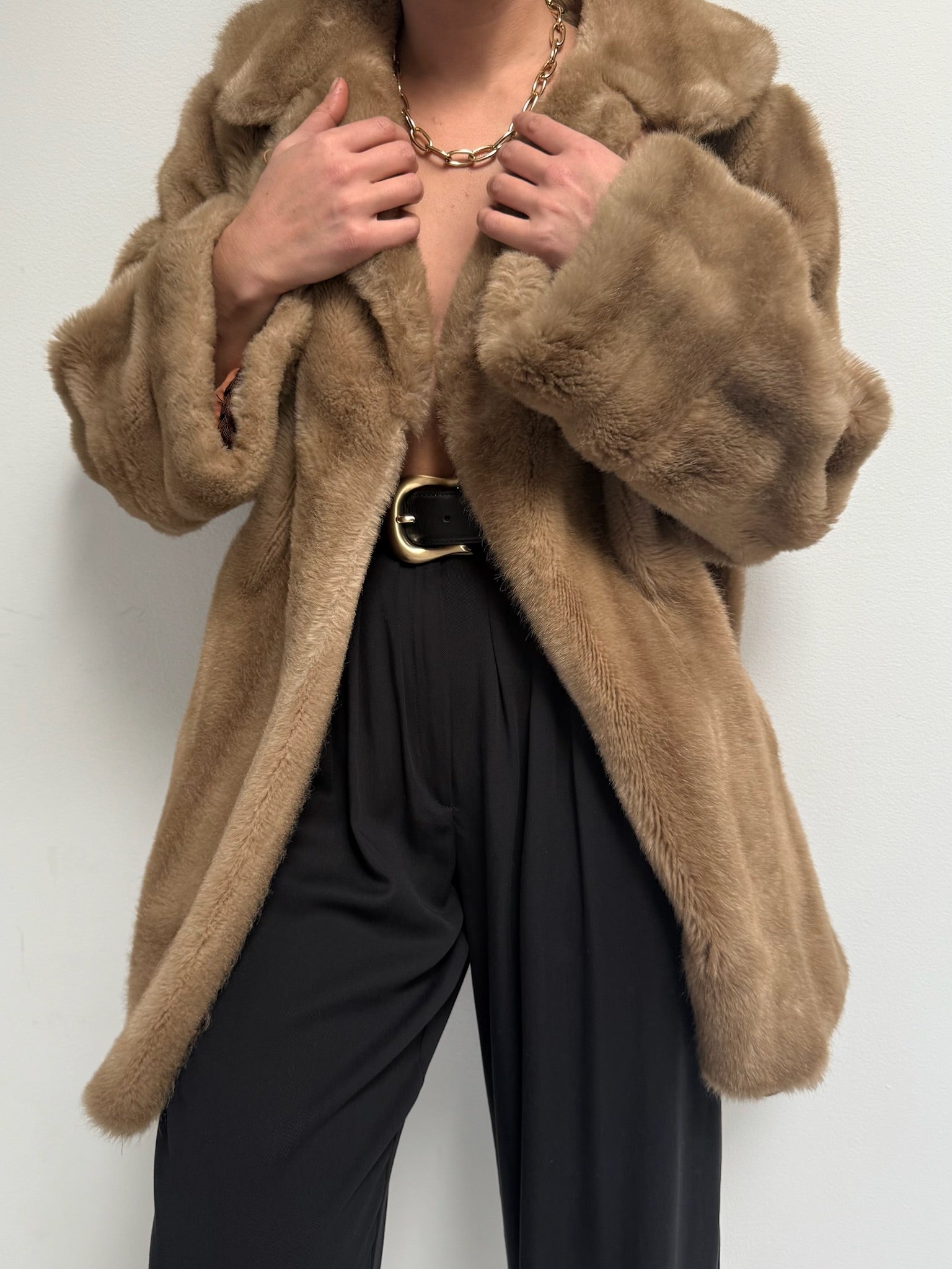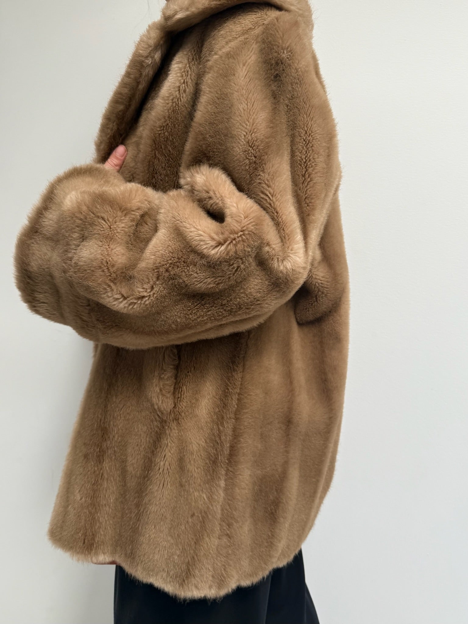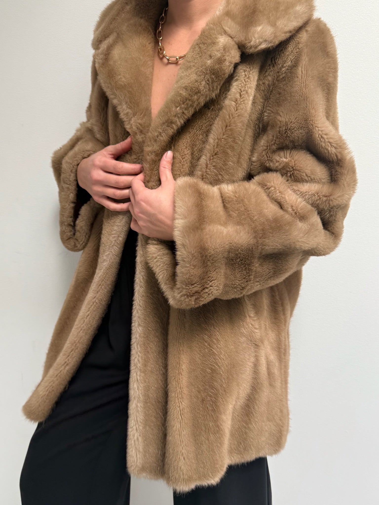 Absolutely stunning vintage coat in a luxury faux fur fabric with satin lining. Coat has an open front with a single hook closure below the collar, deep side pockets and a lovely, cozy drape. Includes an inner tie for a secure fit.