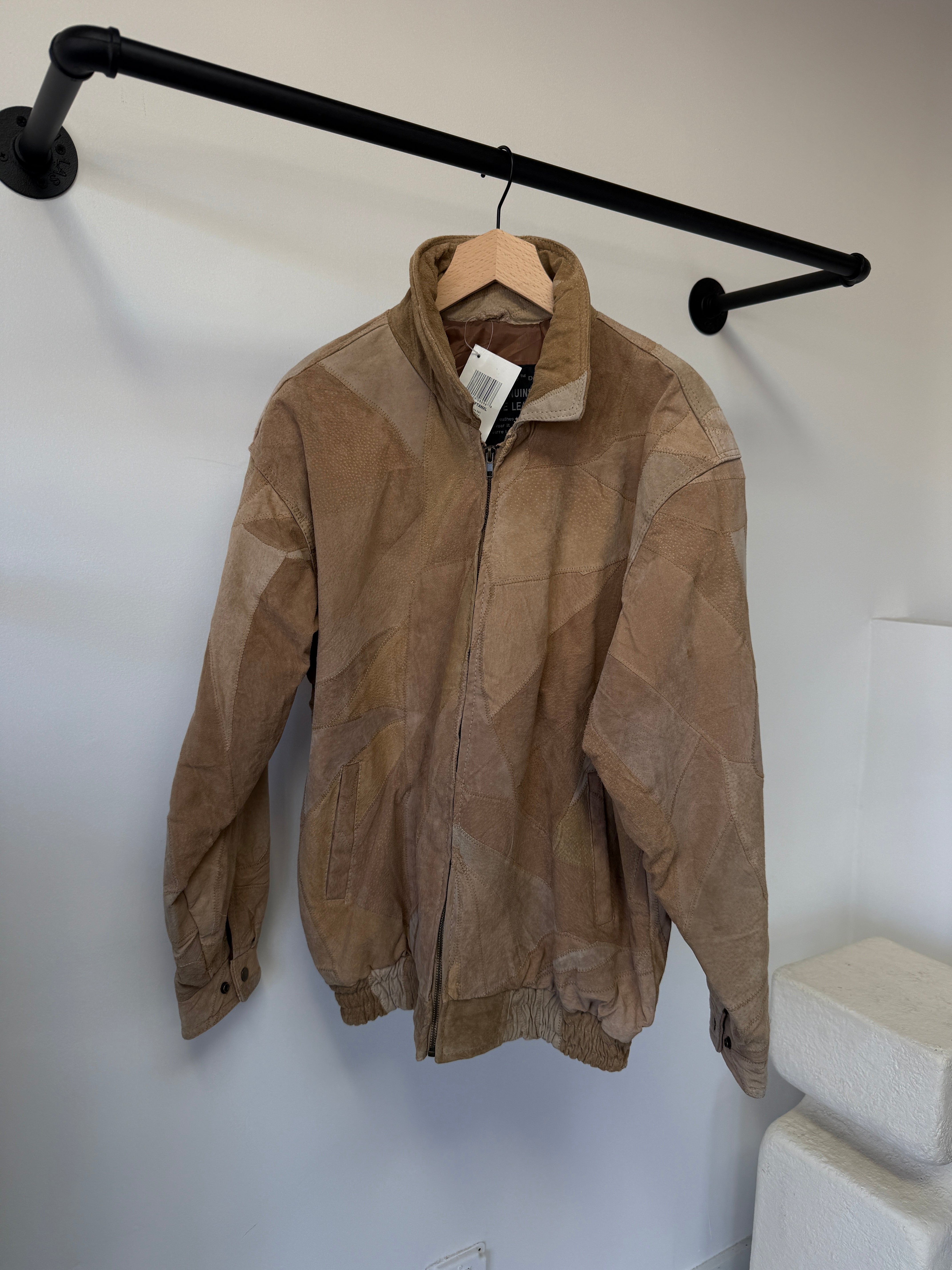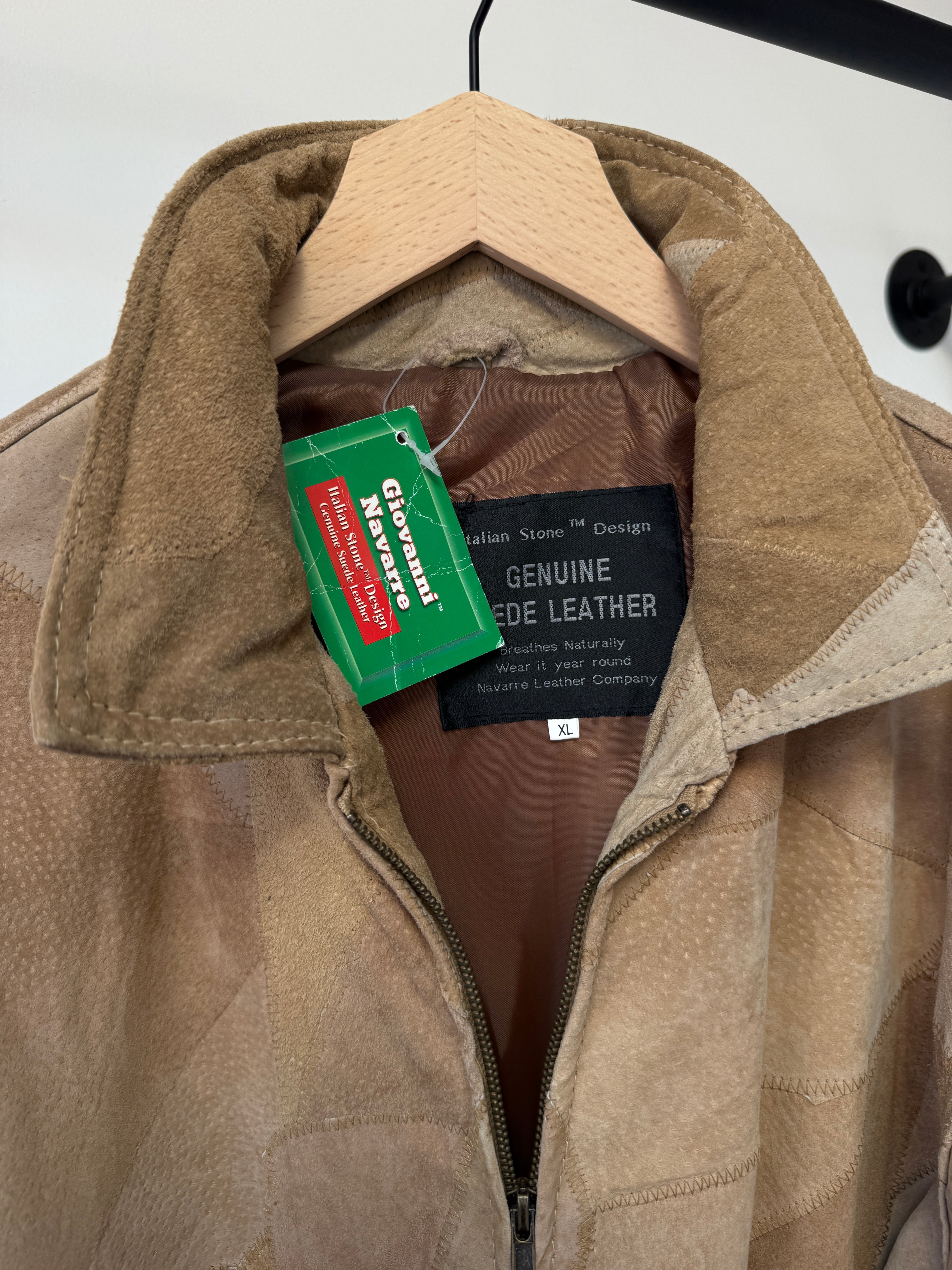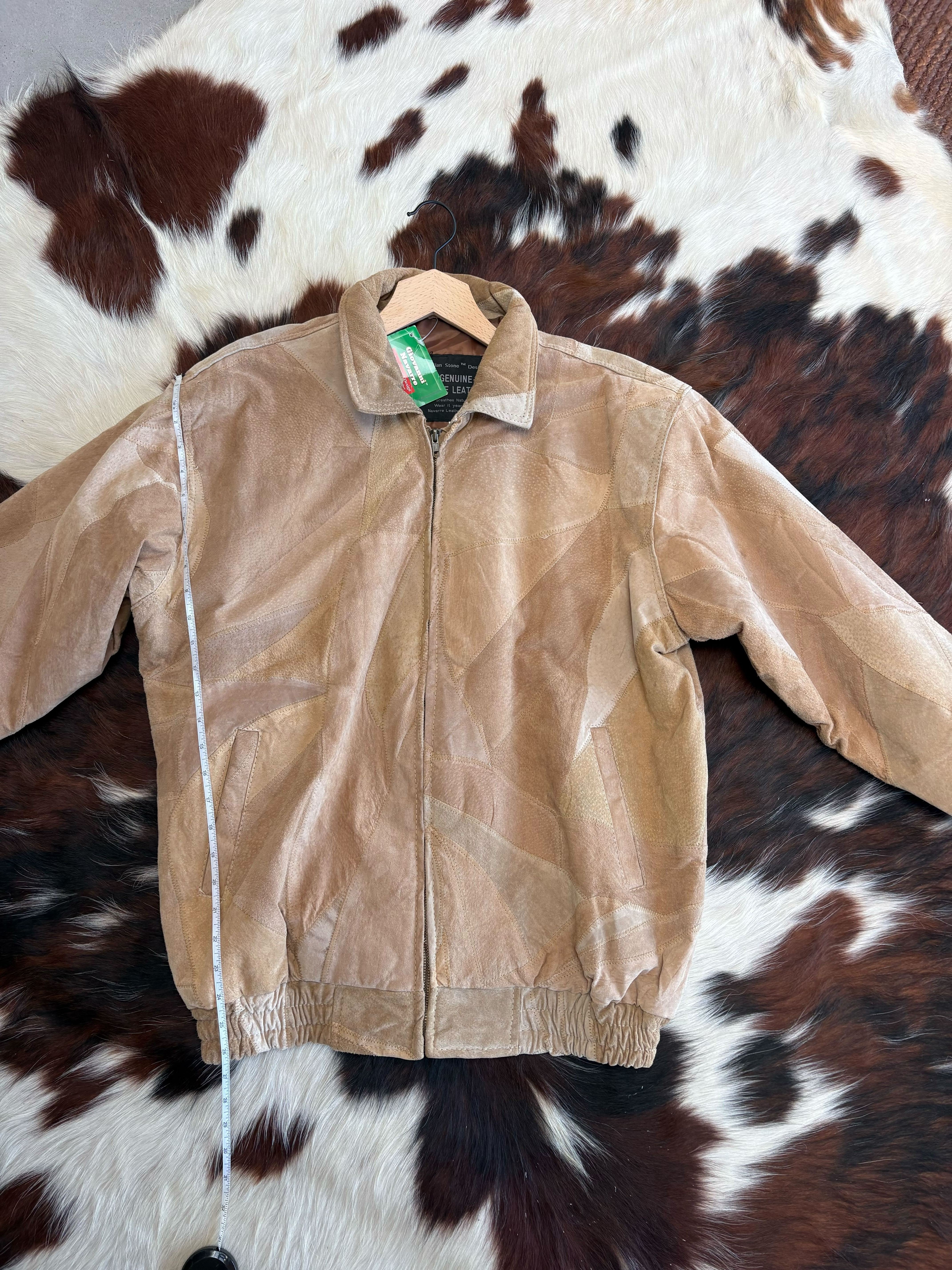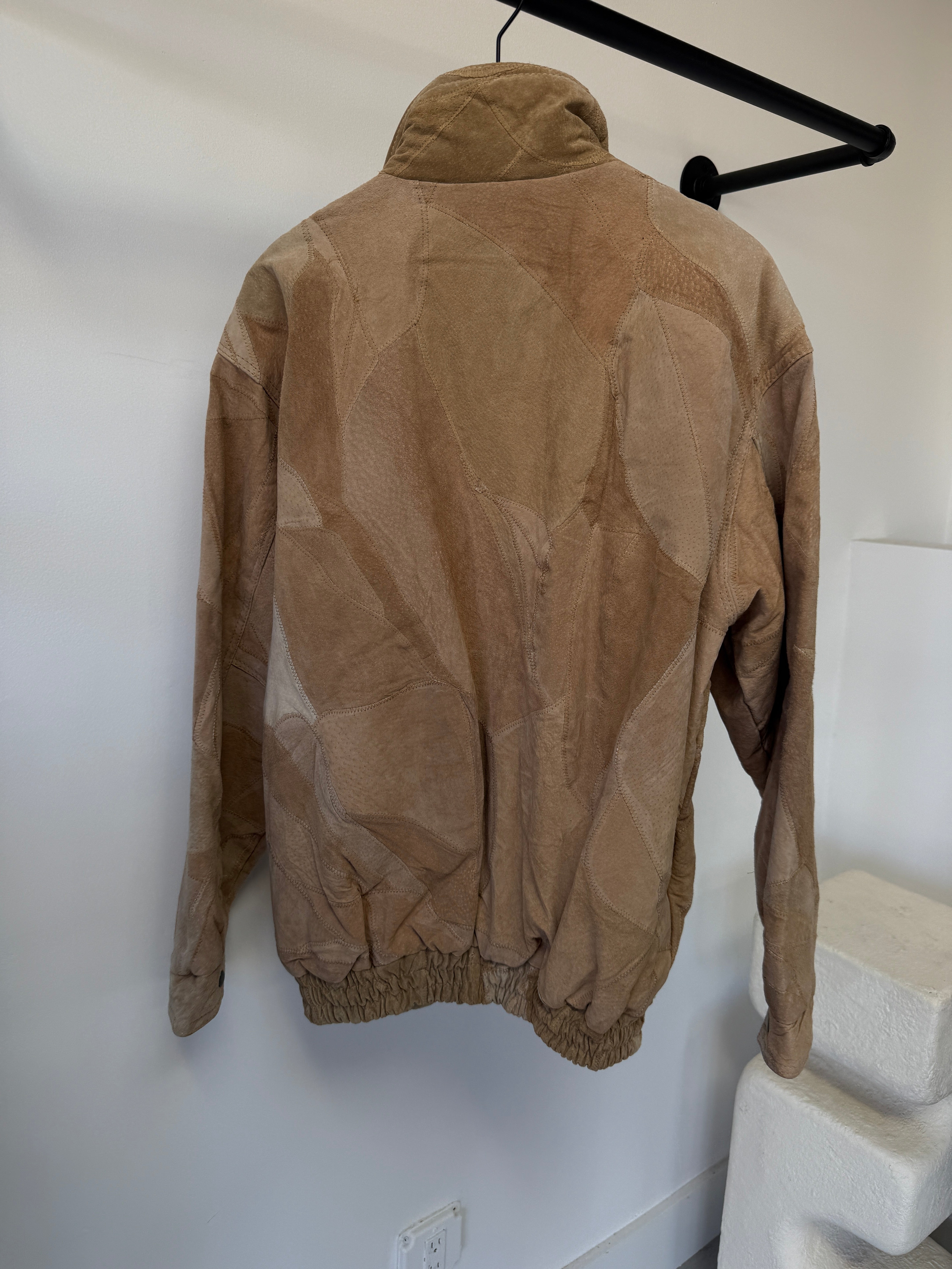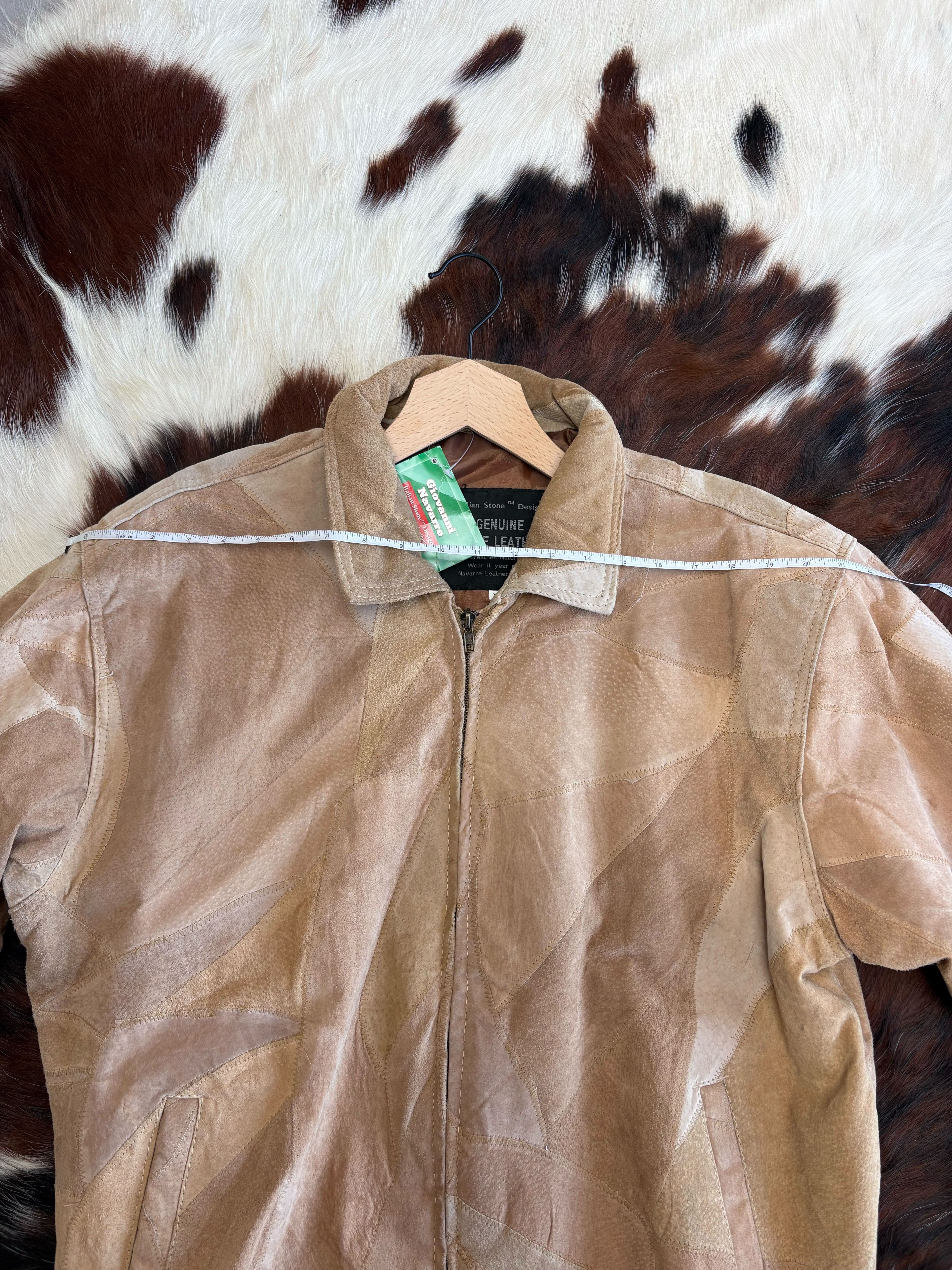 This vintage Giovanni Navarre bomber jacket features a distinctive patchwork design crafted from soft suede and leather panels in warm beige tones. The varied textures and natural grain of the leather give the jacket depth and dimension, creating the kind of character that only vintage materials can develop over time.