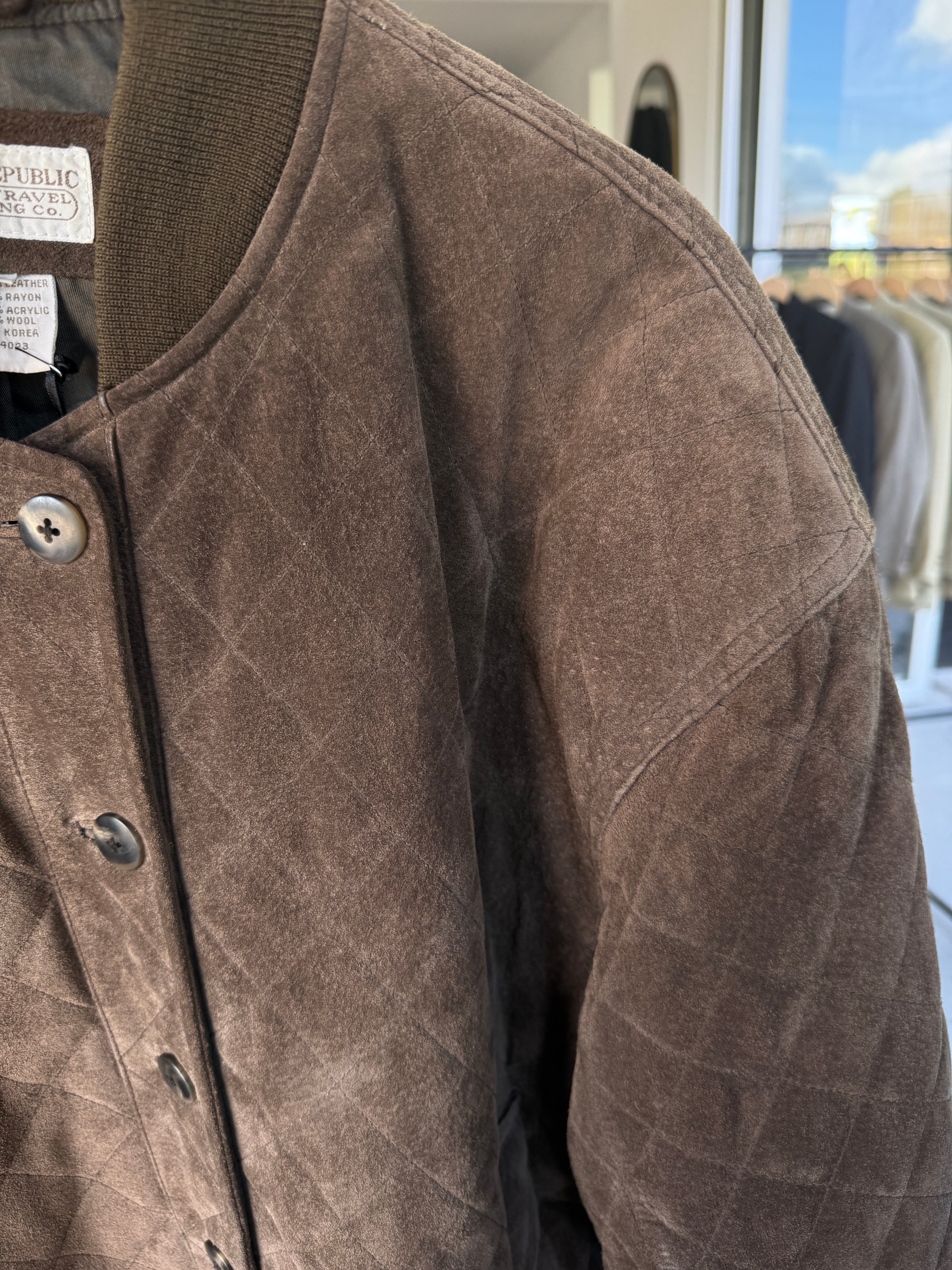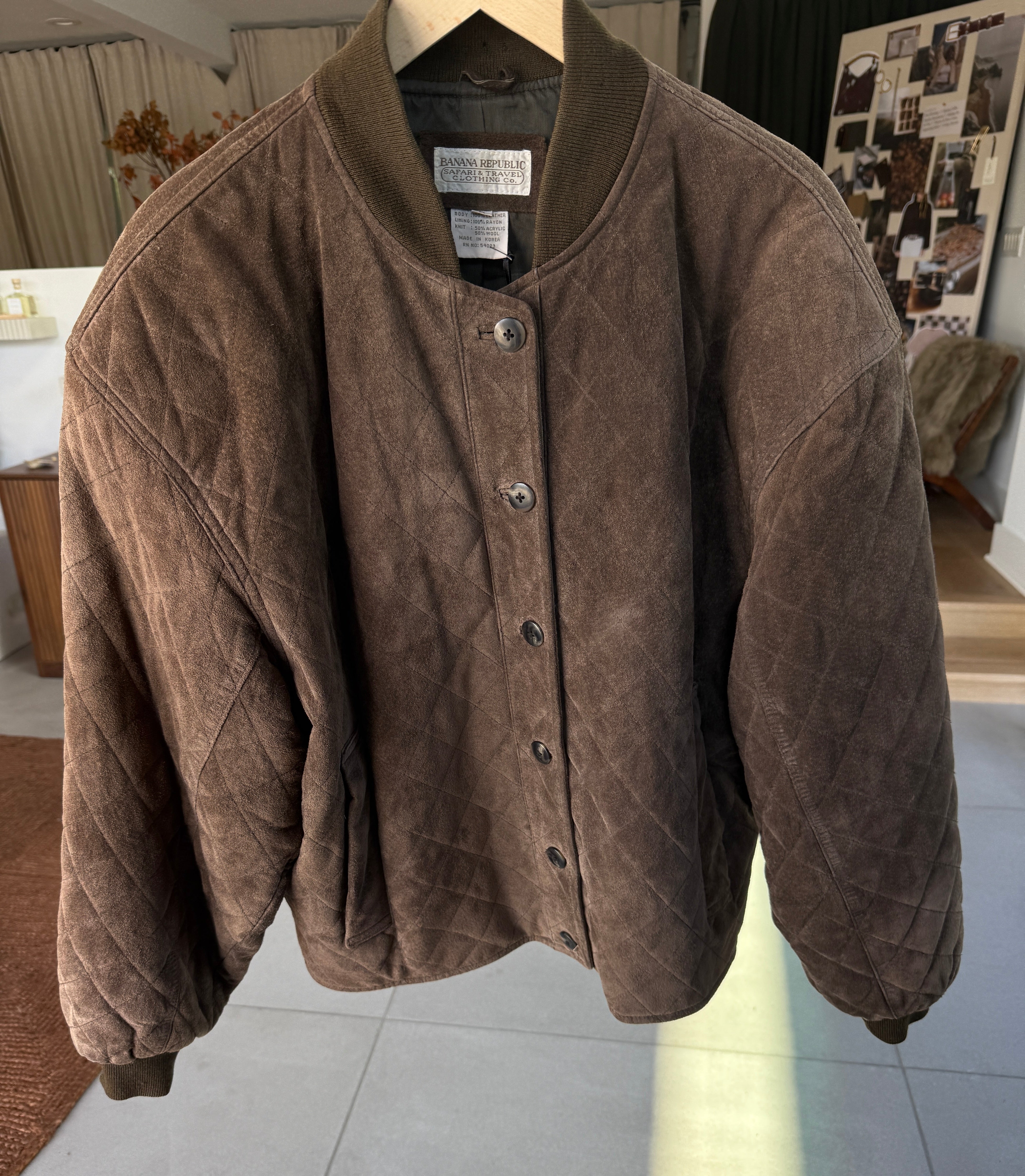 A piece of fashion history, thoughtfully preserved. This 1980s Banana Republic suede bomber hails from the brand’s original expedition era—when utility, craftsmanship, and understated adventure defined the aesthetic. Cut from rich, chocolate-brown suede with a beautifully worn-in patina, it carries the kind of character that only decades of life can create.