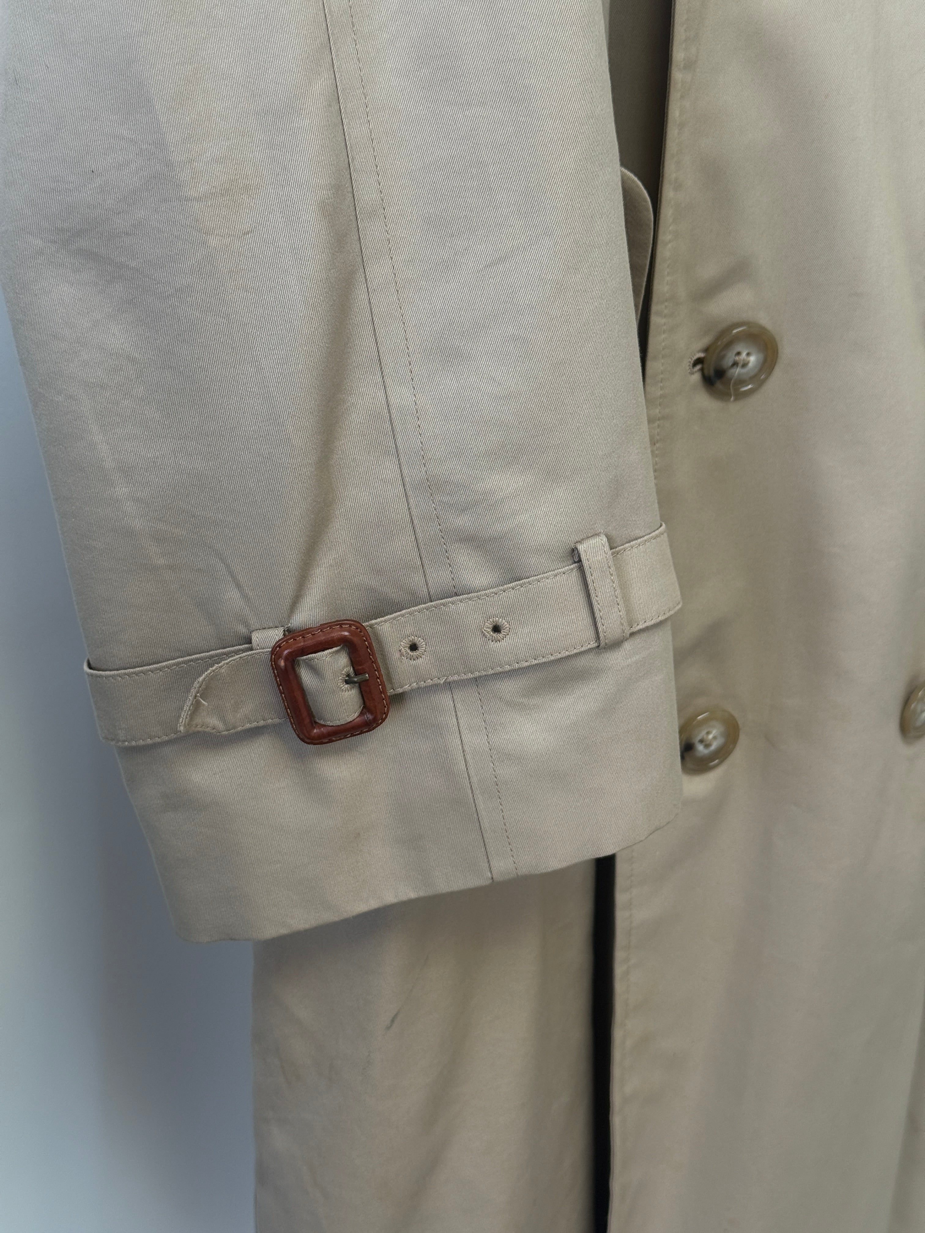 This vintage Baracuta trench coat is a true wardrobe staple, featuring the iconic double-breasted silhouette and thoughtful detailing that defines a traditional trench. Crafted in a warm sand-khaki cotton twill, the coat includes epaulettes, storm flaps, adjustable cuff straps, and a belted waist with classic D-ring hardware.