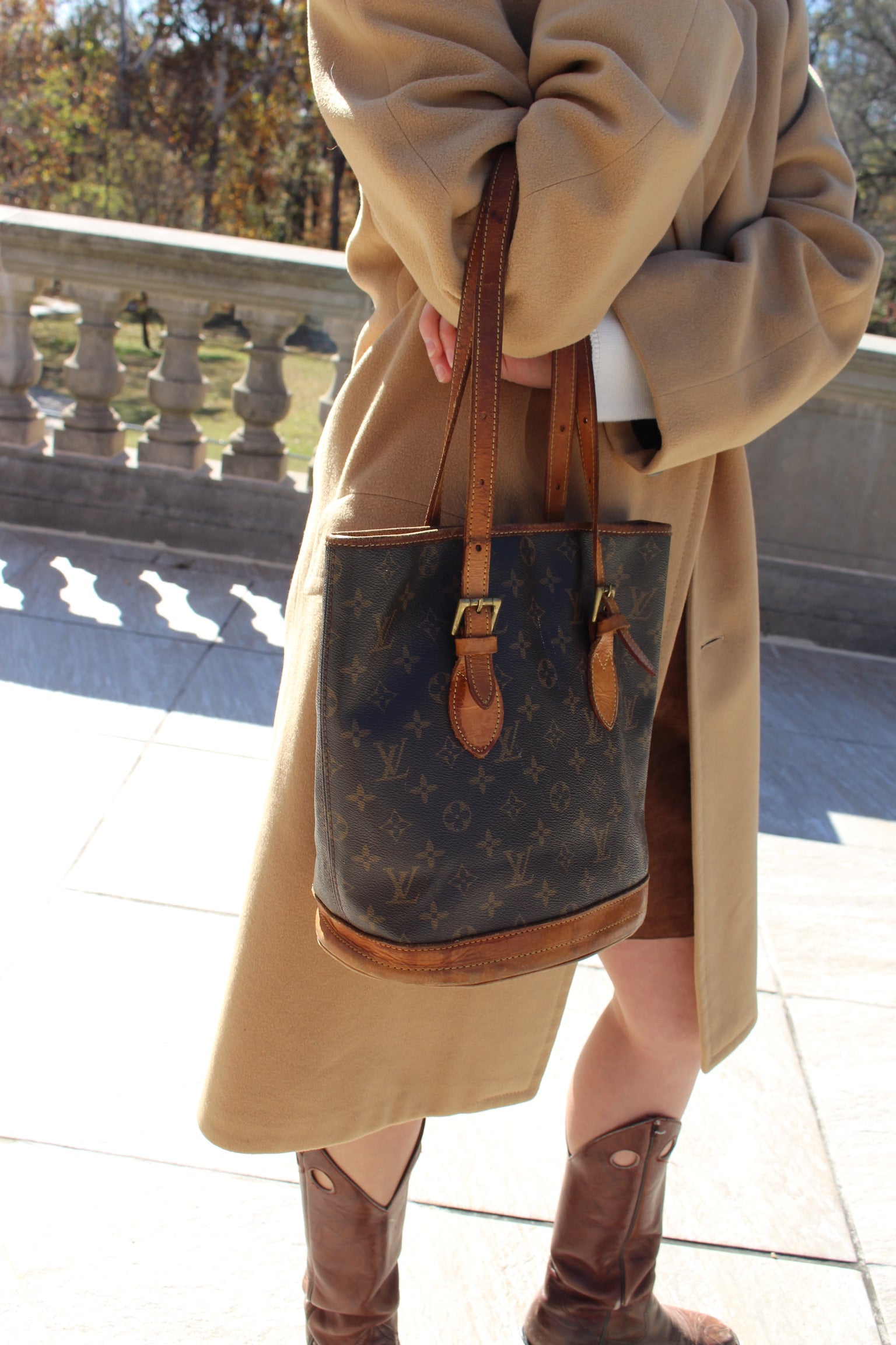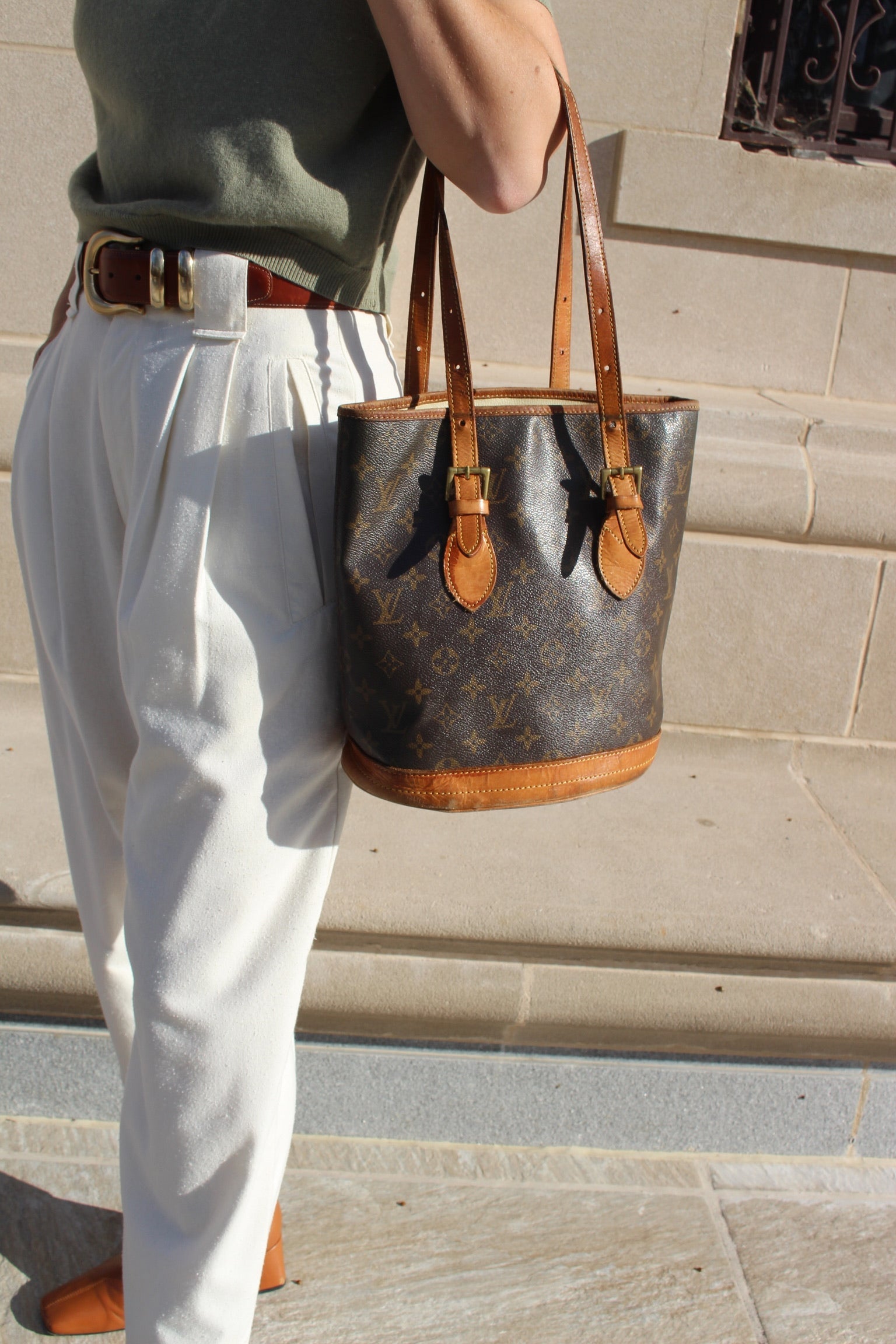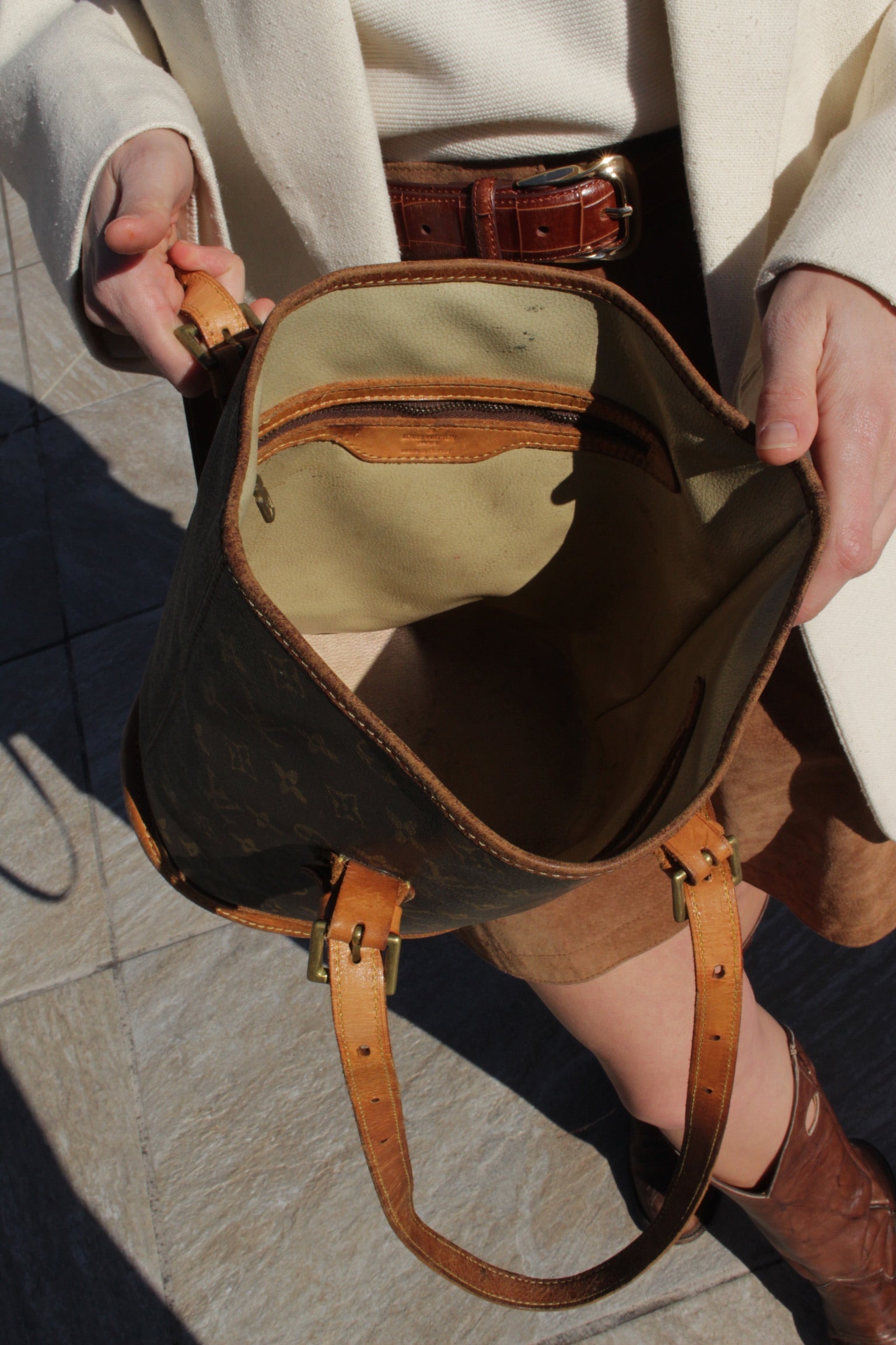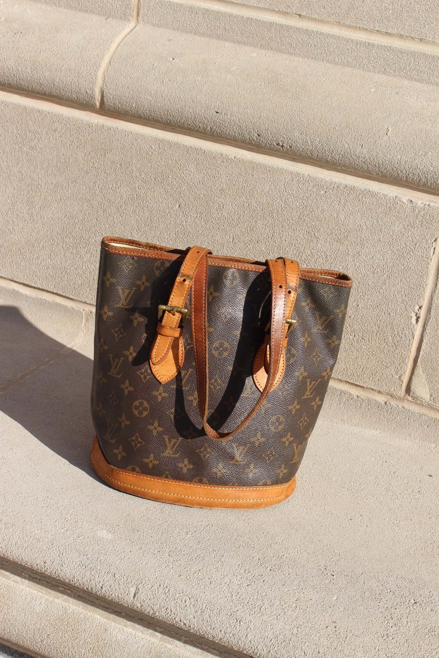A rare yet classic vintage style by Louis Vuitton! This bucket bag has the signature LV monogram print throughout the body canvs. Features saddle-brown leather trim, adjustable straps and a flat structured base.