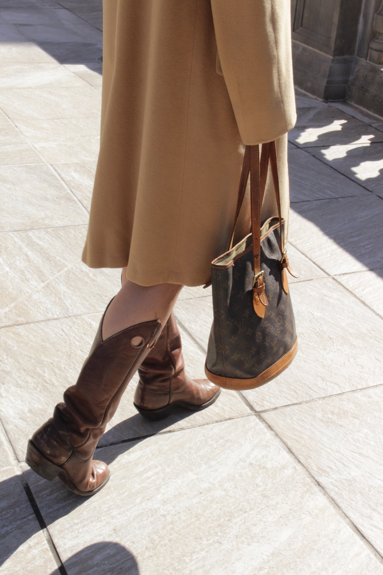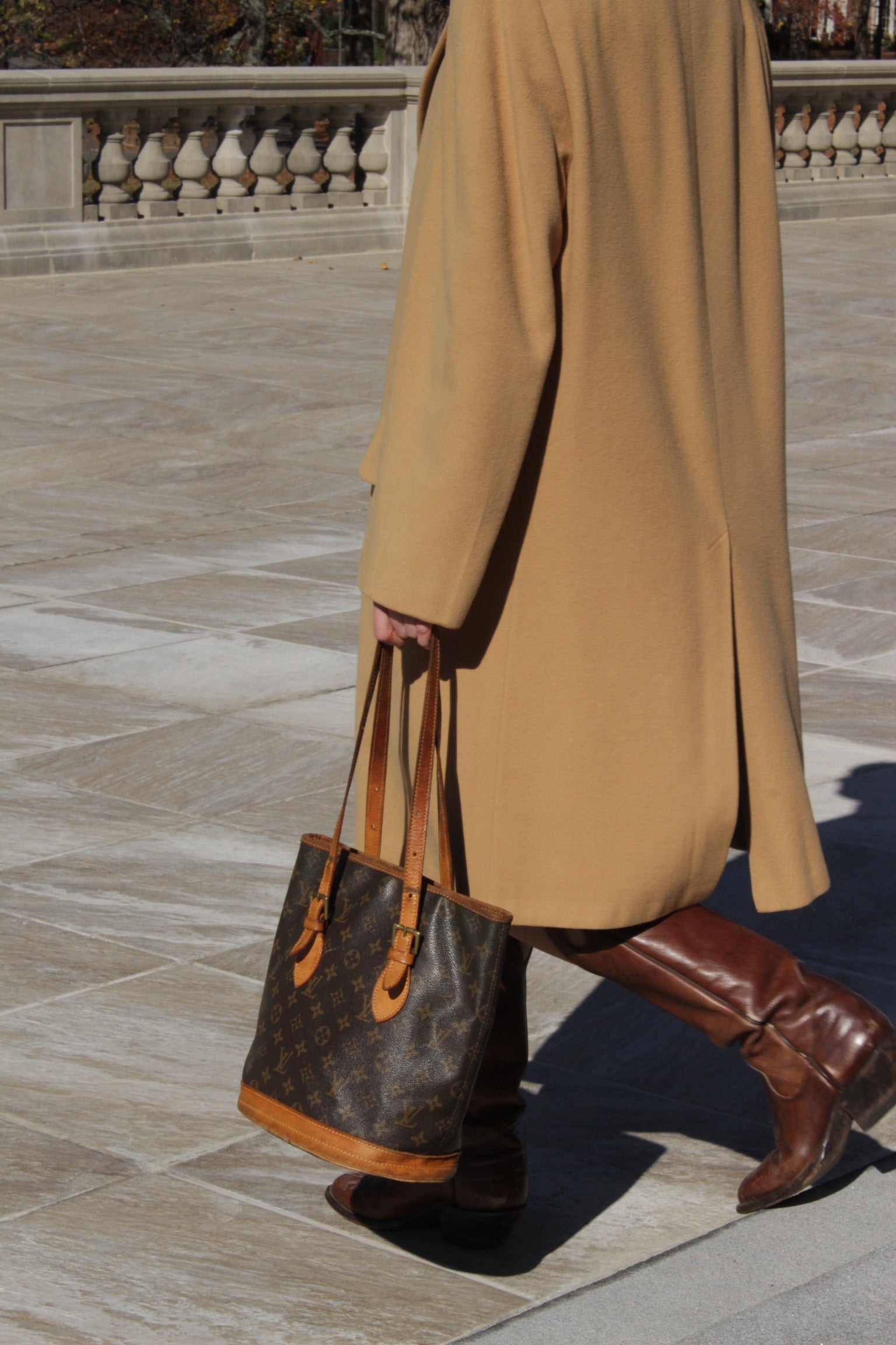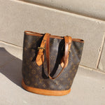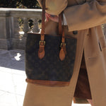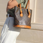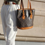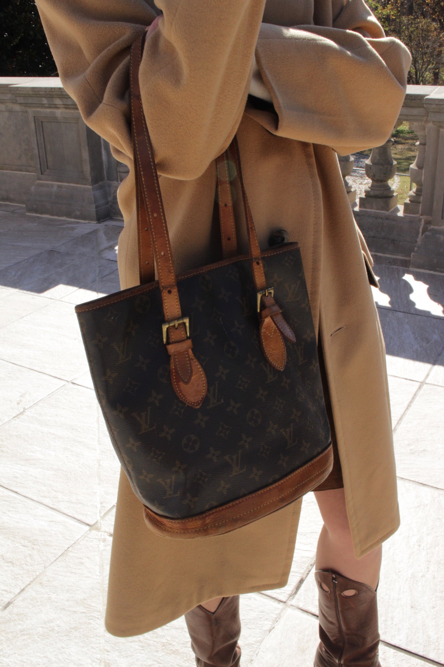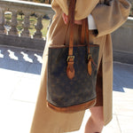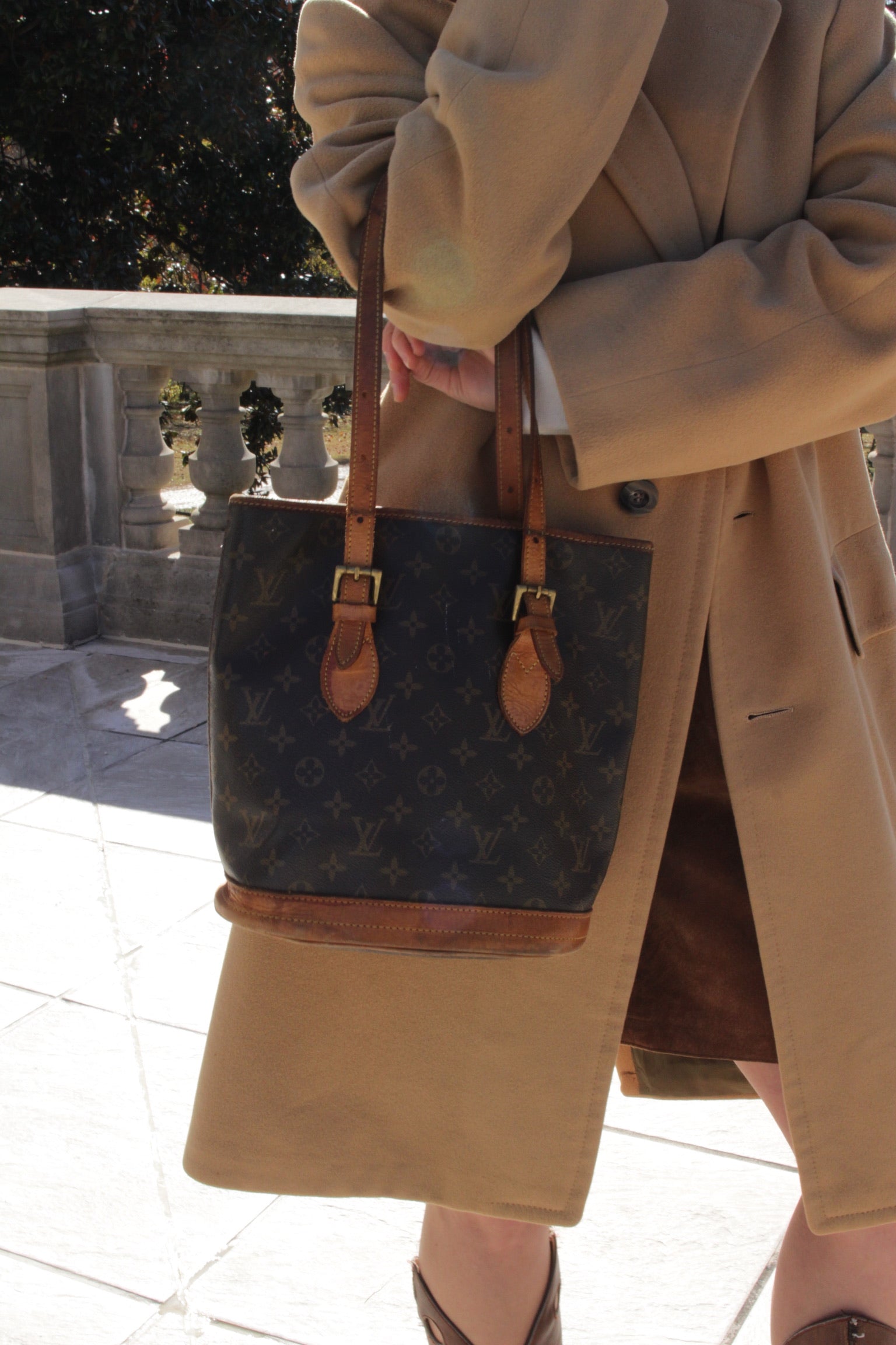 A rare yet classic vintage style by Louis Vuitton! This bucket bag has the signature LV monogram print throughout the body canvs. Features saddle-brown leather trim, adjustable straps and a flat structured base.