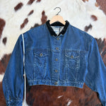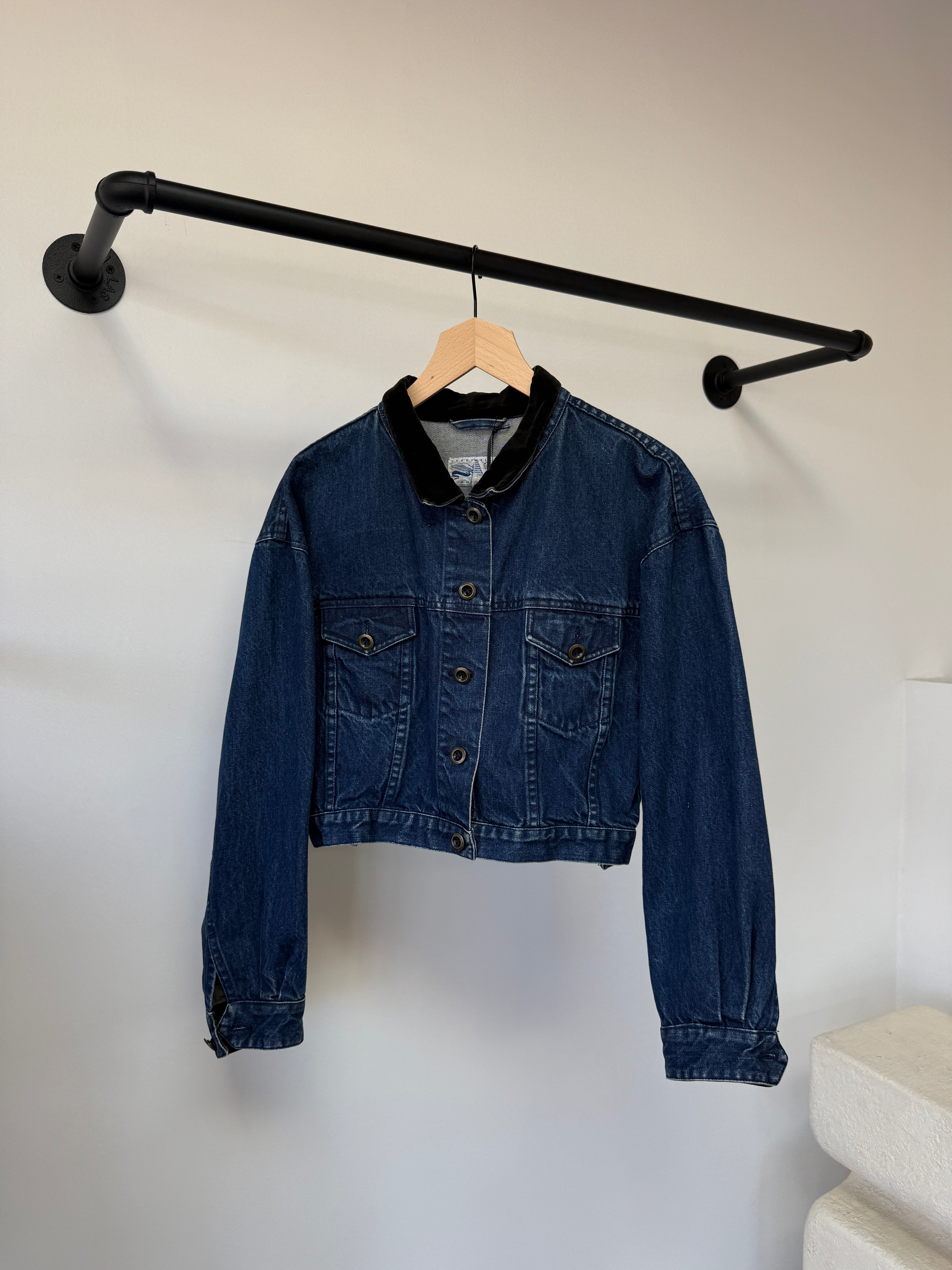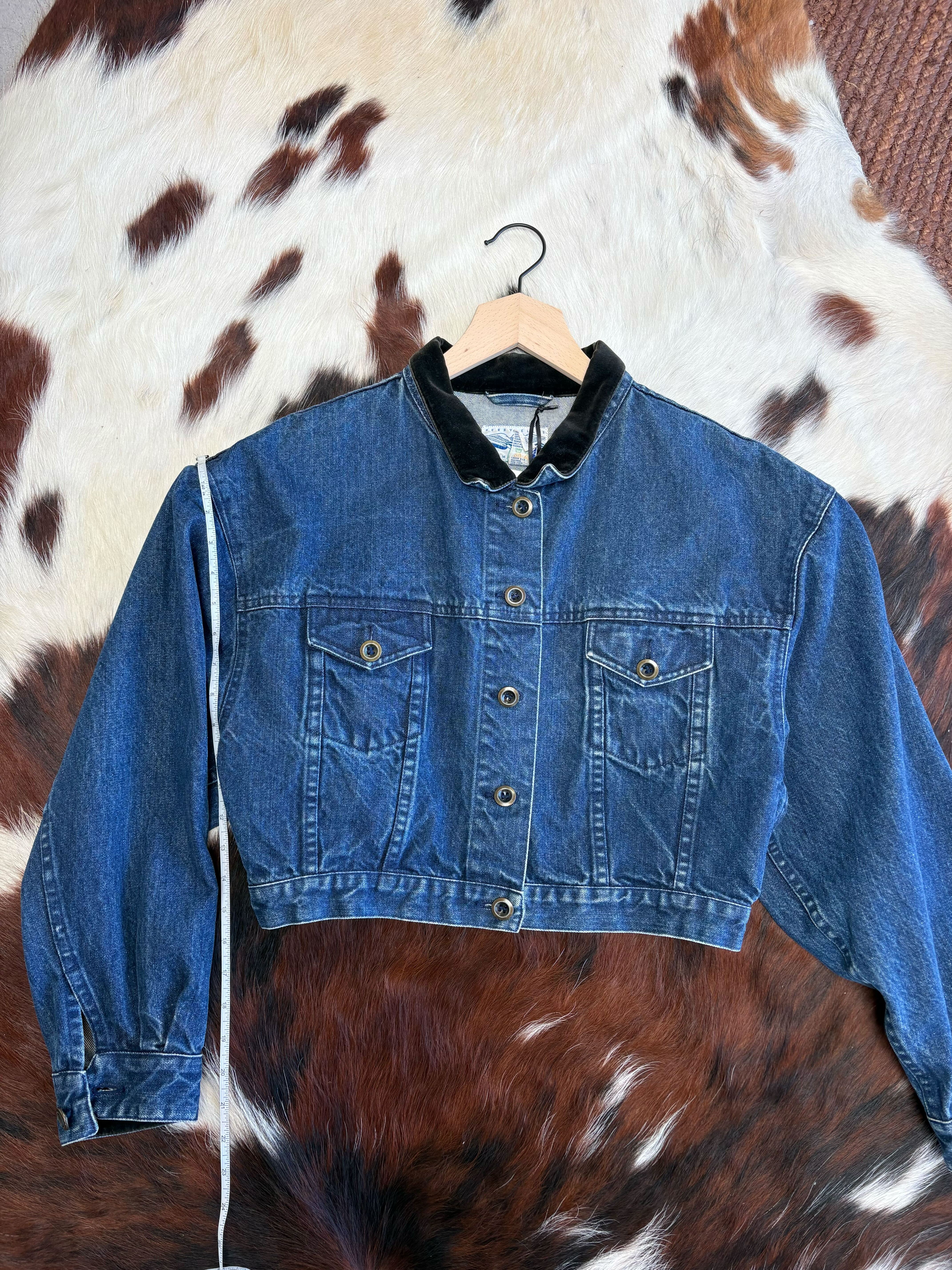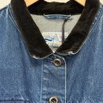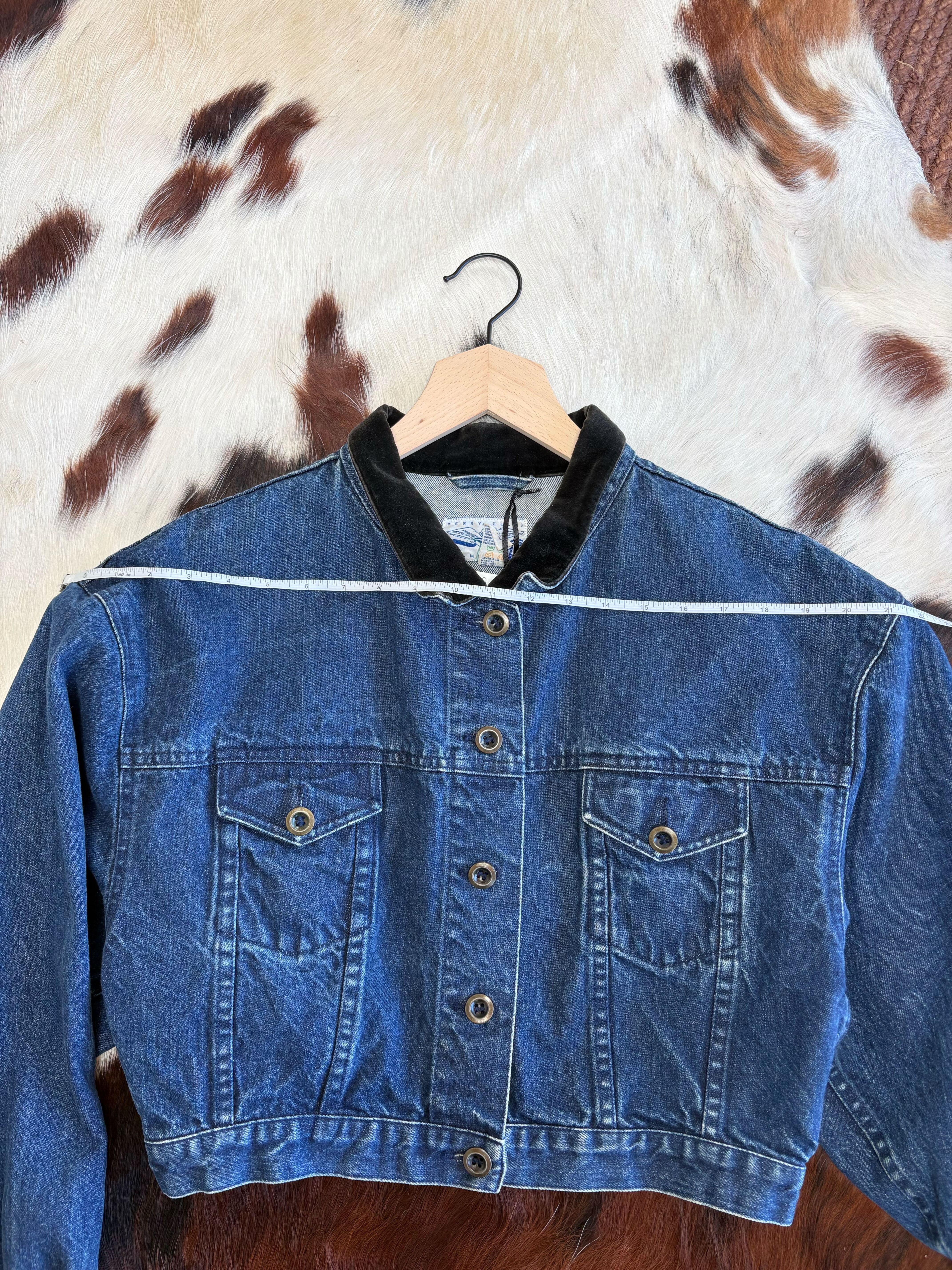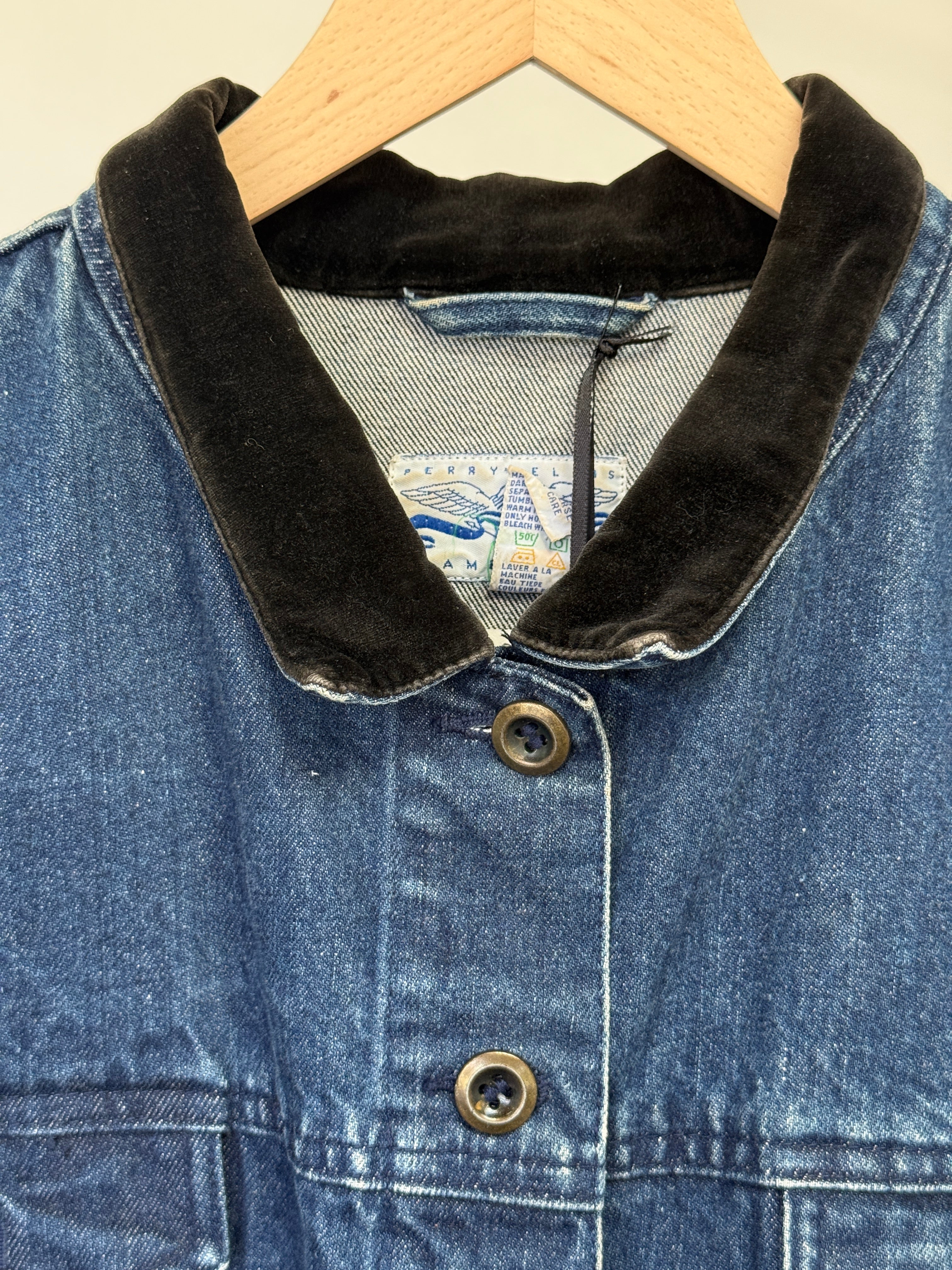 Originally produced in the late 1980s to early 1990s, it captures the thoughtful tailoring Perry Ellis was known for during that era. The velvet collar adds a refined touch while the classic denim construction keeps it easy and wearable.