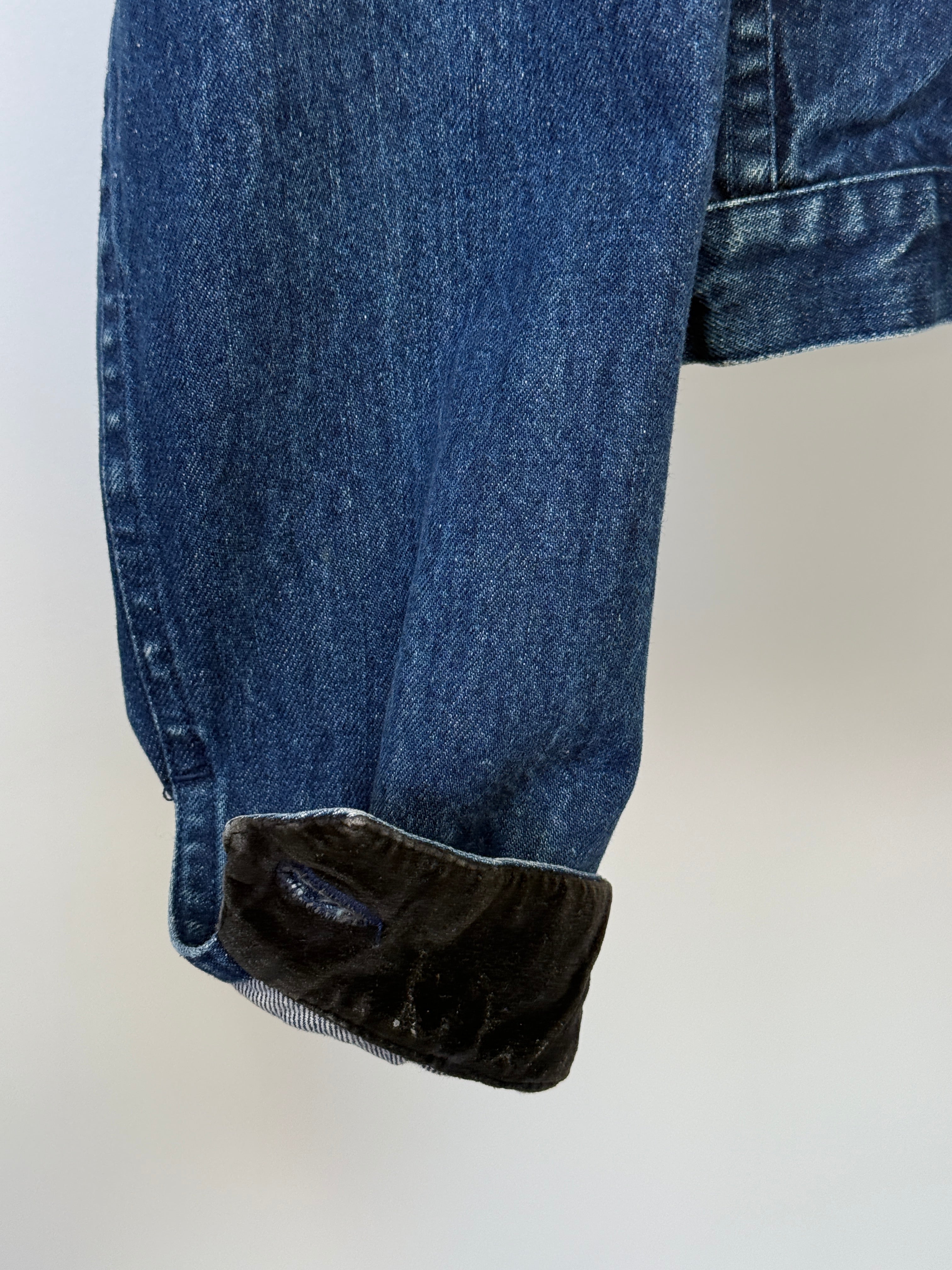 Vintage condition with natural wear consistent with age. The denim and velvet show subtle fading that adds to the character and authenticity of the piece.