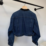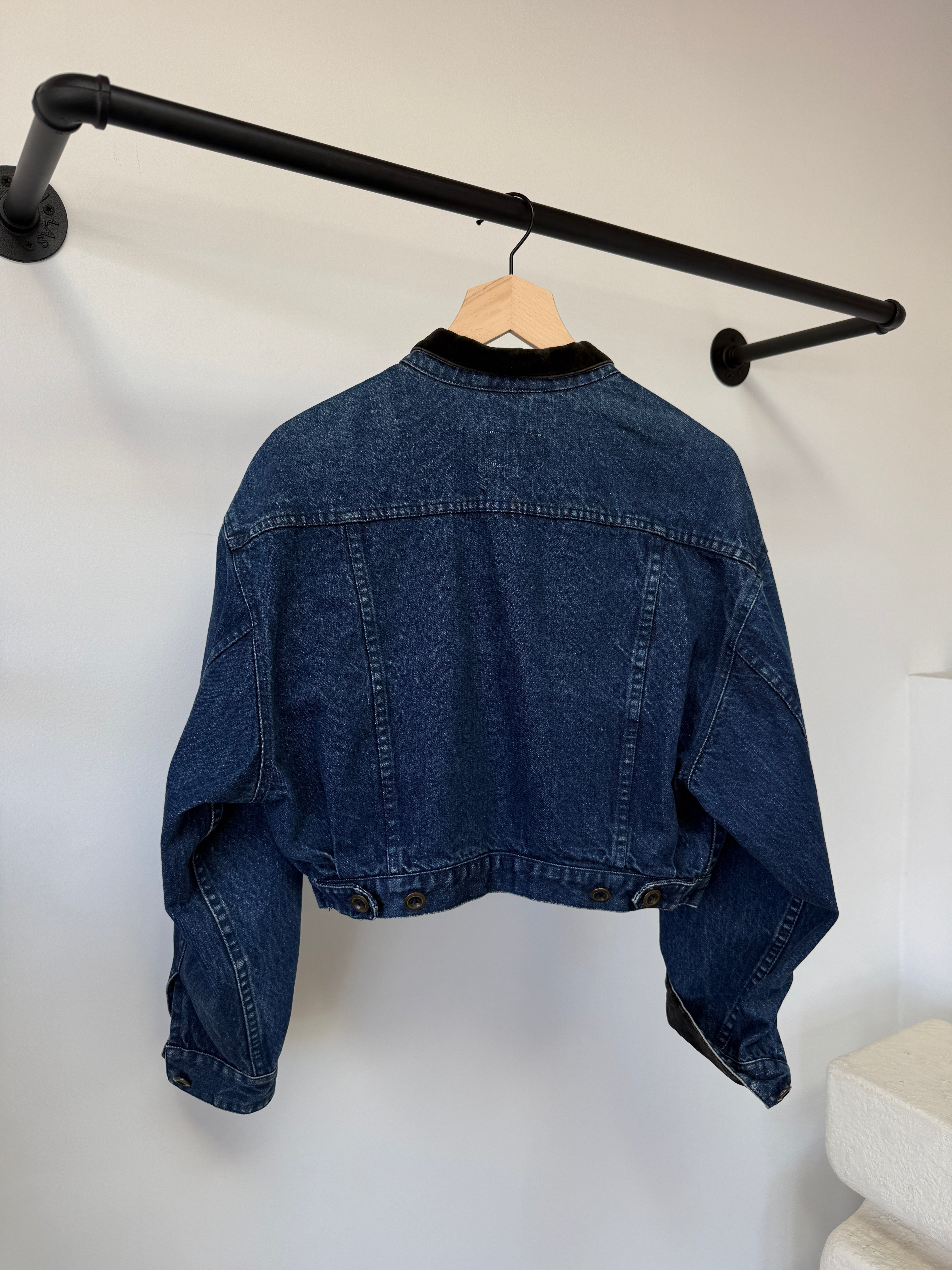 This vintage Perry Ellis jacket features rich indigo denim paired with a soft velvet collar and cuffs for a subtle contrast in texture. The cropped silhouette and structured shape give it that perfectly balanced proportion — designed to sit just at the waist and layer effortlessly over high-rise denim or trousers.